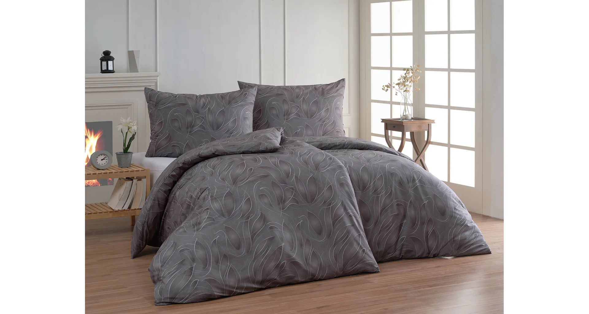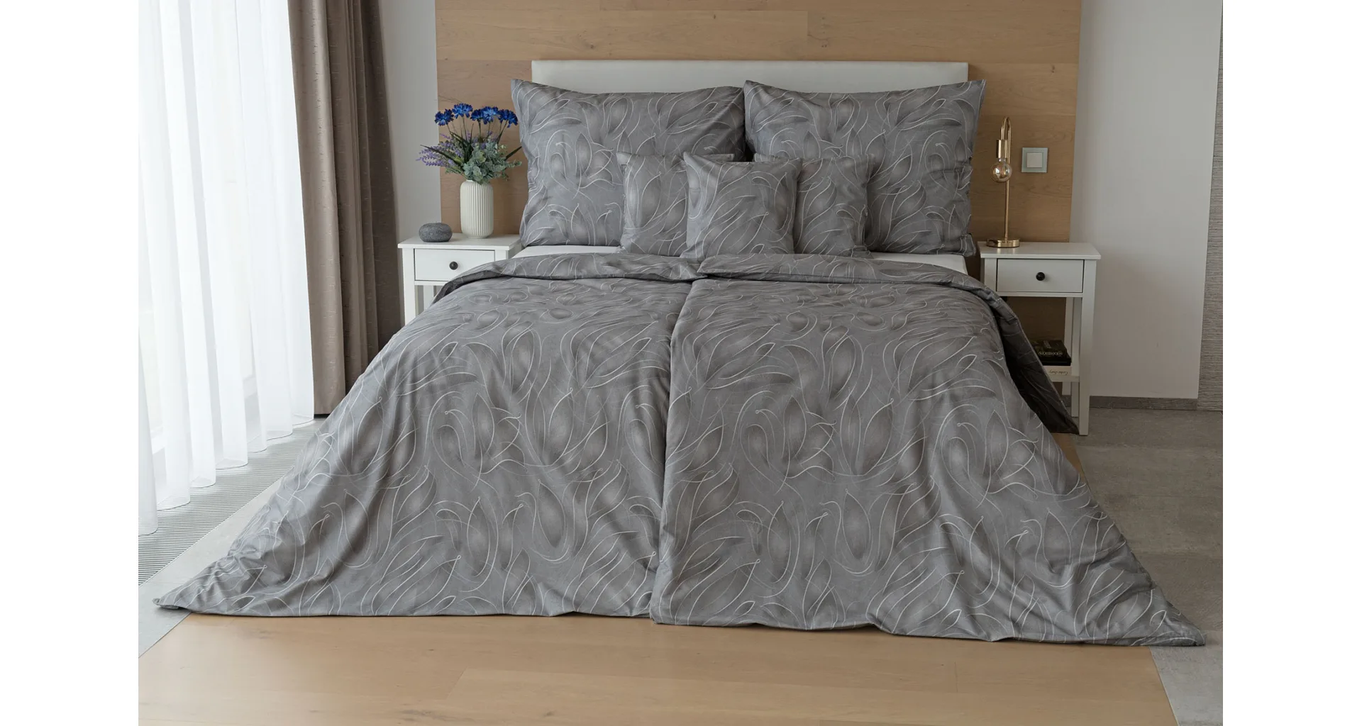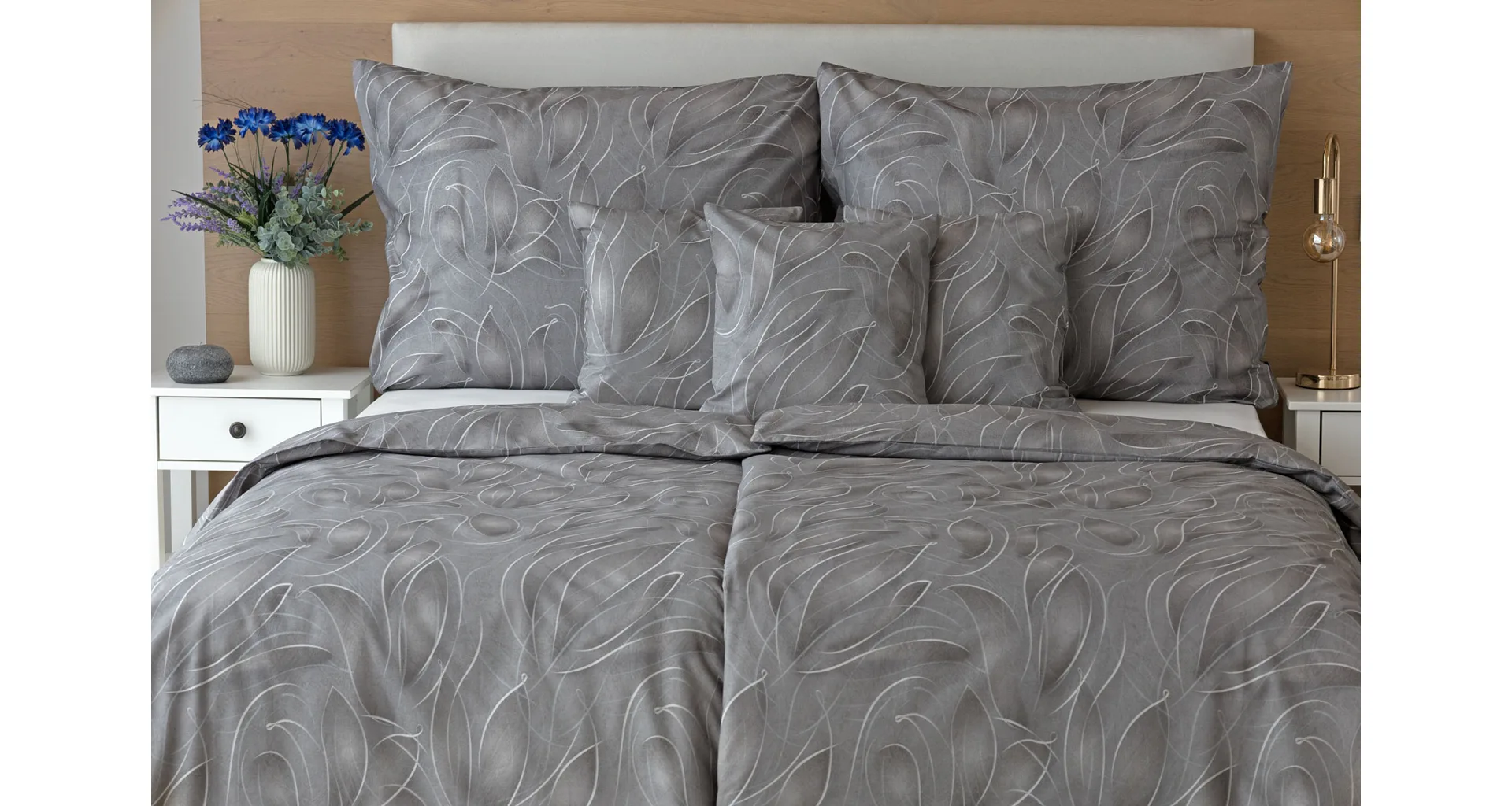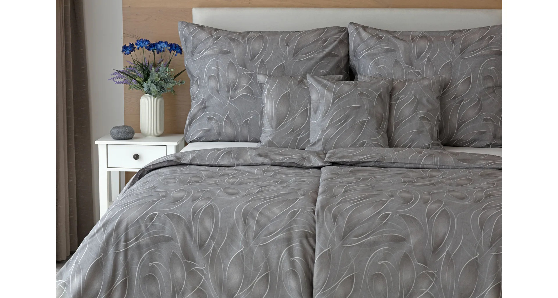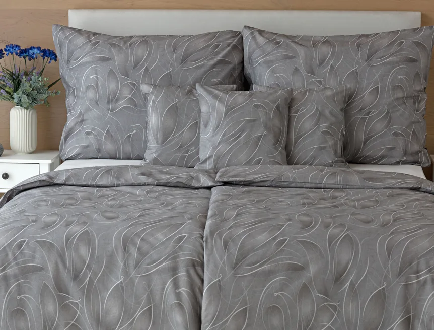 S bavlnenými obliečkami Adeline bude vaša spálňa elegantná a vždy dokonalá. Svetlé kontúry decentného lístkového vzoru vynikajú na antracitovo šedom podklade. Celý vzor podtrháva dômyselné tieňovanie, o ktoré sa postarala najmodernejšia digitálna tlačová technológia.