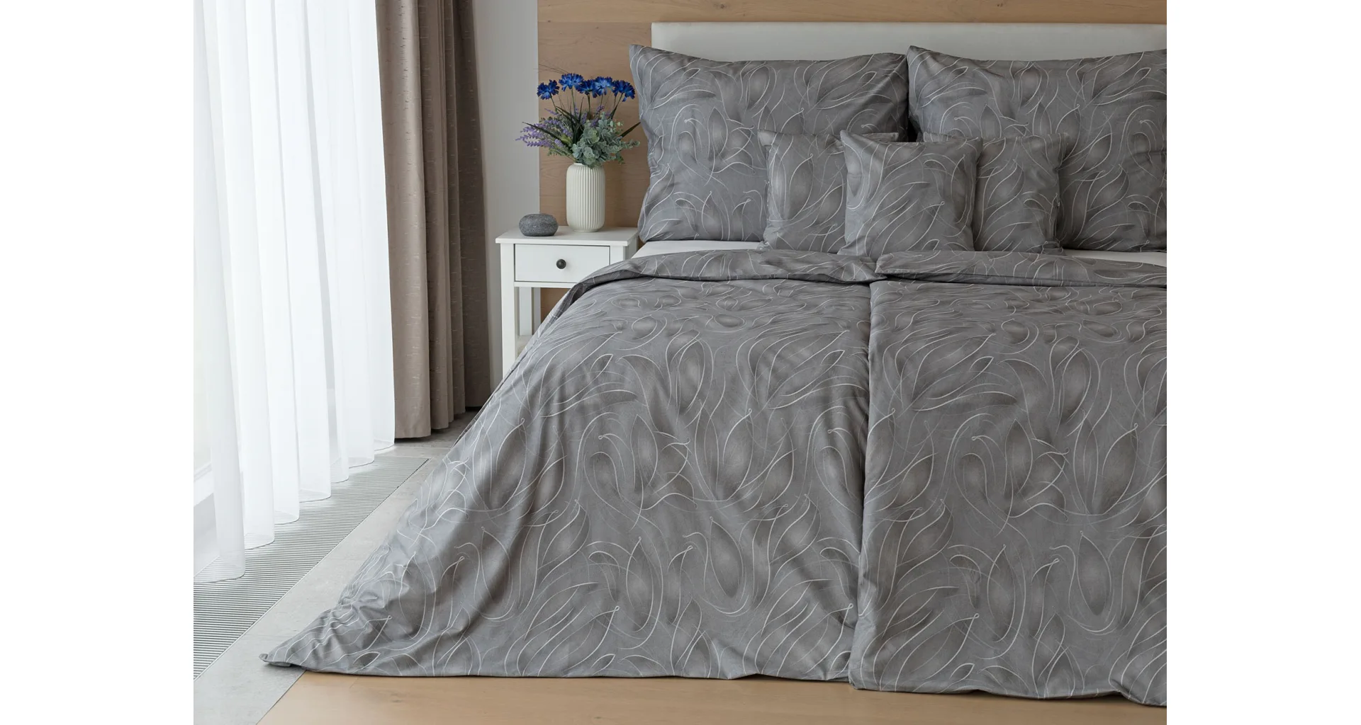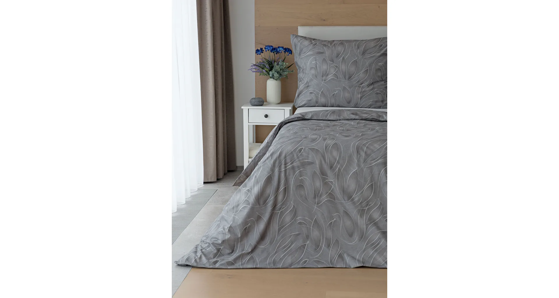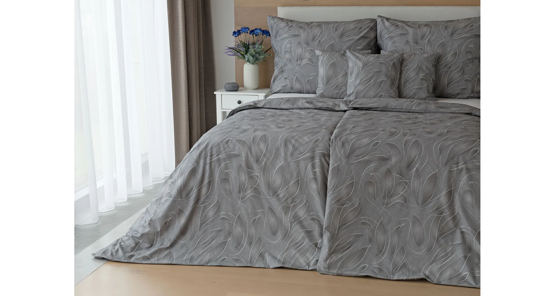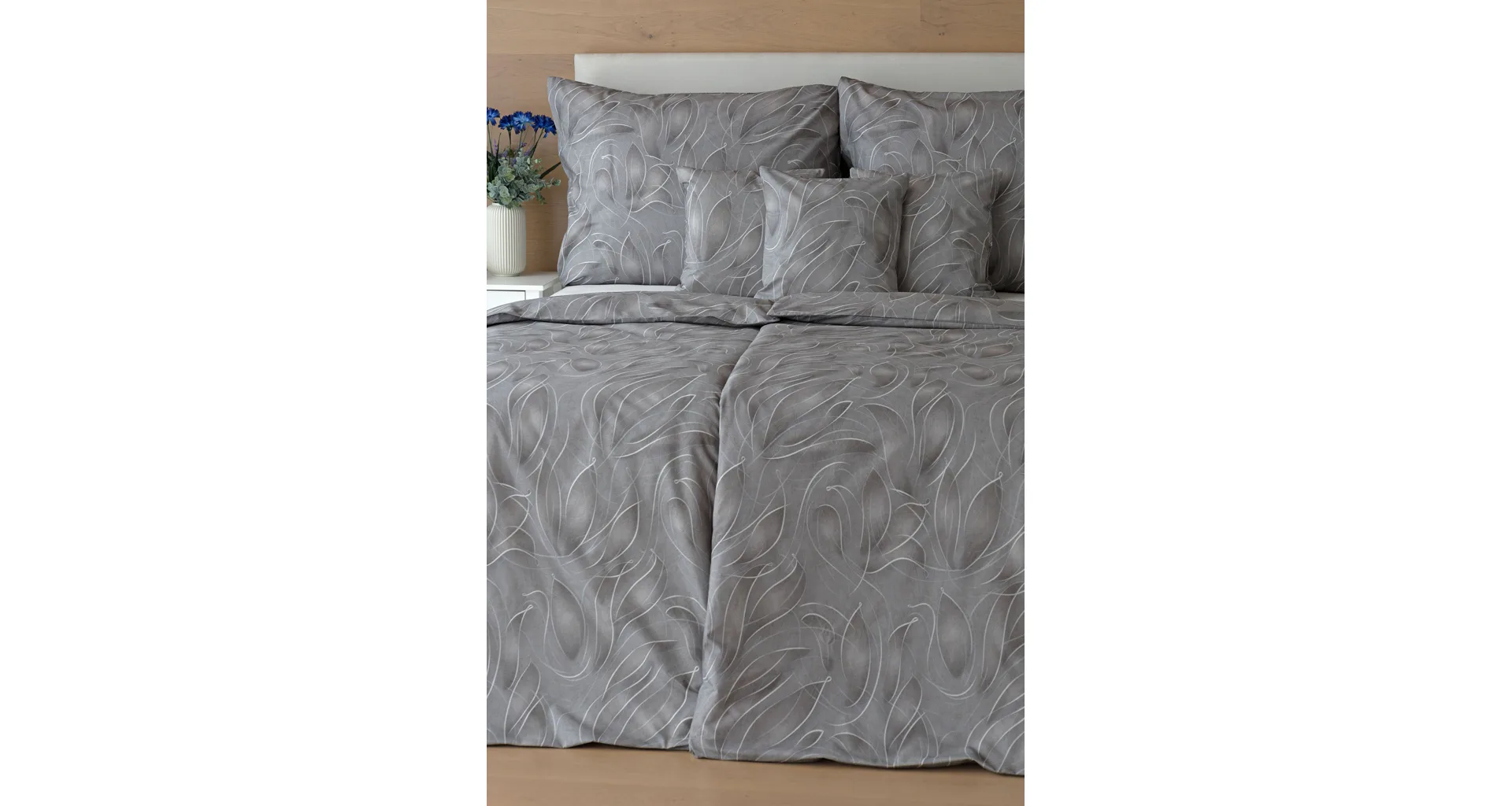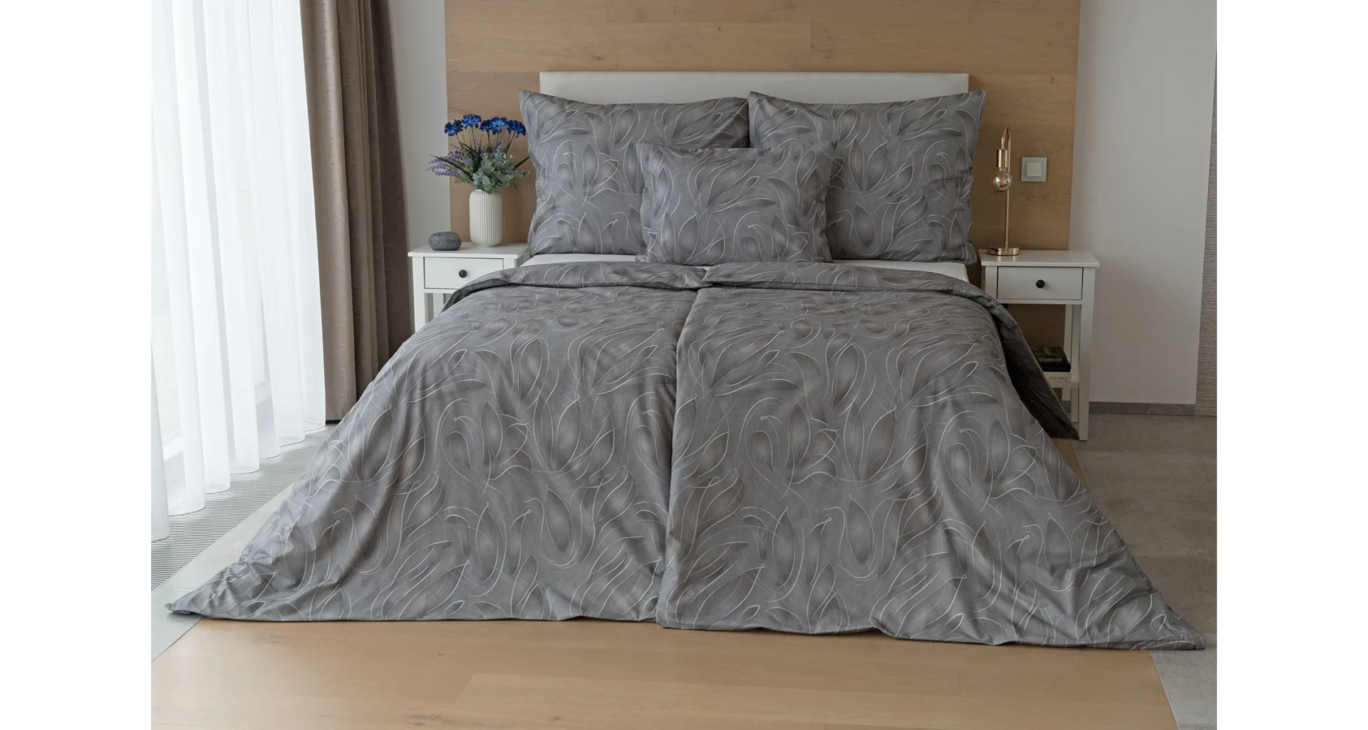 S bavlnenými obliečkami Adeline bude vaša spálňa elegantná a vždy dokonalá. Svetlé kontúry decentného lístkového vzoru vynikajú na antracitovo šedom podklade. Celý vzor podtrháva dômyselné tieňovanie, o ktoré sa postarala najmodernejšia digitálna tlačová technológia.