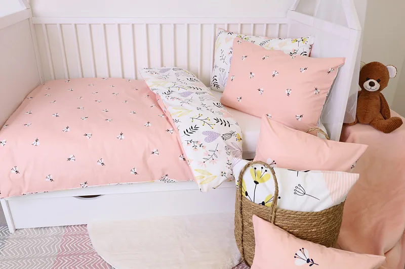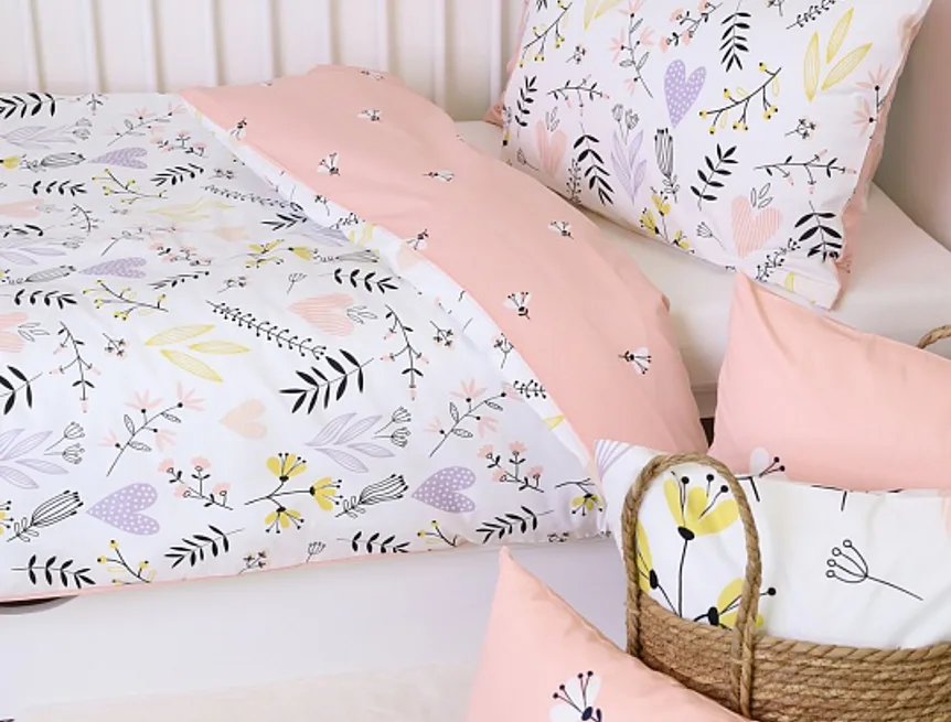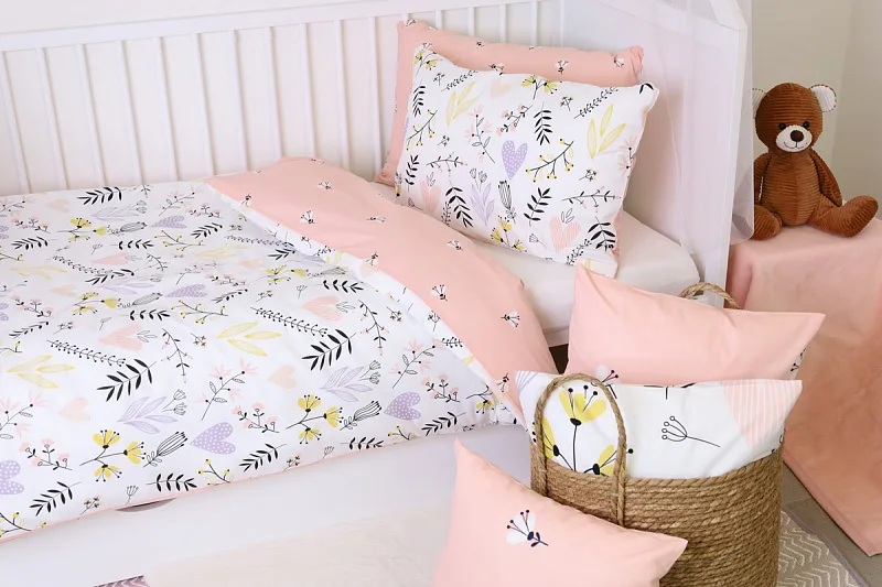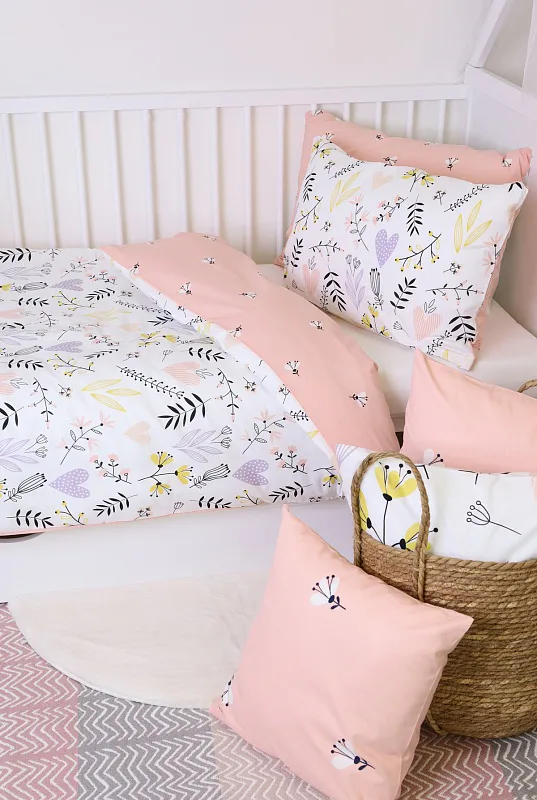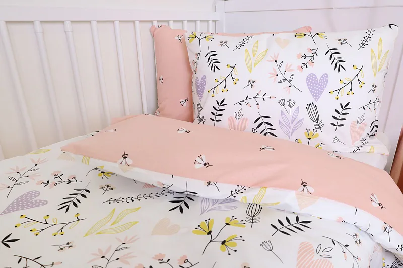 Obliečku na vankúš a na prikrývku zvrchu zdobí vzor kvetov a srdiečok, spodná strana je posiata motívom drobných čierno-bielych kvetov na svetloružovom podklade.