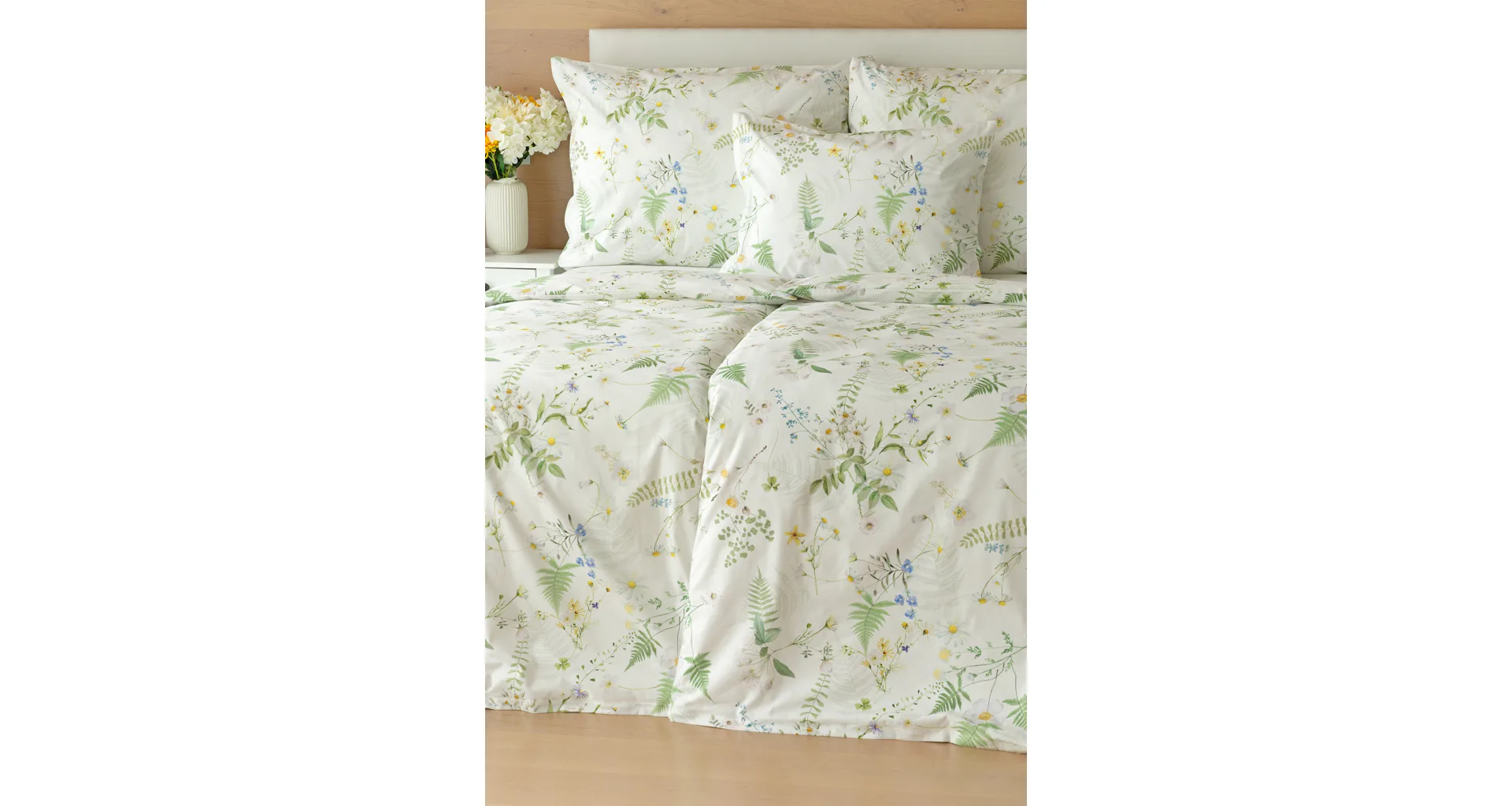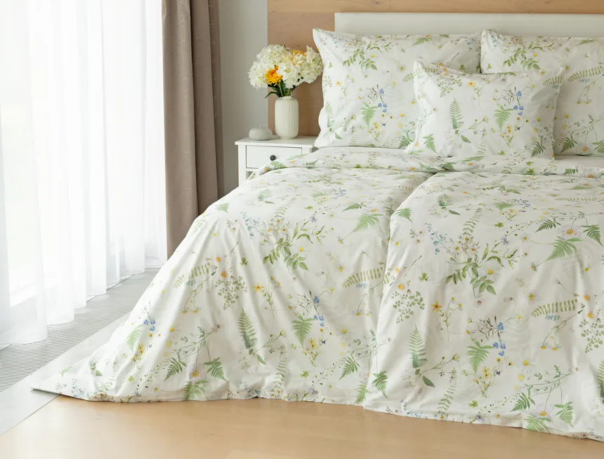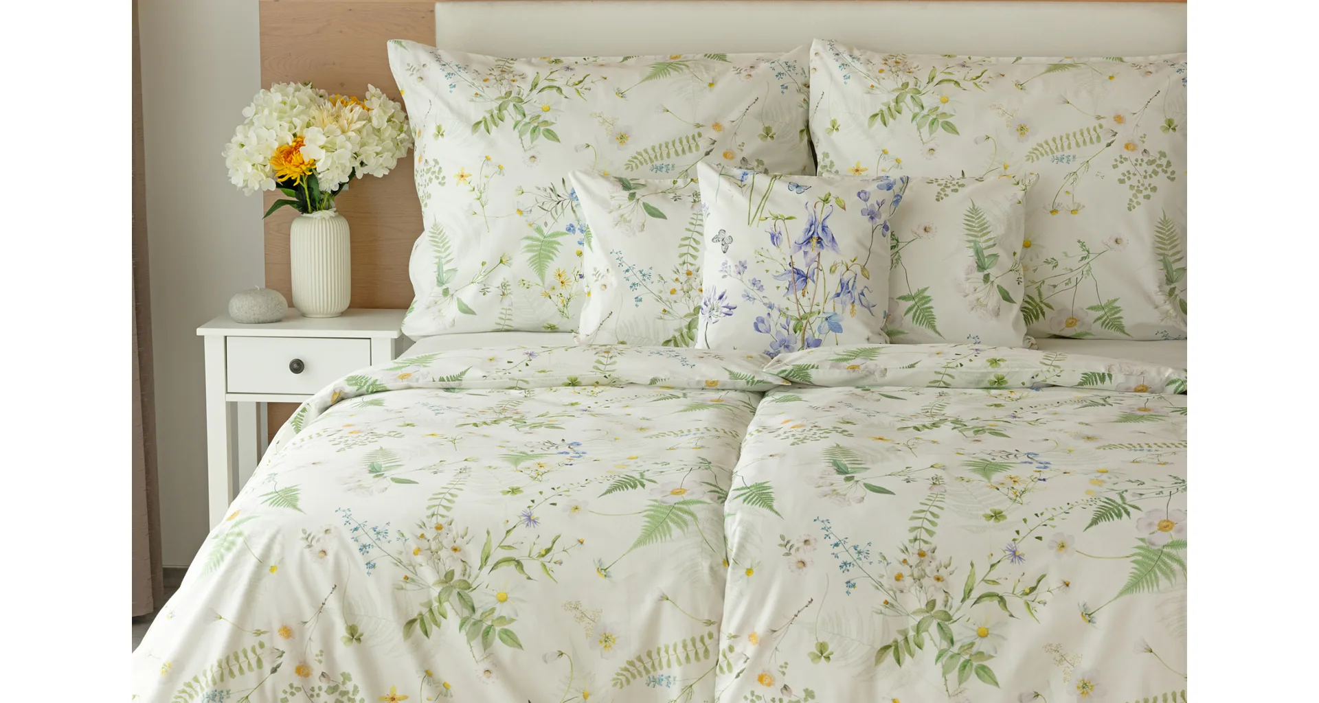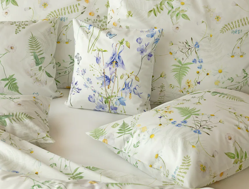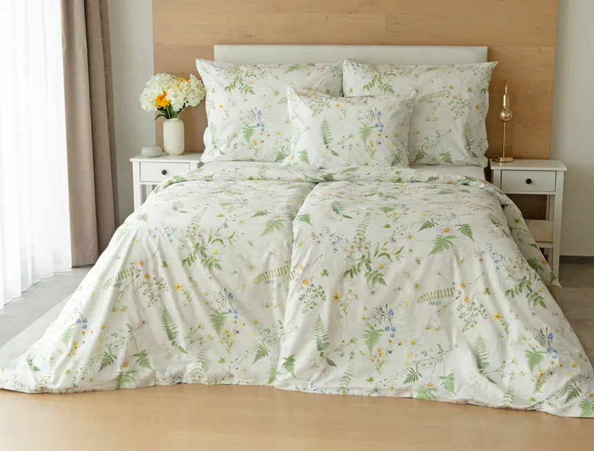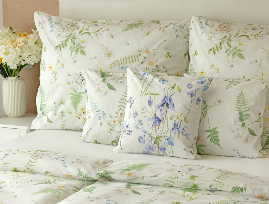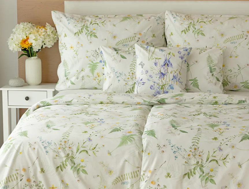 Nežný kvetinový motív posteľného prádla Aria si zaslúži vašu pozornosť. Jemné lúčne kvety, ktoré sú rôzne poprepletané vynikajú na bielom podklade a pôsobia nesmierne čistým dojmom. Dokonalá jarná sviežosť. Vďaka najmodernejšej digitálnej tlačovej technológii vyniká každý kvet v precíznom detaile.
