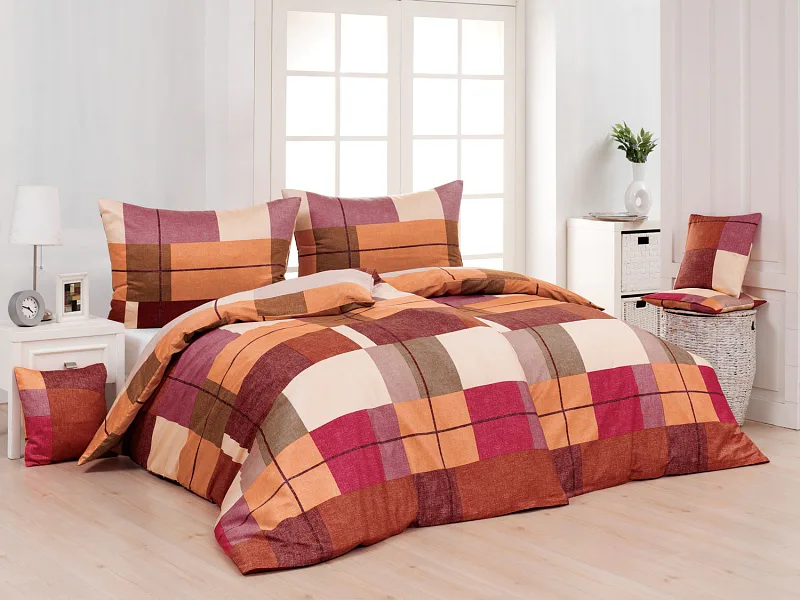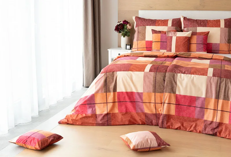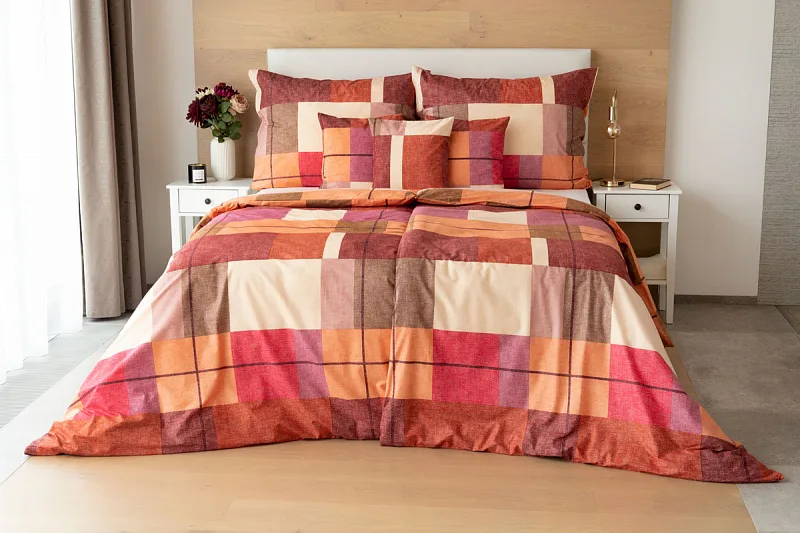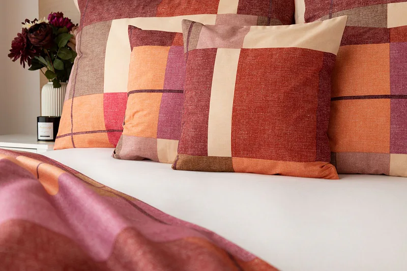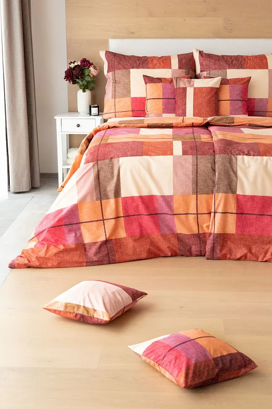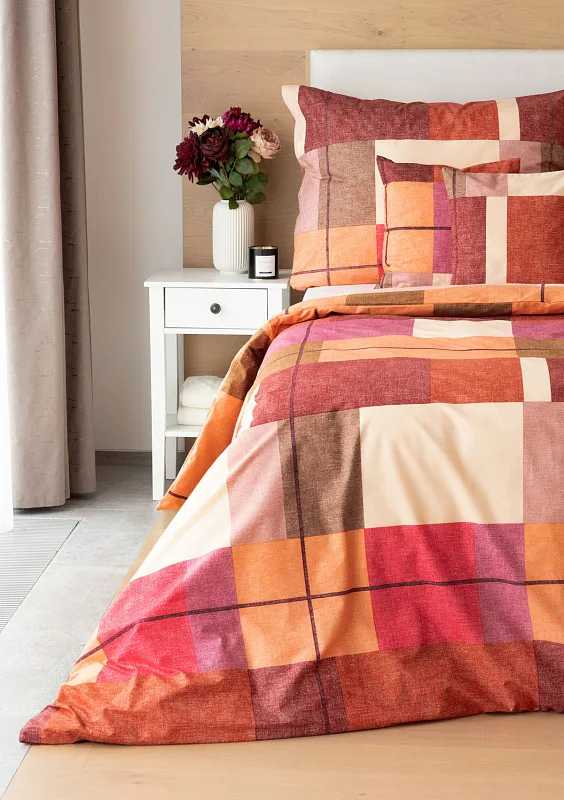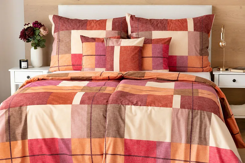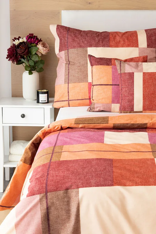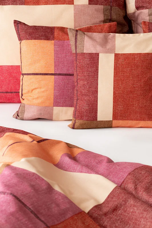 Bavlnené obliečky Berkely rozžiaria vašu spalňu. Kockovana kolaž s priznanou bodkovanou štruktúrou prinaša spojenie hrejivých farieb, od svetlej marhuľovej, cez odtiene oranžovej a terakotovej, až po vínovo červenú. Vzhľadom k výrazným farbám a okázalému vzoru sú obliečky Berkely vhodné najmä do svetlých, minimalistických interiérov.
