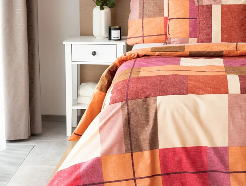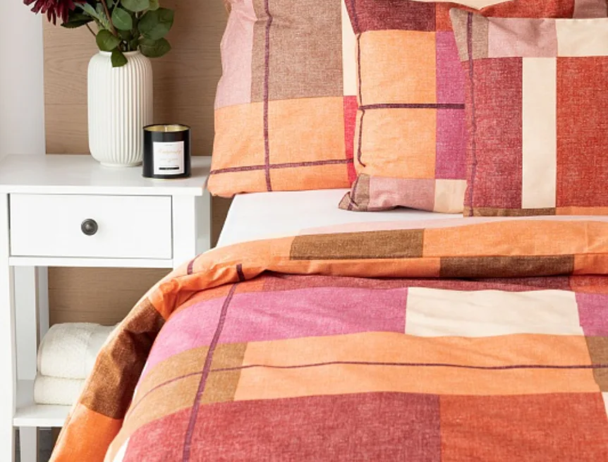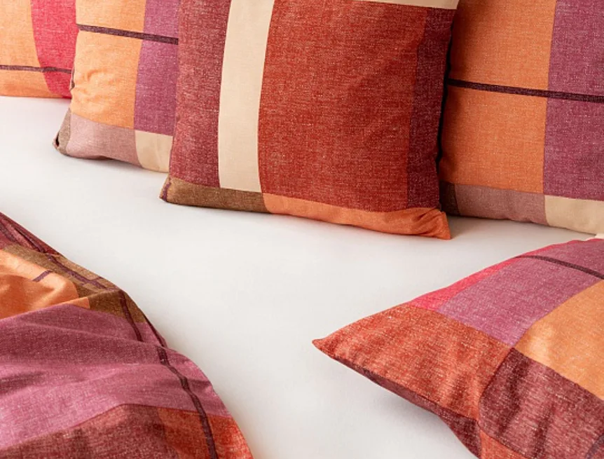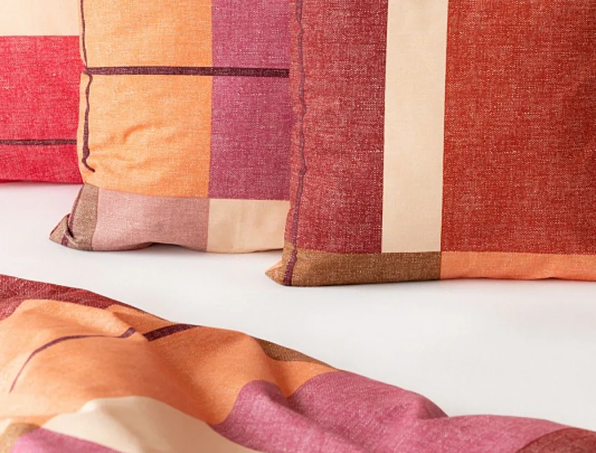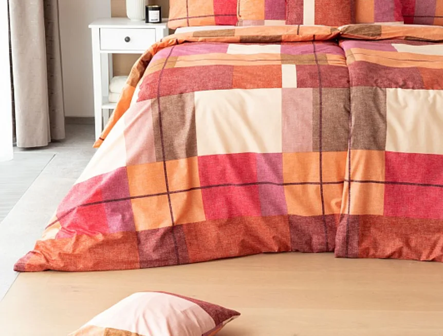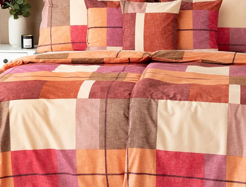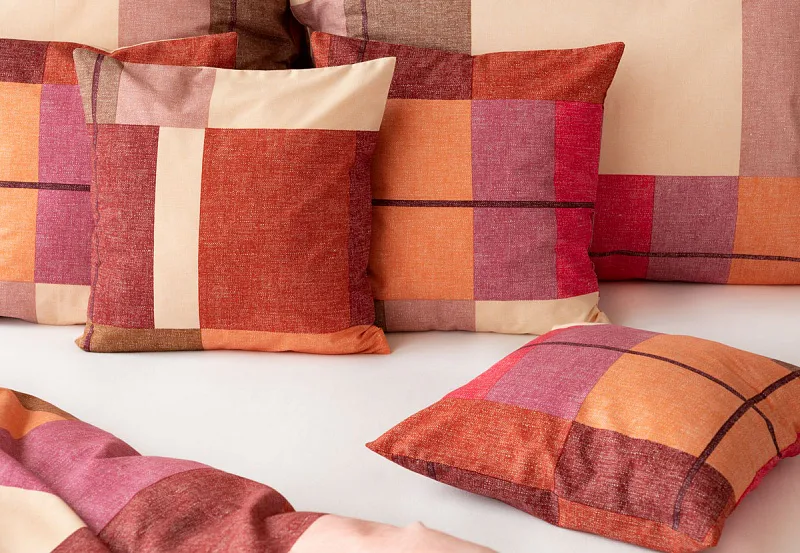 Bavlnené obliečky Berkely rozžiaria vašu spalňu. Kockovana kolaž s priznanou bodkovanou štruktúrou prinaša spojenie hrejivých farieb, od svetlej marhuľovej, cez odtiene oranžovej a terakotovej, až po vínovo červenú. Vzhľadom k výrazným farbám a okázalému vzoru sú obliečky Berkely vhodné najmä do svetlých, minimalistických interiérov.