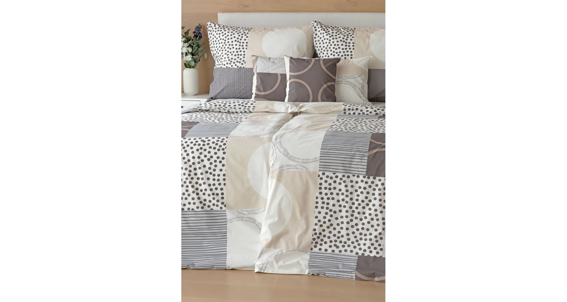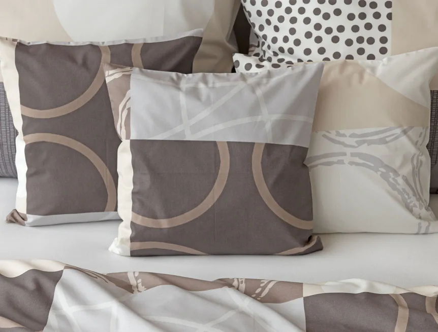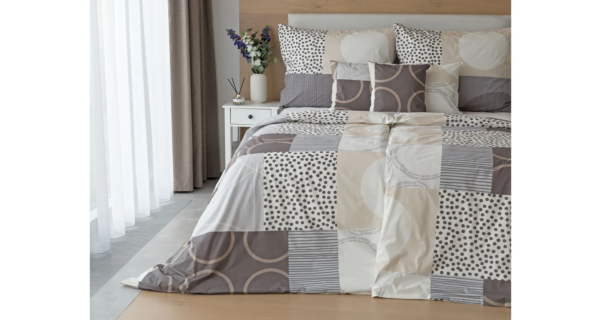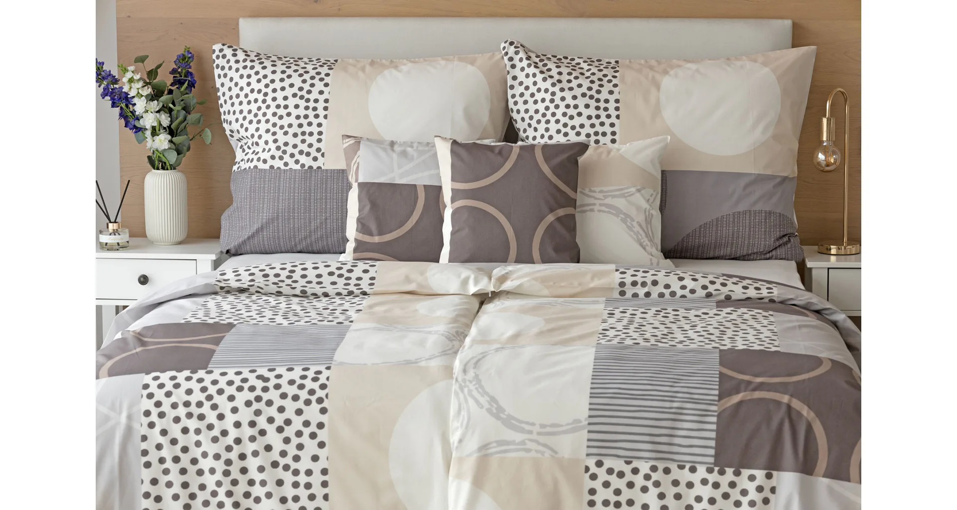 Moderné geometrické vzory sa snúbia s jemnými odtieňmi hnedej, béžovej a sivej na bavlnenej posteľnej bielizni BRENTON.