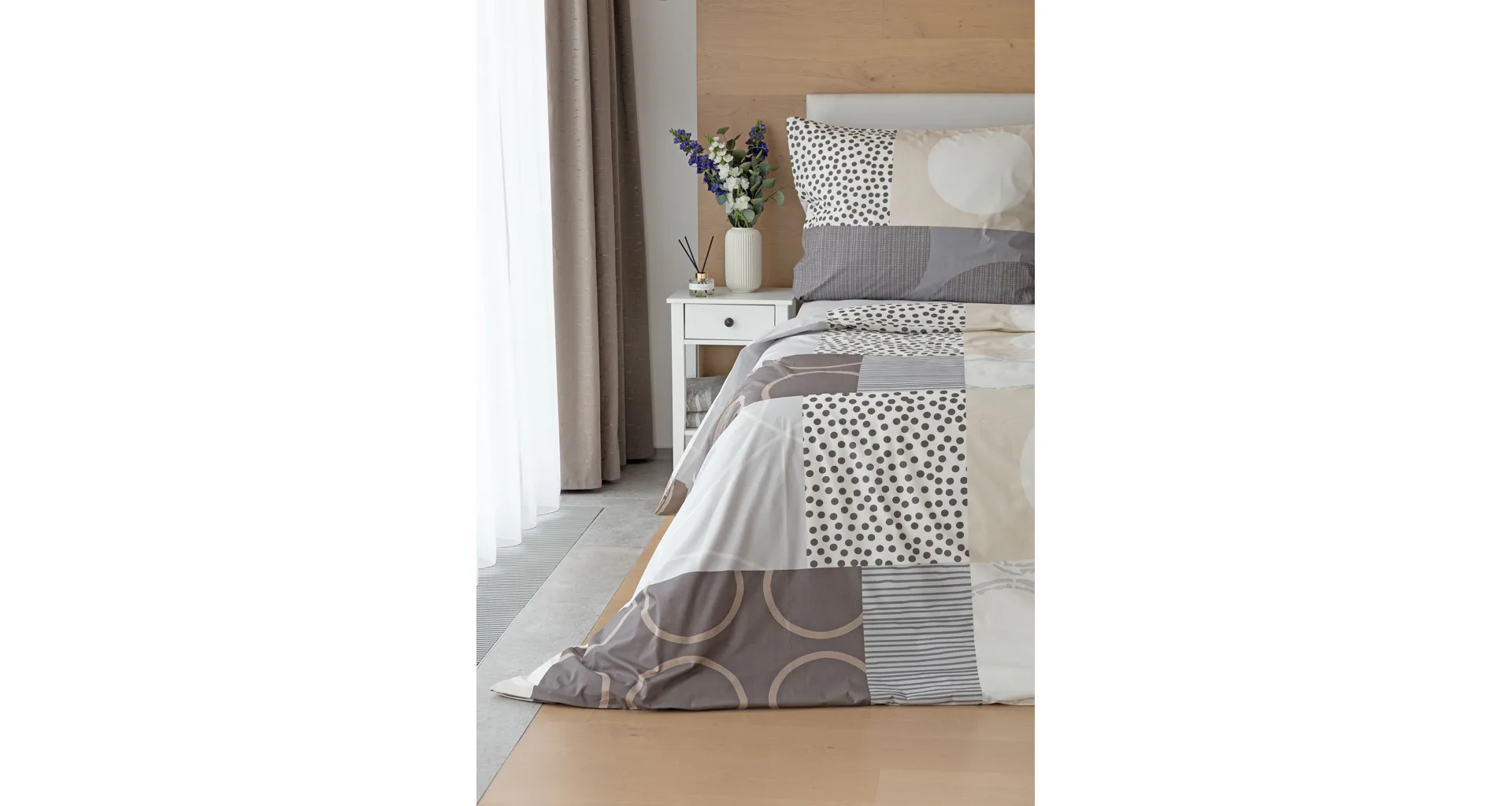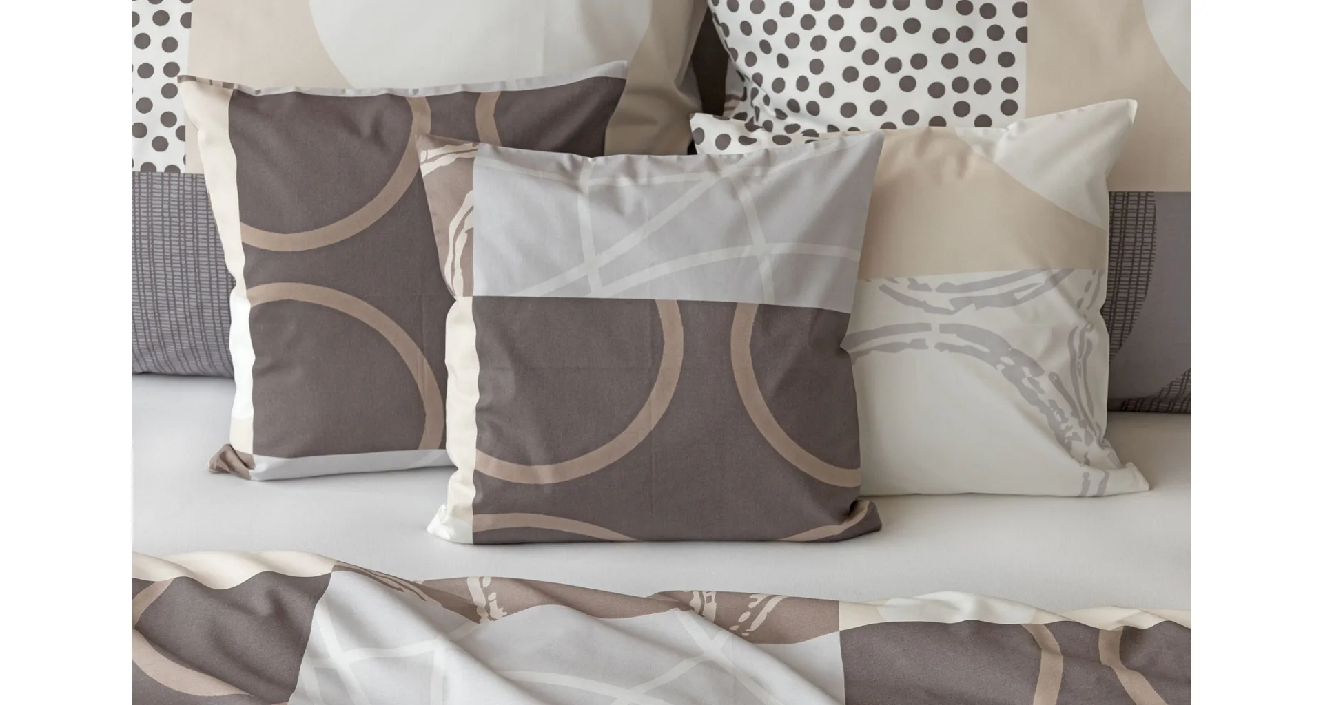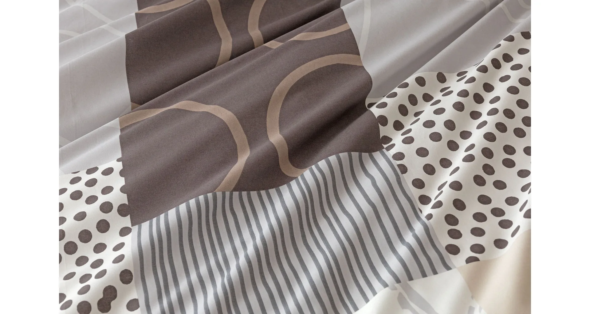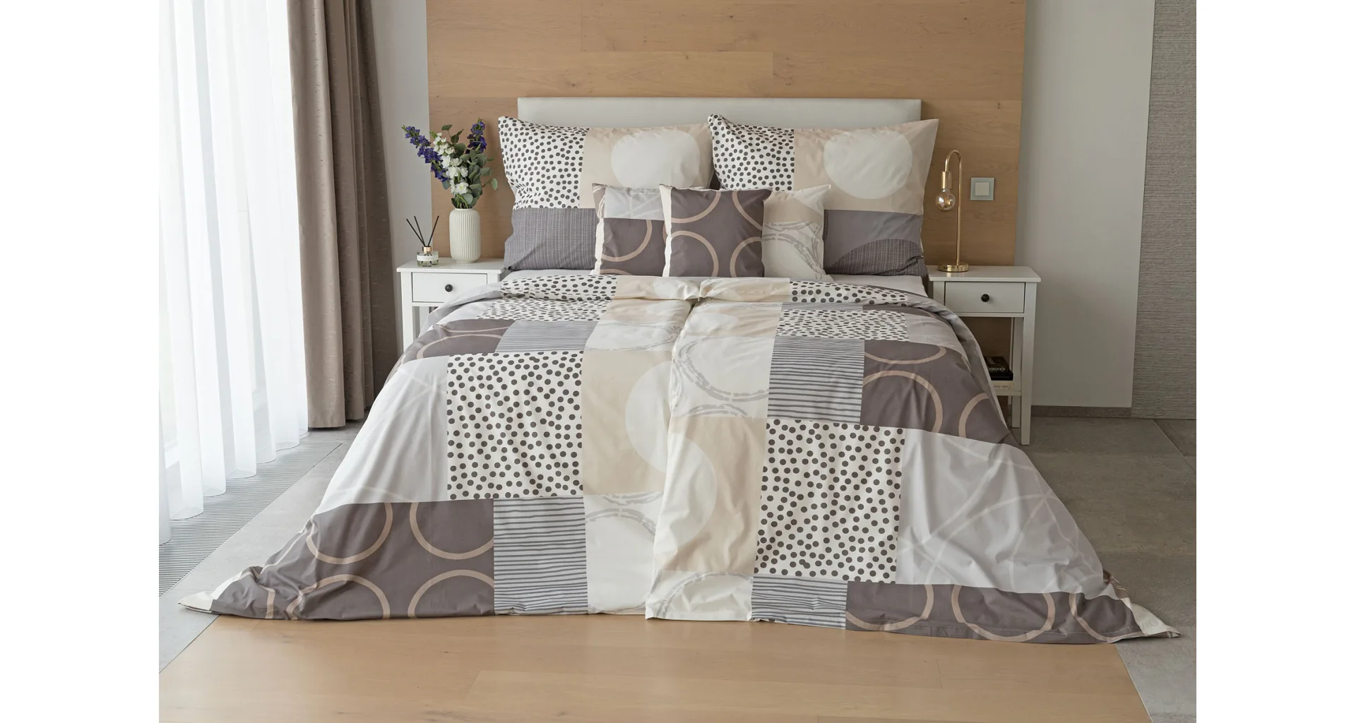 Moderné geometrické vzory sa snúbia s jemnými odtieňmi hnedej, béžovej a sivej na bavlnenej posteľnej bielizni BRENTON.