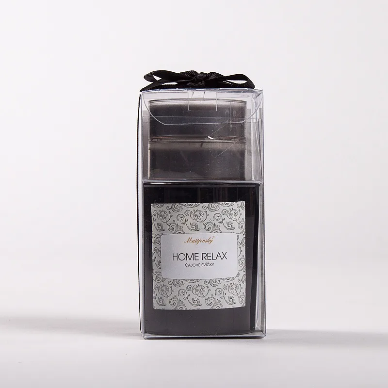 Nechte se inspirovat elegantním dárkovým balením skleněného svícnu a dvou čajových svíček v průhledném plastovém kalíšku.