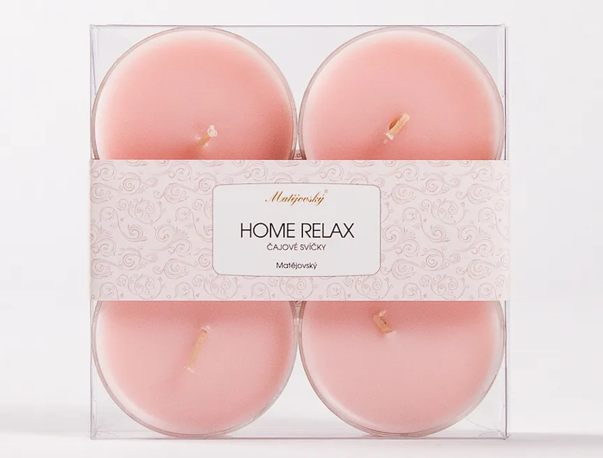 Nechte se inspirovat elegantním dárkovým balením čtyř světle růžových čajových svíček v průhledném plastovém kalíšku.