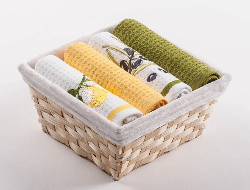 Prútený košík s textilnou vložkou je súčasťou celého balenia, spolu s utierkami je zabalený v celofáne a doplnený o ozdobnú mašľu.