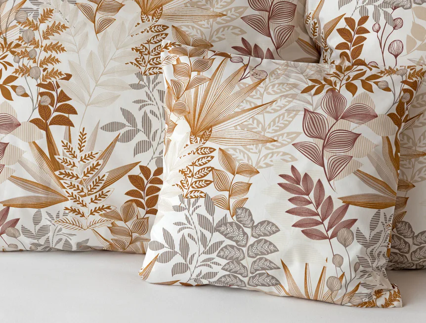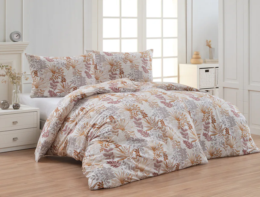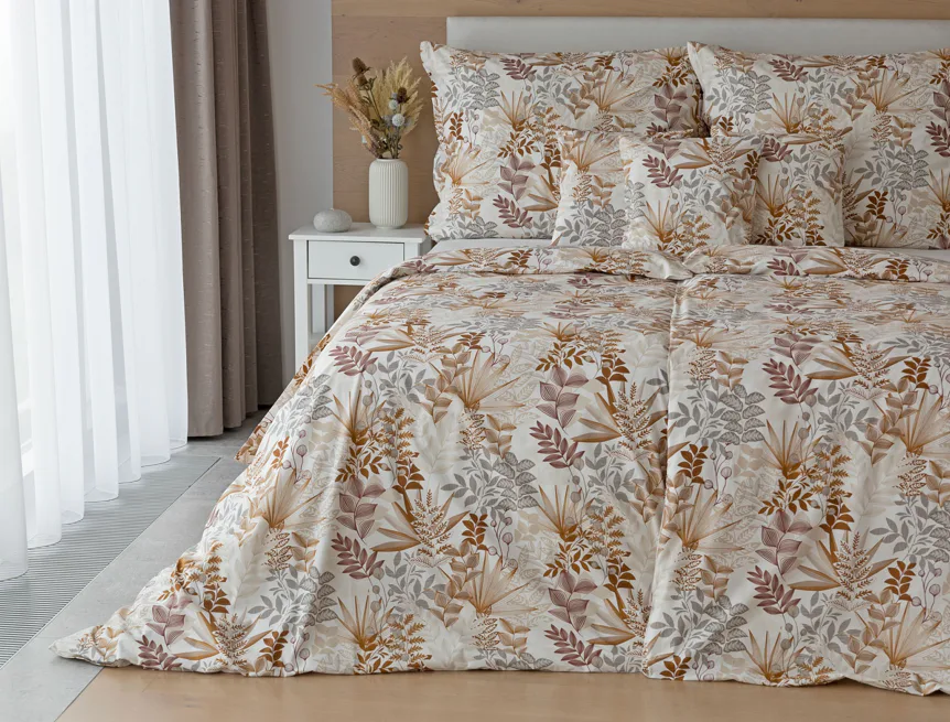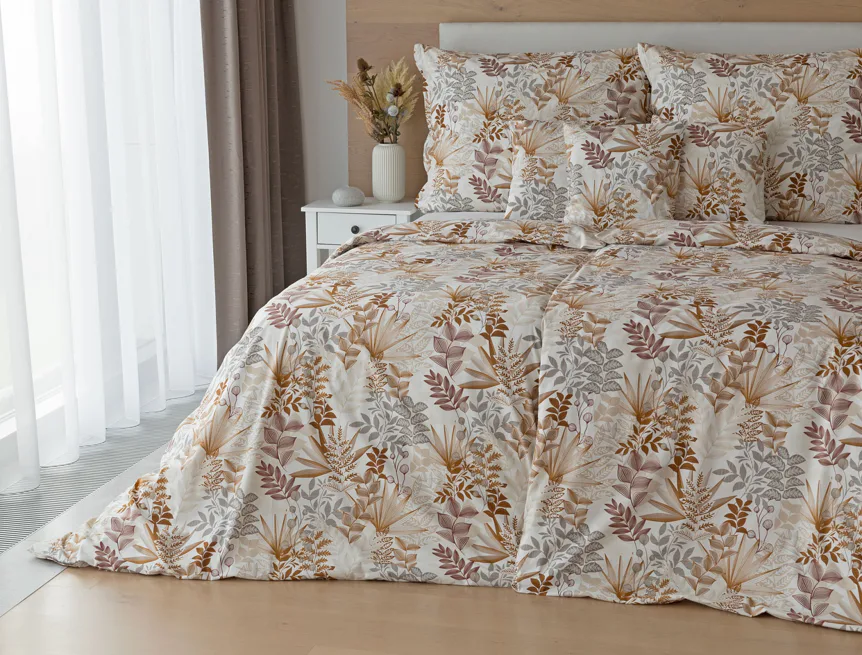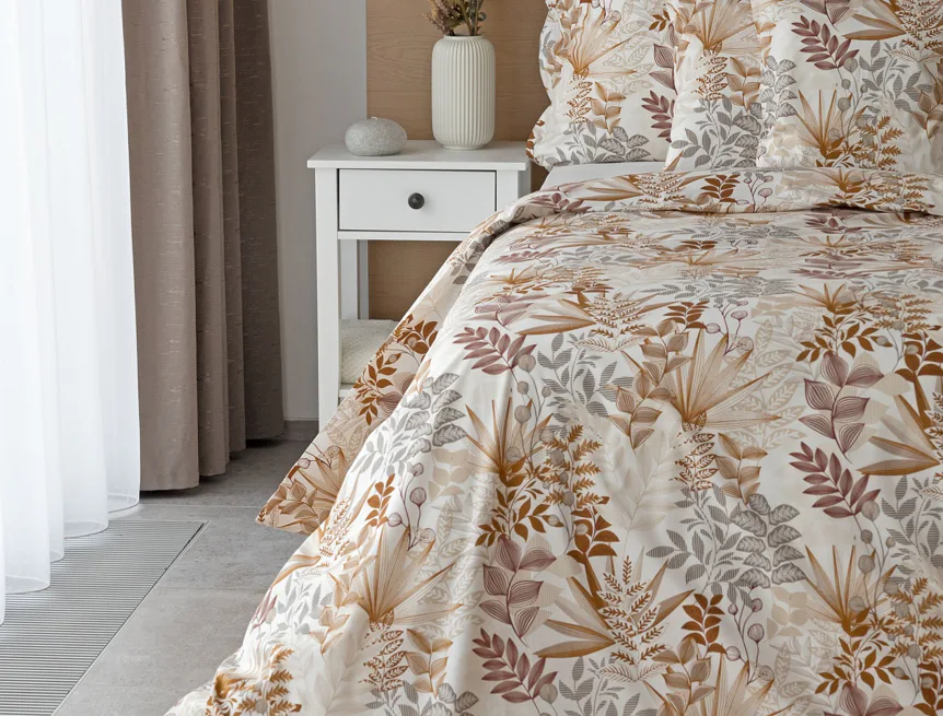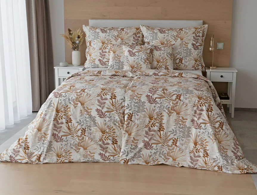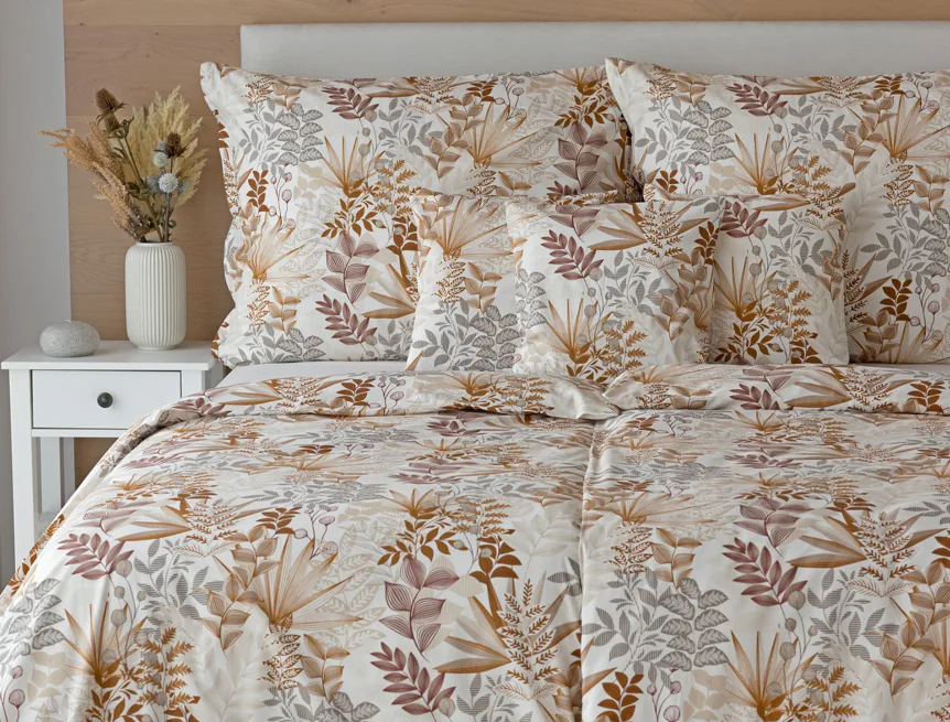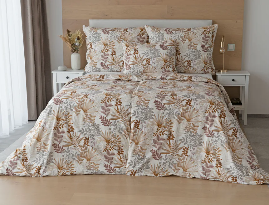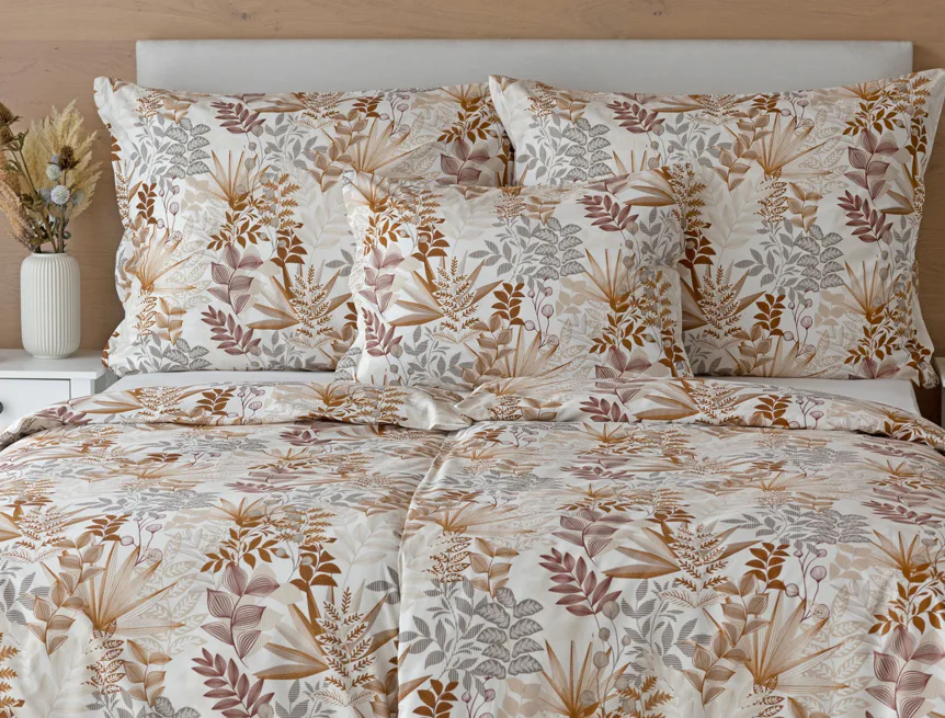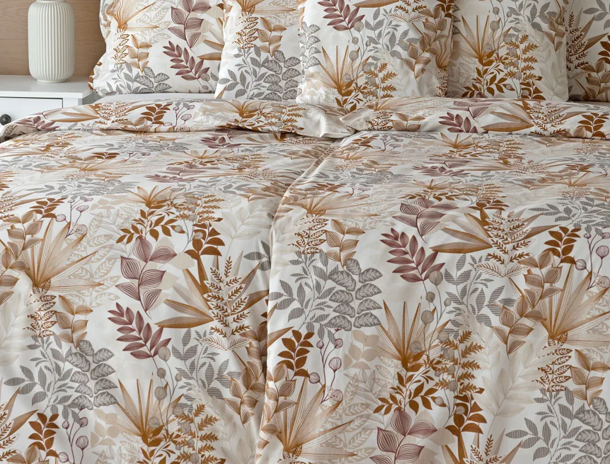Bavlnené obliečky Clementine vnesú do vašej spálne hrejivú atmosféru, ktorú si budete chcieť vychutnávať vo dne aj v noci. Florálny motív v obľúbenej kombinácii zemitých tónov béžovej, hnedej a šedej vyniká na krémovo bielom podklade.