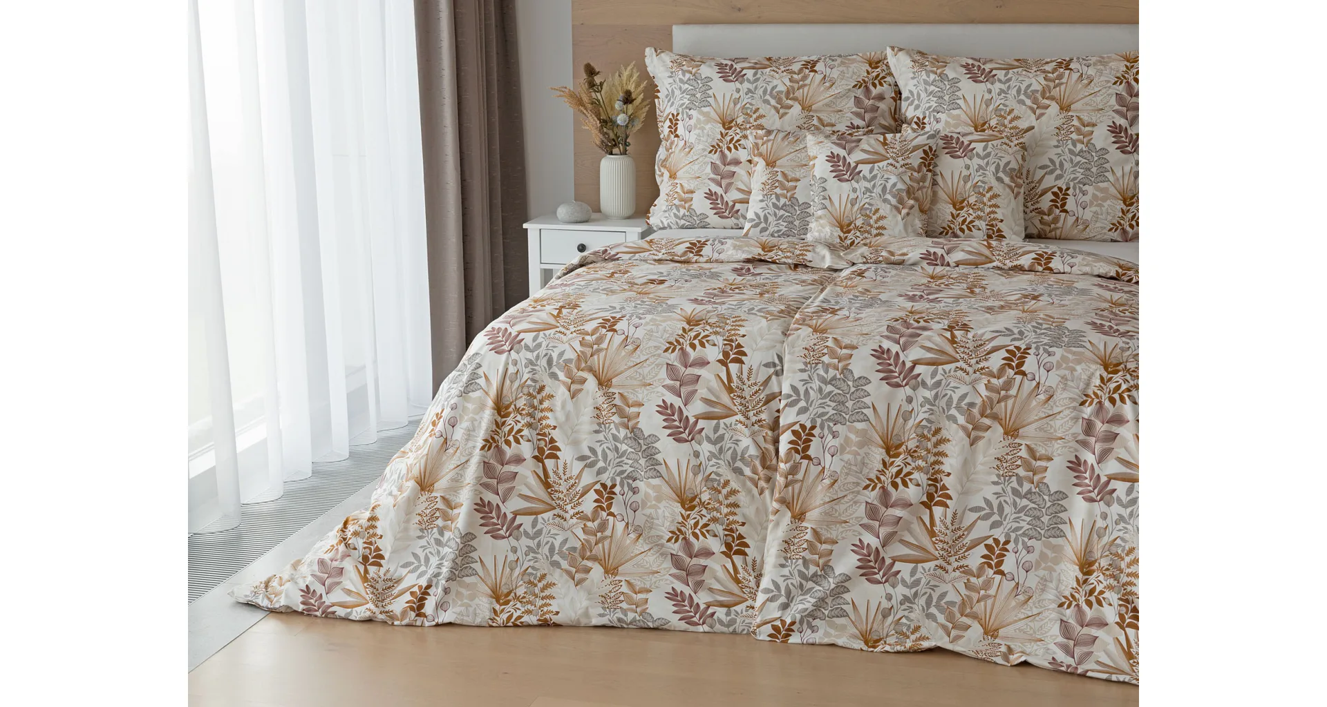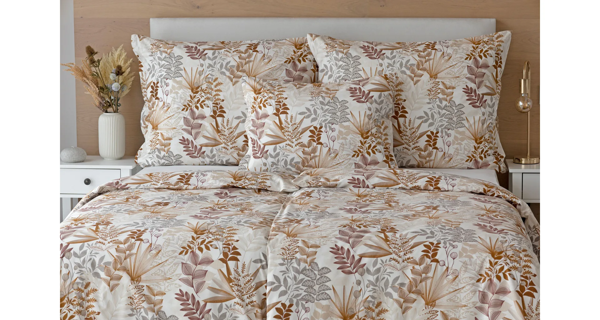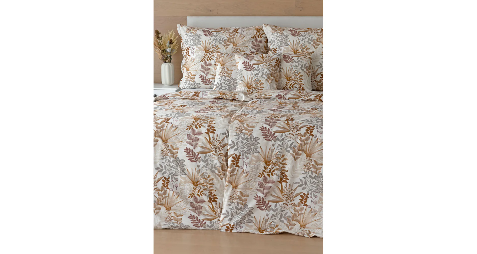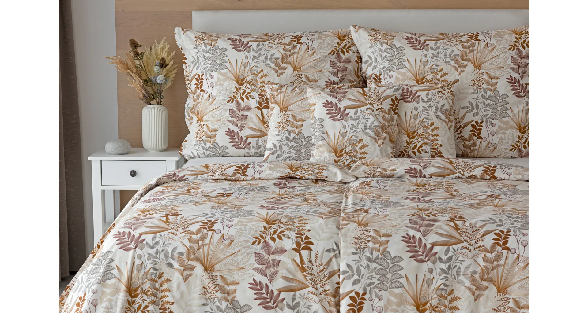 Bavlnené obliečky Clementine vnesú do vašej spálne hrejivú atmosféru, ktorú si budete chcieť vychutnávať vo dne aj v noci. Florálny motív v obľúbenej kombinácii zemitých tónov béžovej, hnedej a šedej vyniká na krémovo bielom podklade.