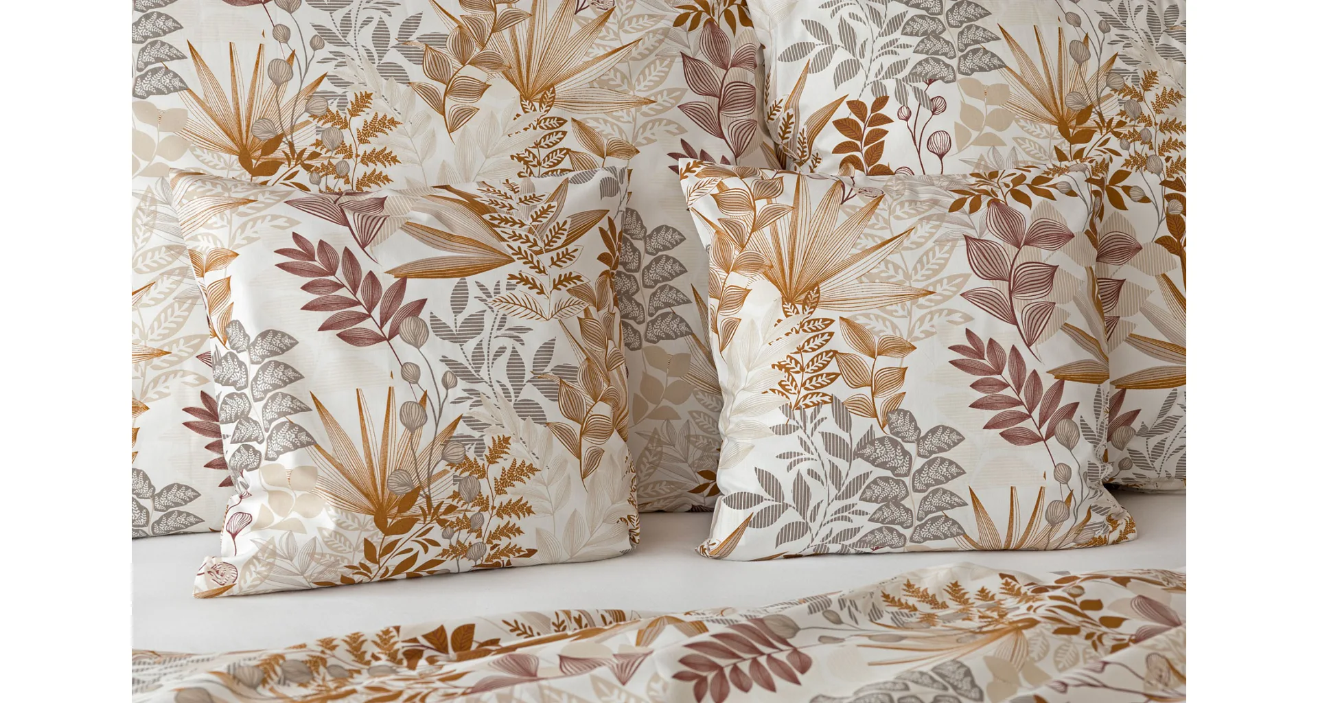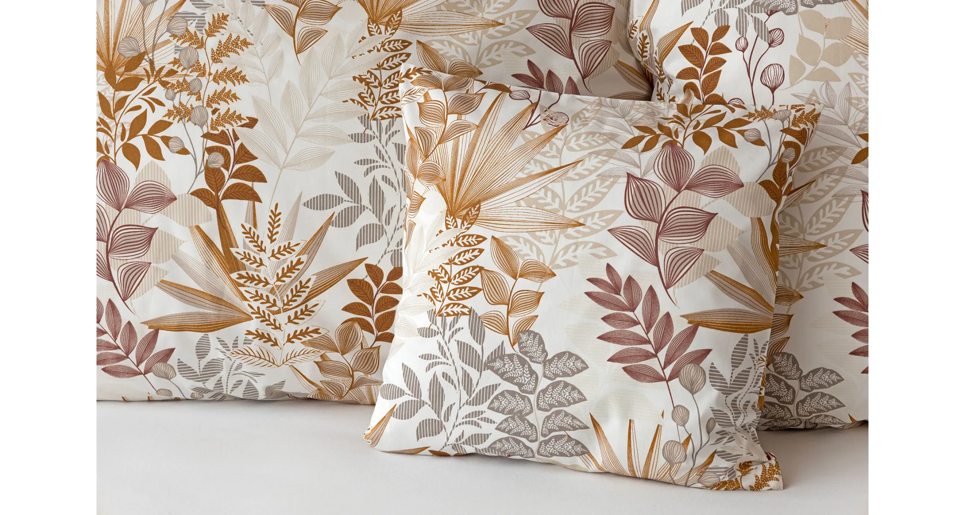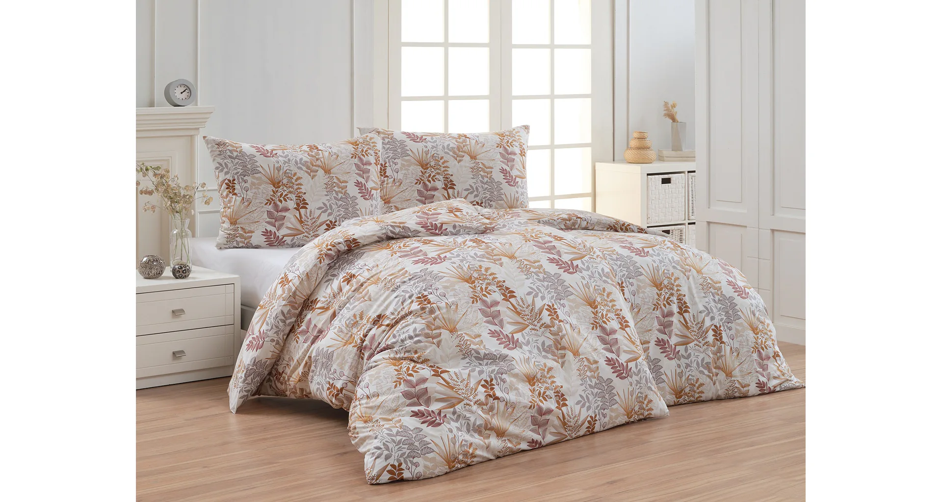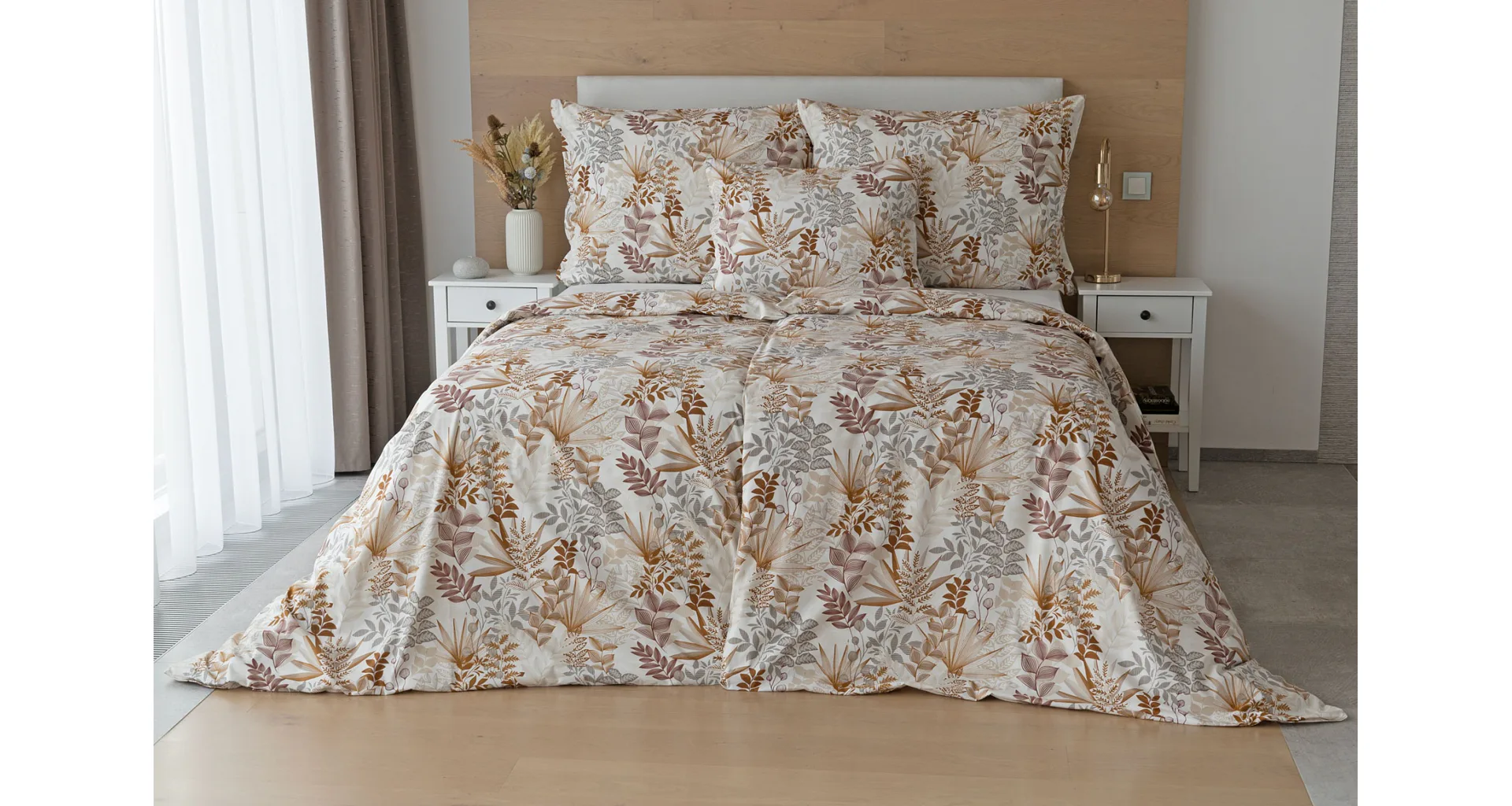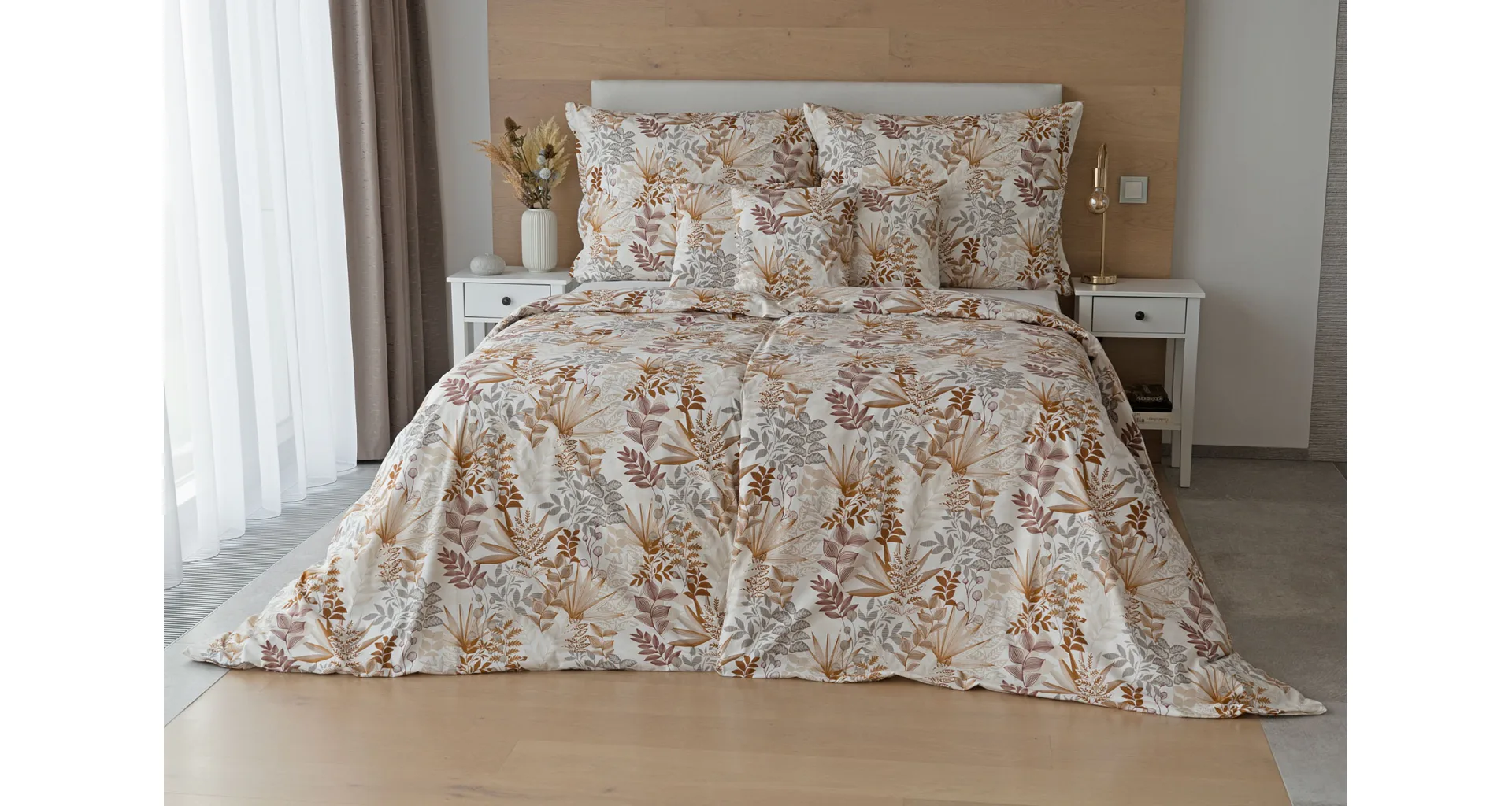 Bavlnené obliečky Clementine vnesú do vašej spálne hrejivú atmosféru, ktorú si budete chcieť vychutnávať vo dne aj v noci. Florálny motív v obľúbenej kombinácii zemitých tónov béžovej, hnedej a šedej vyniká na krémovo bielom podklade.