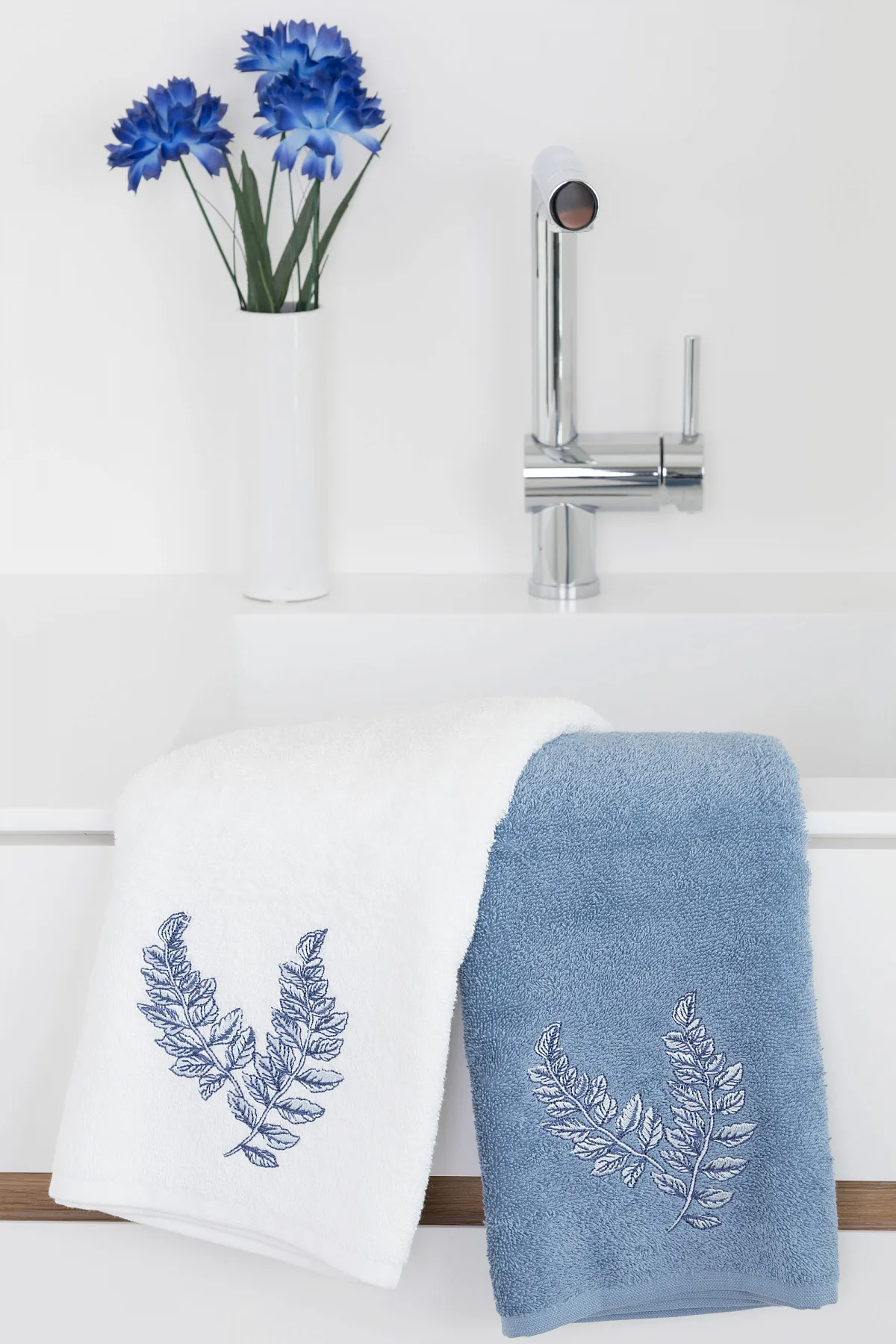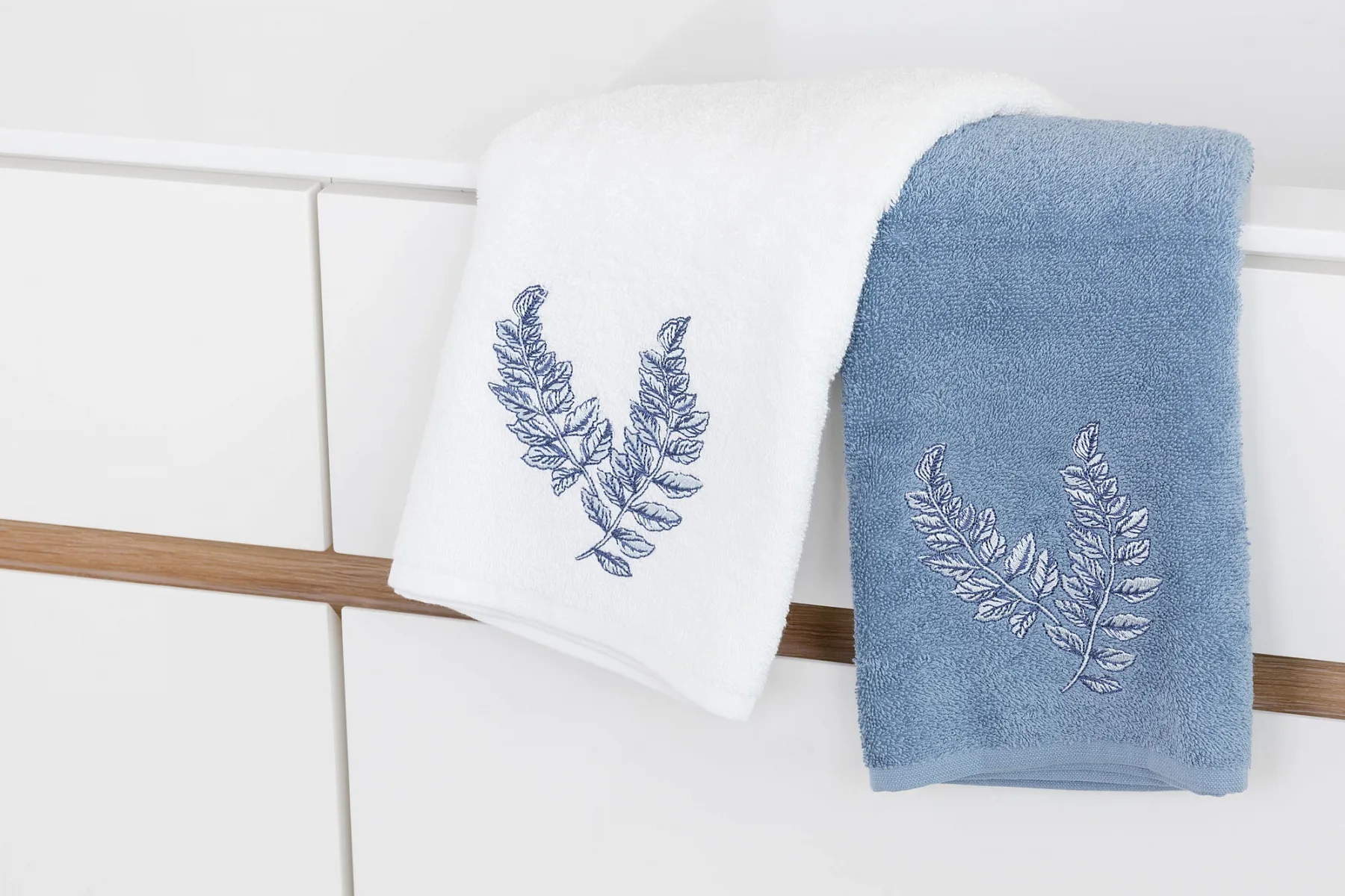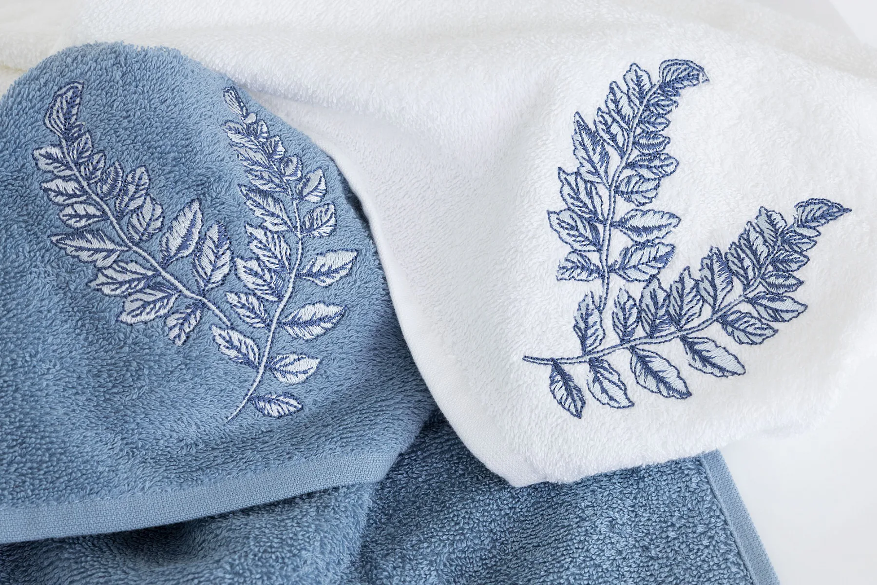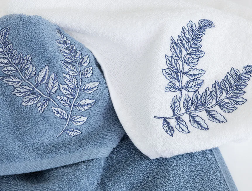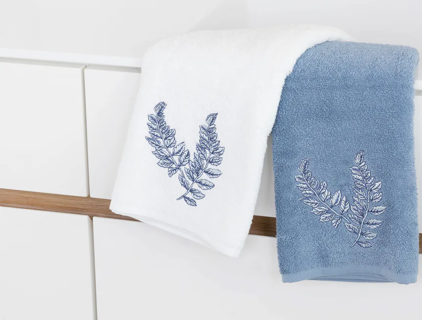 - pastelově modrý ručník, výšivka s florálním motivem