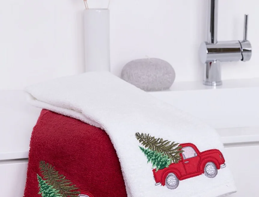 - bílý ručník, výšivka s motivem auta a vánočního stromku