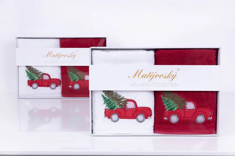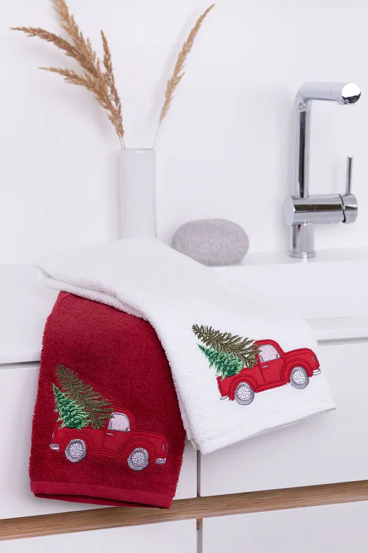 - červený ručník, výšivka s motivem auta a vánočního stromku