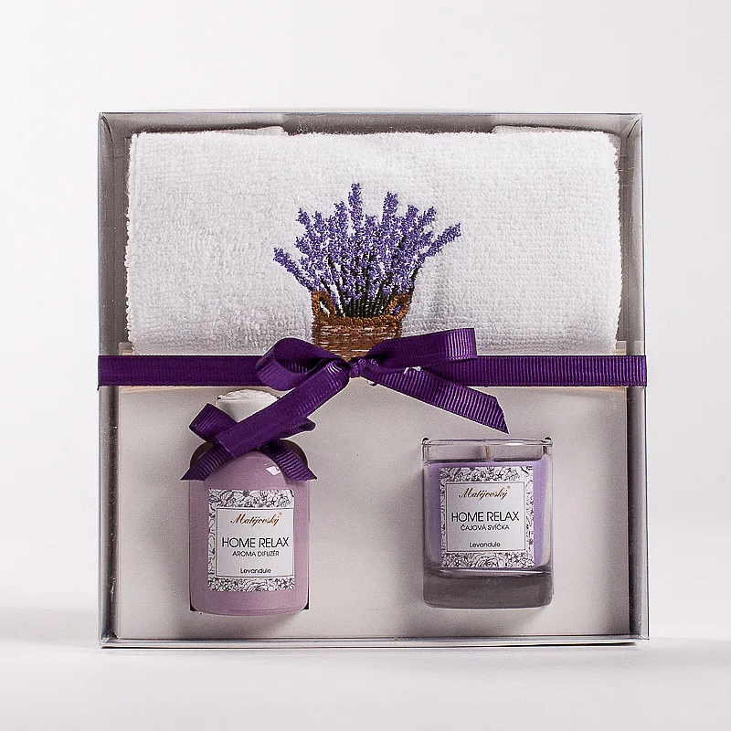 Dárkově balený set ručníku, svíčky ve skle a vonného difuzéru potěší každého milovníka praktických dárků.