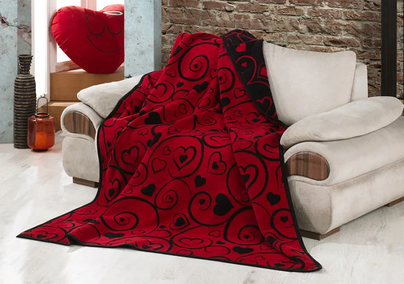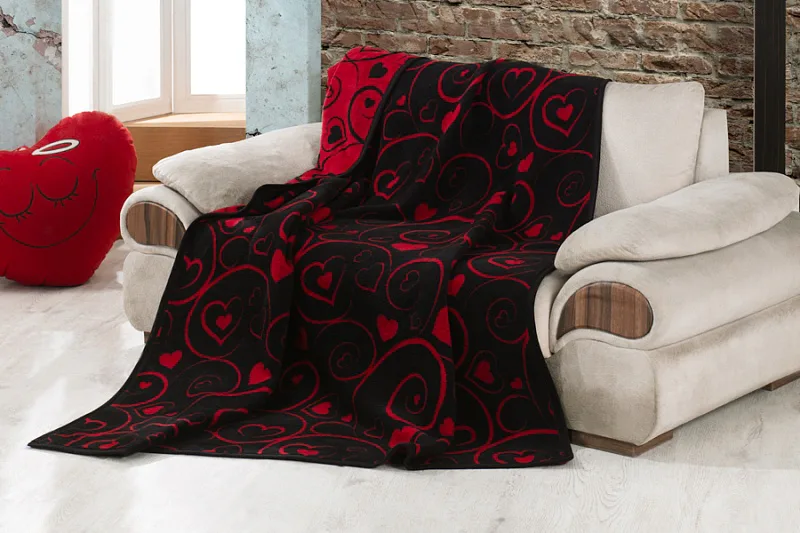 Luxusní bavlněná deka s hustým vlasem, hřejivá a hebká na omak. Nová receptura tkaní je zárukou lehkosti a skvělé prodyšnosti. Deka Amor se stane jedinečným doplňkem vašeho domova a nepostradatelným společníkem pro chladné večery. Stylový romantický vzor v červených a černých odstínech doplní každý moderní interiér.