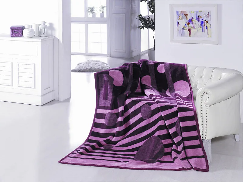 Deku můžete elegantně využít i jako ozdobný přehoz. Deka je olemována tmavě fialovou lemovkou.