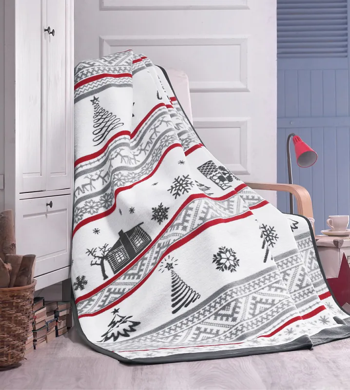 Luxusní bavlněná deka s hustým vlasem, hřejivá a hebká na omak. Nová receptura tkaní je zárukou lehkosti a skvělé prodyšnosti. Deka DECORATE bude jedinečným doplňkem vašeho domova a nepostradatelným společníkem pro chladné večery. Vánoční motiv v elegantním severském stylu vynikne díky kontrastní kombinaci vínově červené a šedé na přírodním bílém podkladu. Spodní strana deky je provedena inverzně.