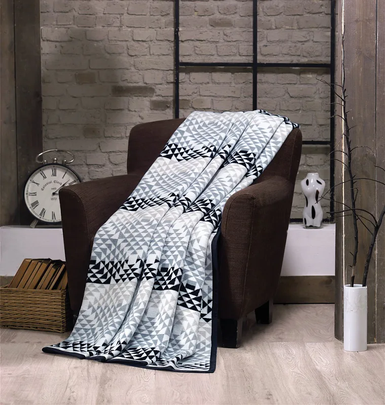 Luxusní bavlněná deka s hustým vlasem, hřejivá a hebká na omak. Nová receptura tkaní je zárukou lehkosti a skvělé prodyšnosti. Deka DIEGO bude jedinečným doplňkem vašeho domova a nepostradatelným společníkem pro chladné večery. Drobvný trojúhelníkový motiv s kombinuje odstíny černé, šedé, světle hnědé a přírodní bílé. Spodní strana deky je provedena inverzně.