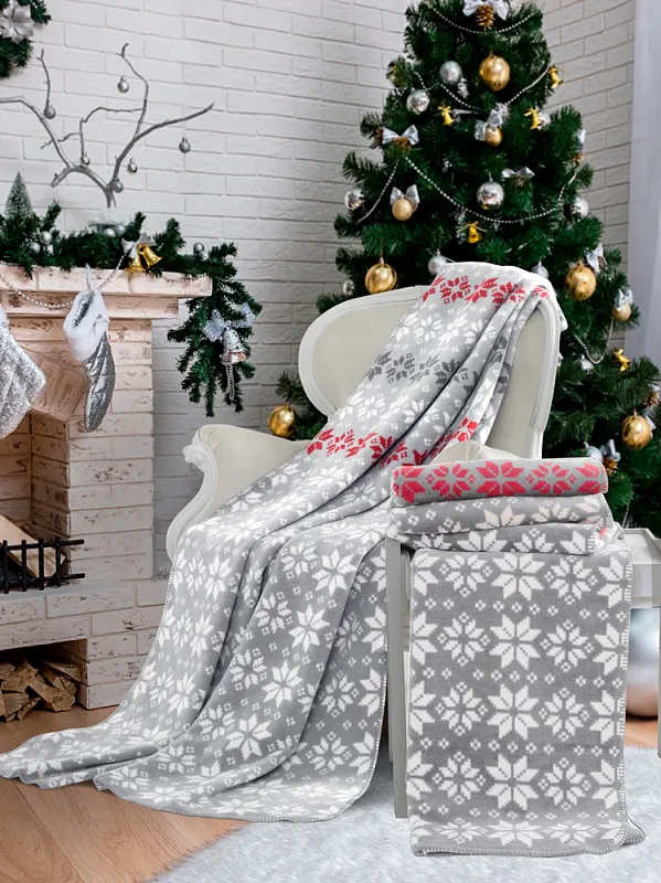 Luxusní bavlněná deka s hustým vlasem, hřejivá a hebká na omak. Deka HERMOSA bude jedinečným doplňkem vašeho domova a nepostradatelným společníkem nejen pro sváteční večery. Šedobílý geometrický vánoční motiv s červenými prvky.