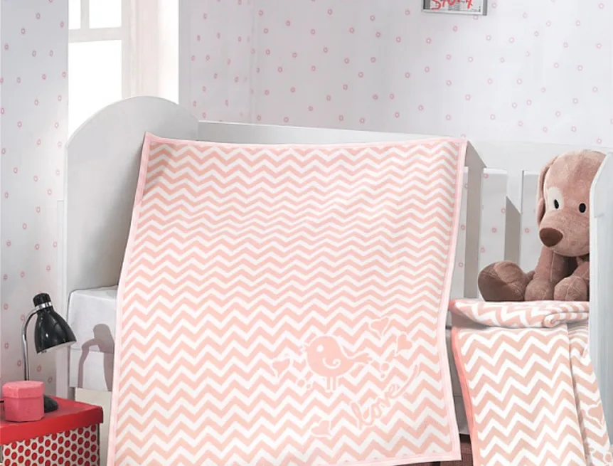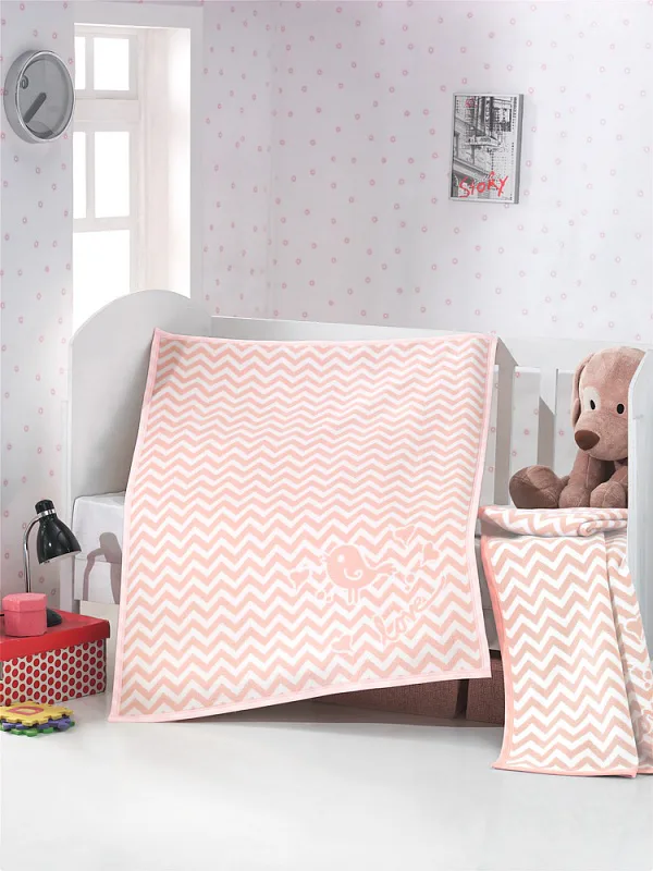 Dětská deka s vysokým podílem bavlny a hustým vlasem, hřejivá a hebká na omak. Deka LORRI bude skvělým společníkem v dětském pokojíčku, nebo třeba v kočárku. Geometrický motiv s roztomilým ptáčkem v jemných pastelových odstínech teplé růžové a bílé. Deka je po celém obvodu olemována světle růžovou lemovkou.