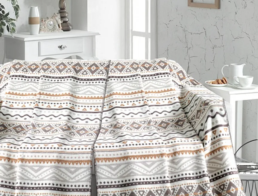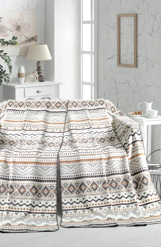 Luxusní bambusová deka s hustým vlasem, hřejivá a mimořádně hebká na omak. Deka MAGLIA bude jedinečným doplňkem vašeho domova a nepostradatelným společníkem pro chladné večery. Indiánský motiv v odstínech světlé a tmavé kakaově hnědé a karamelové na přírodním bílém podkladu.