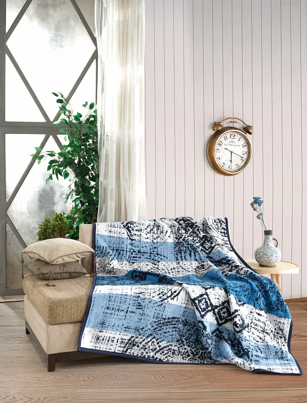 Luxusní bavlněná deka s hustým vlasem, hřejivá a hebká na omak. Nová receptura tkaní je zárukou lehkosti a skvělé prodyšnosti. Deka Mareo se stane jedinečným doplňkem vašeho domova a nepostradatelným společníkem pro chladné večery. Moderní vzor s nádechem etno stylu v paletě modrých odstínů v kombinaci s krémově bílou doladí každý mladistvý interiér.