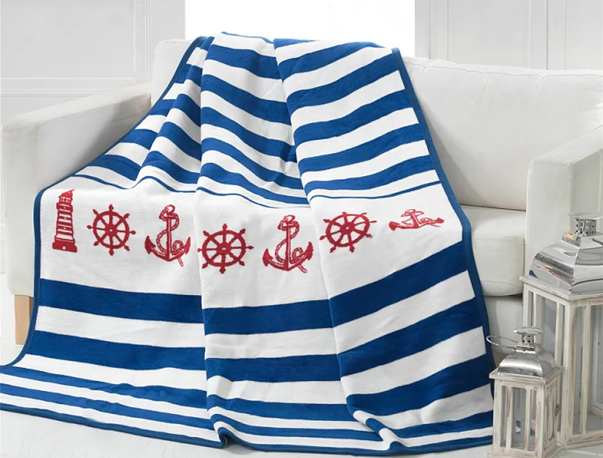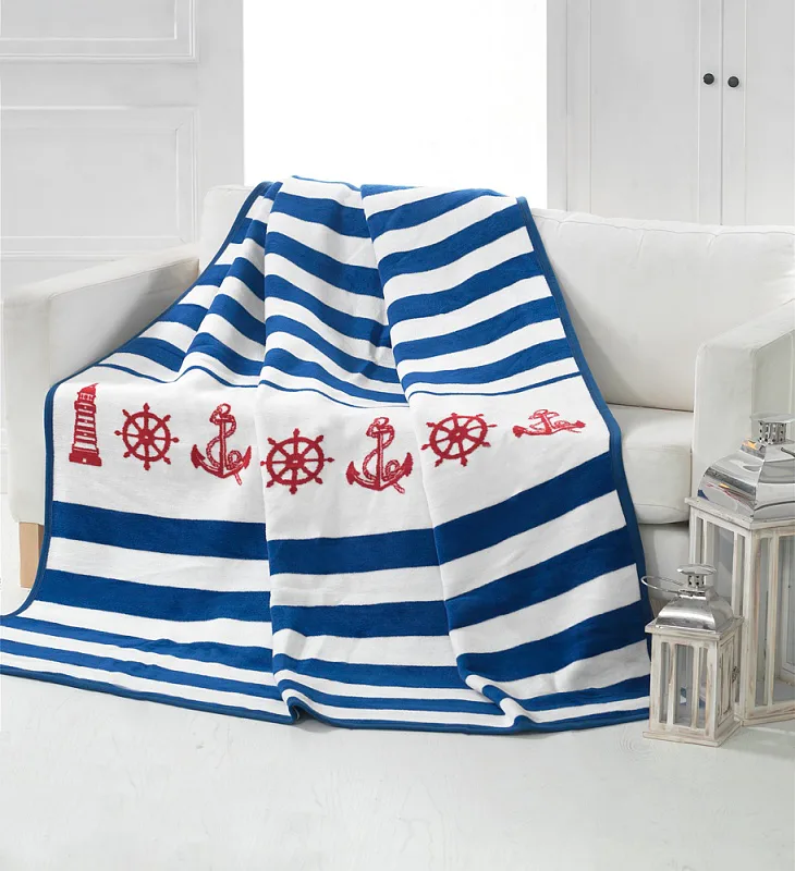 Bavlněná deka s hustým vlasem, hřejivá a hebká na omak. Oblíbený námořnický dezén MARINE bude jedinečným doplňkem vašeho domova a nepostradatelným společníkem nejen pro chladné večery. Zářivé odrobílé pruhy jsou doplněny o červené námořnické motivy. Druhá strana deky má ozdobný pruh červený s bílými námořnickými motivy.