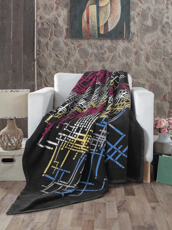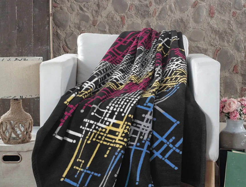 Luxusní bavlněná deka s hustým vlasem, hřejivá a hebká na omak. Nová receptura tkaní je zárukou lehkosti a skvělé prodyšnosti. Deka MIKA bude jedinečným doplňkem vašeho domova a nepostradatelným společníkem pro chladné večery. Industriální ornament kombinuje syté odstíny modré, vínové, žluté, šedé a přírodní bílé na černém podkladu. Spodní strana je provedena inverzně.