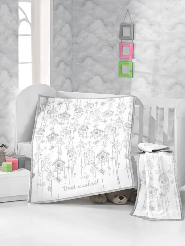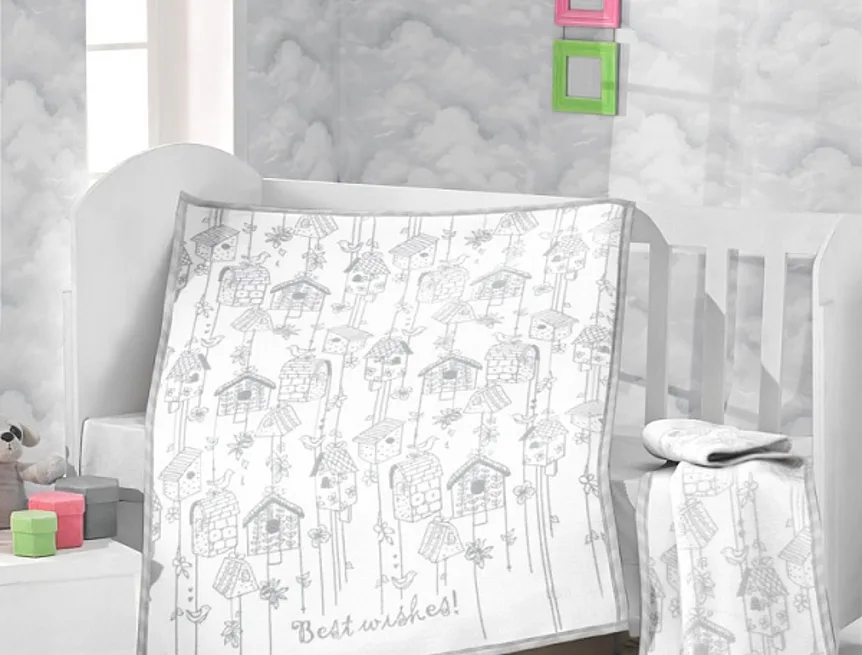 Dětská deka s vysokým podílem bavlny a hustým vlasem, hřejivá a hebká na omak. Deka NIKKO bude skvělým společníkem v dětském pokojíčku, nebo třeba v kočárku. Rozličné obrázky ptačích krmítek s ptáčky v šedém provedení na přírodním bílém podkladu z jedné strany, druhá strana je provedena inverzně - bílé motivy na šedém podkladu.