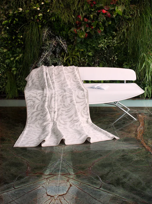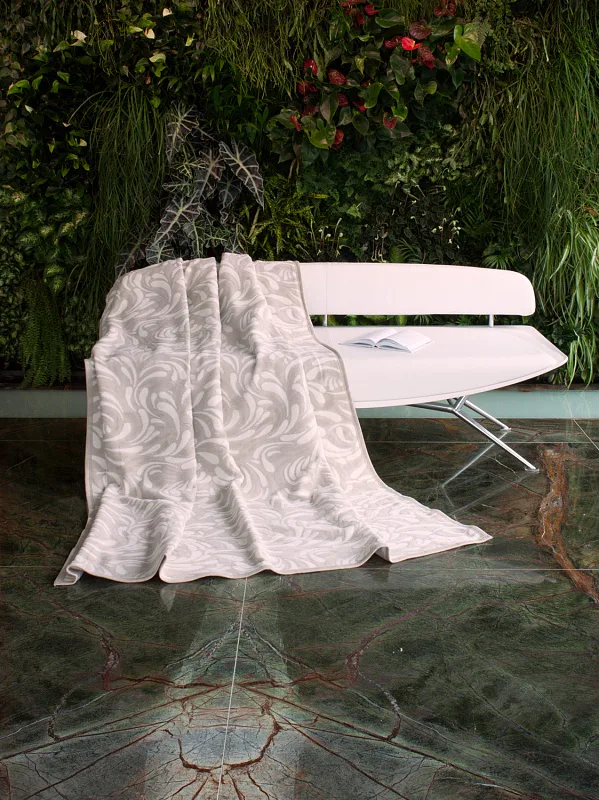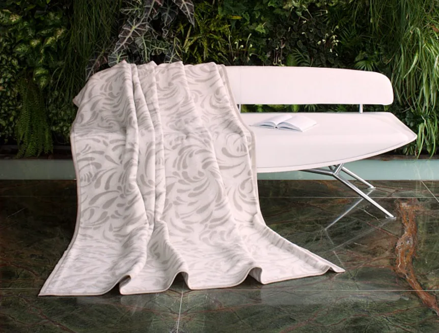 Elegantní deka s hustým vlasem, hřejivá a sametová na omak. Atraktivní dezén je zpracován technikou vytlačovaného vzoru – výsledkem je tzv. embosovaná deka se strukturou. Florální motiv lístků elegantně konstrastuje s podkladem - deka ladí v tónech smetanové a světlé kávy.