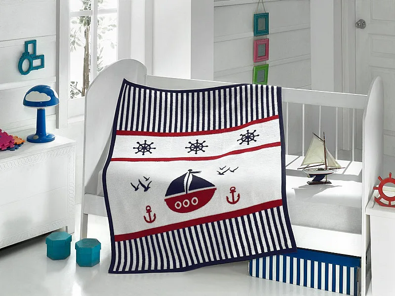 Dětská deka s vysokým podílem bavlny a hustým vlasem, hřejivá a hebká na omak. Deka PEPPE bude skvělým společníkem v dětském pokojíčku, nebo třeba v kočárku. Veselý námořnický motiv v pestrých barvách (modrá, bílá, červená) rozjasní den každému dítěti. Deka je z druhé strany v inverzním barevném provedení (tmavší podklad se světlými motivy).