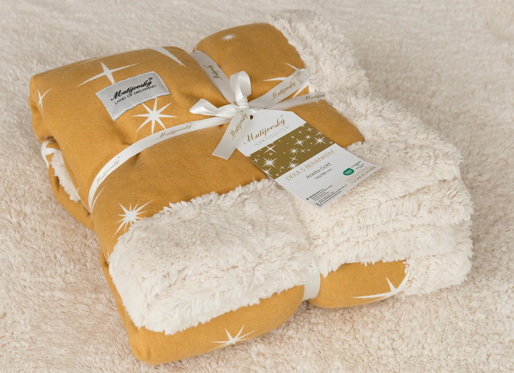 Díky pečlivě vybraným motivům, které lze kombinovat s ložním povlečením a dalšími bytovými doplňky, nesmí beránková deka Arietta Gold - zlatá chybět ve vaší domácí oáze klidu a pohody.