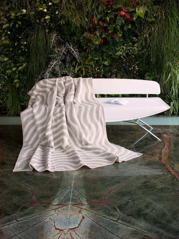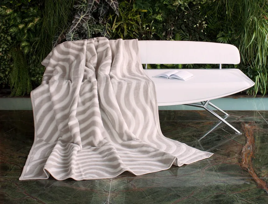 Embosovaná deka může sloužit jako nepostradatelný společník pro chladné večery, i jako vkusný bytový doplněk nebo také jako ozdobný přehoz. Vzor vlnek v tónech světlé kávy vyniká na smetanovém podkladu. Deka je olemována světle hnědou paspulí.