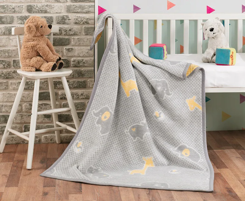 Dětská deka Snílci s vysokým podílem bavlny a hustým vlasem, hřejivá a hebká na dotek, se stane skvělým společníkem v dětském pokojíčku nebo třeba v kočárku. Hravý vzor roztomilých zvířátek vyniká díky jemnému šedo-žlutému barevnému provedení.