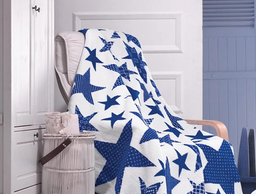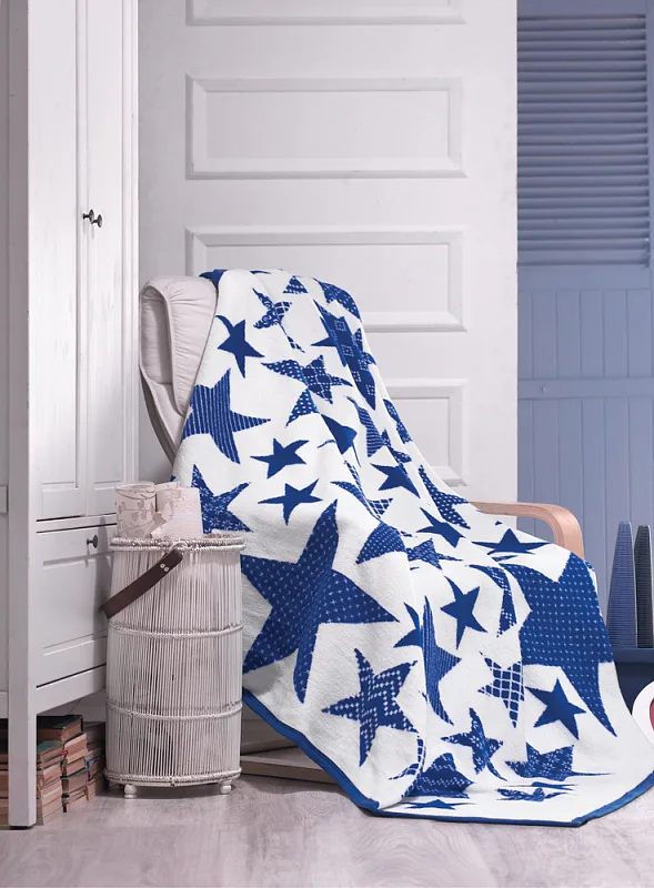 Luxusní bavlněná deka s hustým vlasem, hřejivá a hebká na omak. Nová receptura tkaní je zárukou lehkosti a skvělé prodyšnosti. Deka STAR BLUE bude jedinečným doplňkem vašeho domova a nepostradatelným společníkem pro chladné večery. Mladistvý motiv s hvězdičkami kombinuje sytou středně modrou barvu s přírodním bílým odstínem. Spodní strana deky je provedena inverzně.