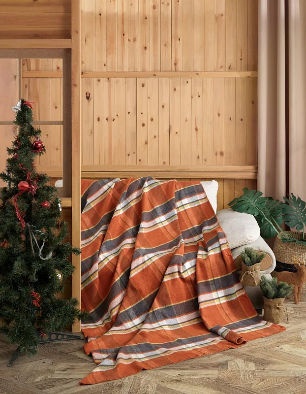 Barevné provedení je z obou stran stejné, deku zdobí po obvodu cihlově oranžové obšití.