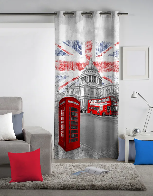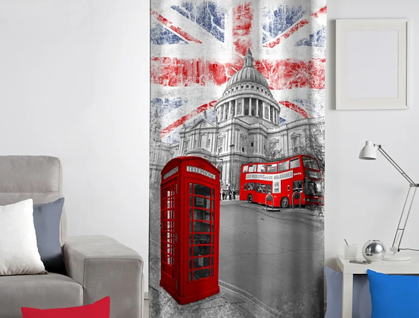 Exkluzivní kolekce dekoračních závěsů přináší mimořádný zážitek a věrné provedení fotografií. To vše díky nejmodernější digitální technologii tisku. Trendový motiv velkoměsta a symbolů v podání závěsu ENGLAND dokonale splyne s Vaším pokojem. Výrazné červené a modré prvky dokonale vyniknou na šedém podkladu. Jistě oceníte i látku s velmi hustou a pevnou strukturou, vyrobenou ze 100% bavlny, kterou jsme opatřili tzv. sametovým povrchem. Potisk je jednostranný.