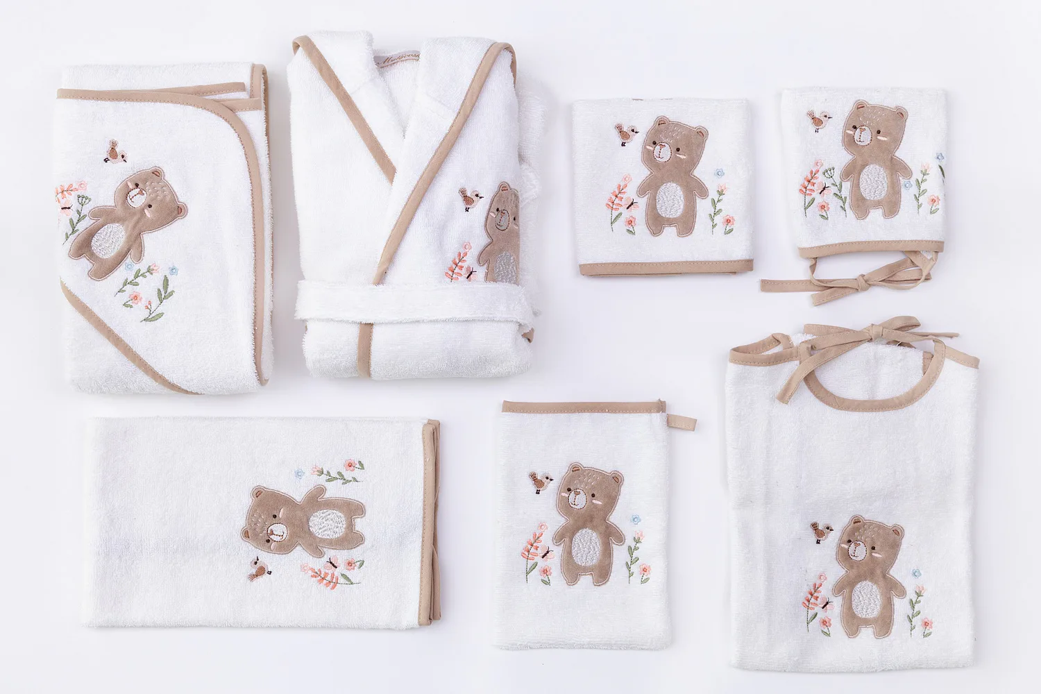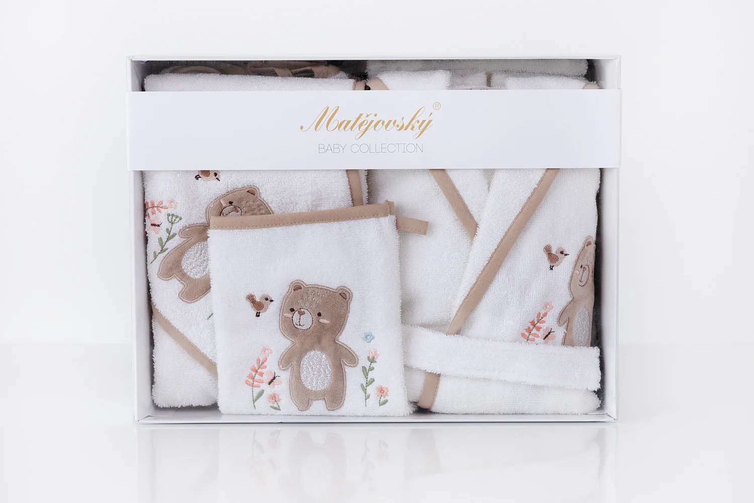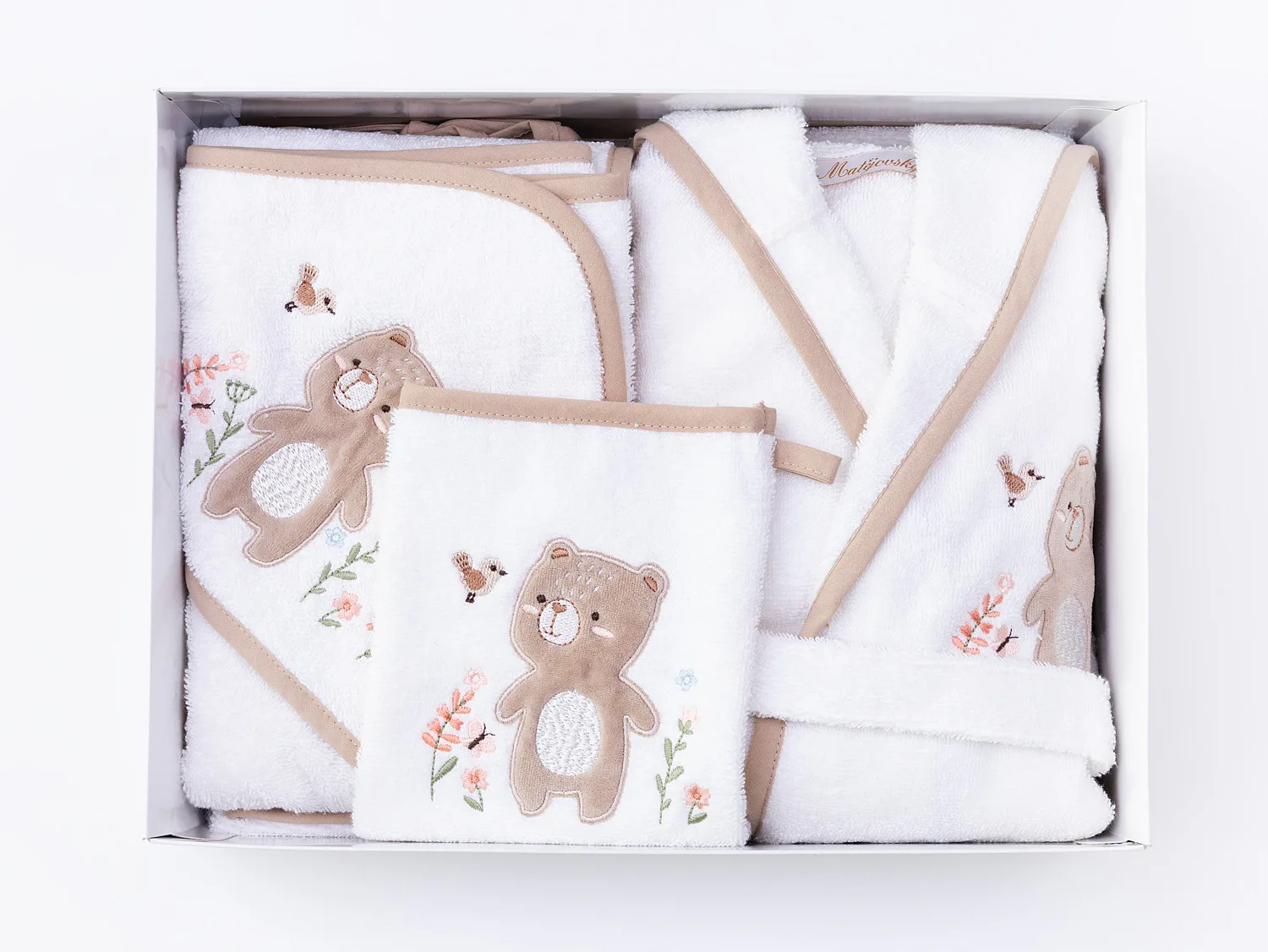 Kromě praktičnosti a využitelnosti všech doplňků přináší tento set i okouzlující design, který podtrhují propracované roztomilé výšivky a barevně sladěné lemování. Dárková froté výbavička Méďa s výšivkou hravého medvídka je díky béžovému lemování neutrální a hodí se pro děvčátka i chlapce.
