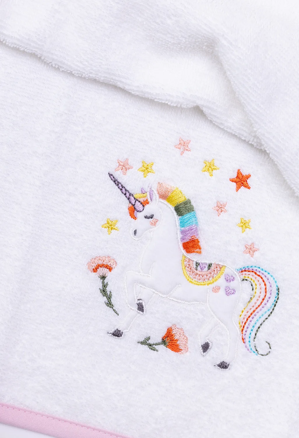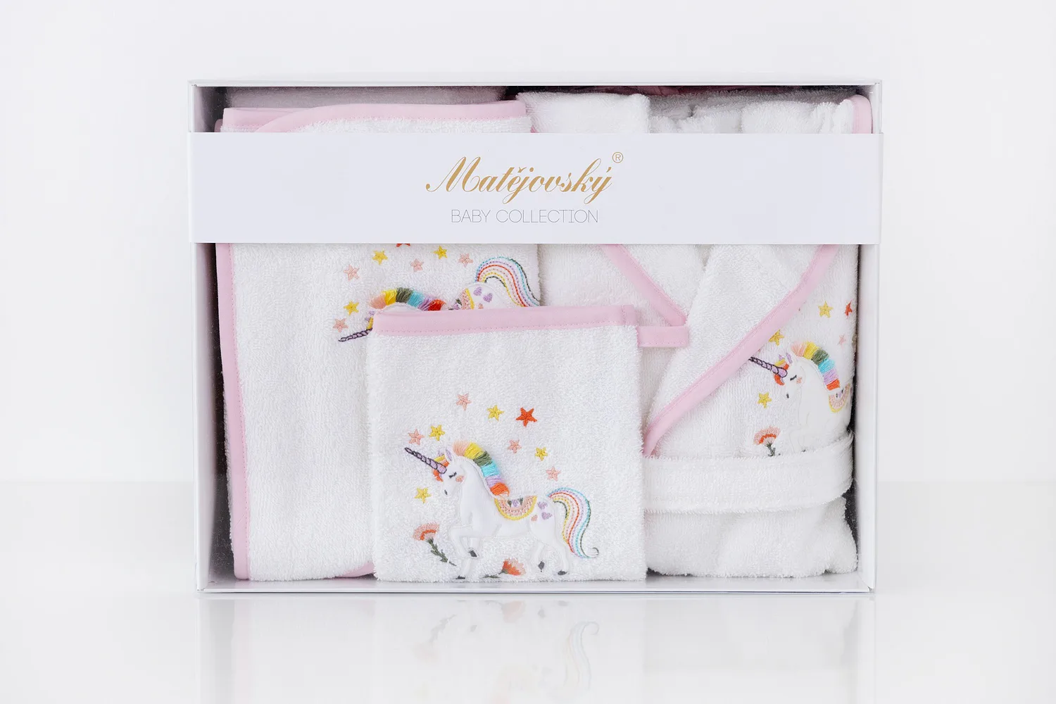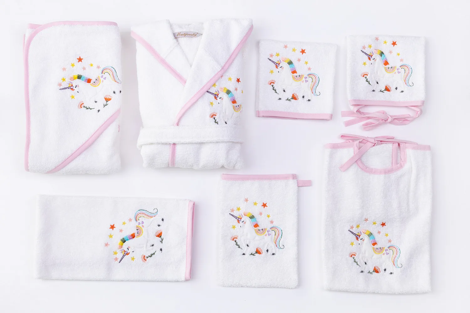 Kromě praktičnosti a využitelnosti všech doplňků přináší tento set i okouzlující design, který podtrhují propracované roztomilé výšivky a barevně sladěné lemování. Dárková froté výbavička Unicorn s výšivkou oblíbeného jednorožce je díky růžovému lemování vhodná pro malé princezny.