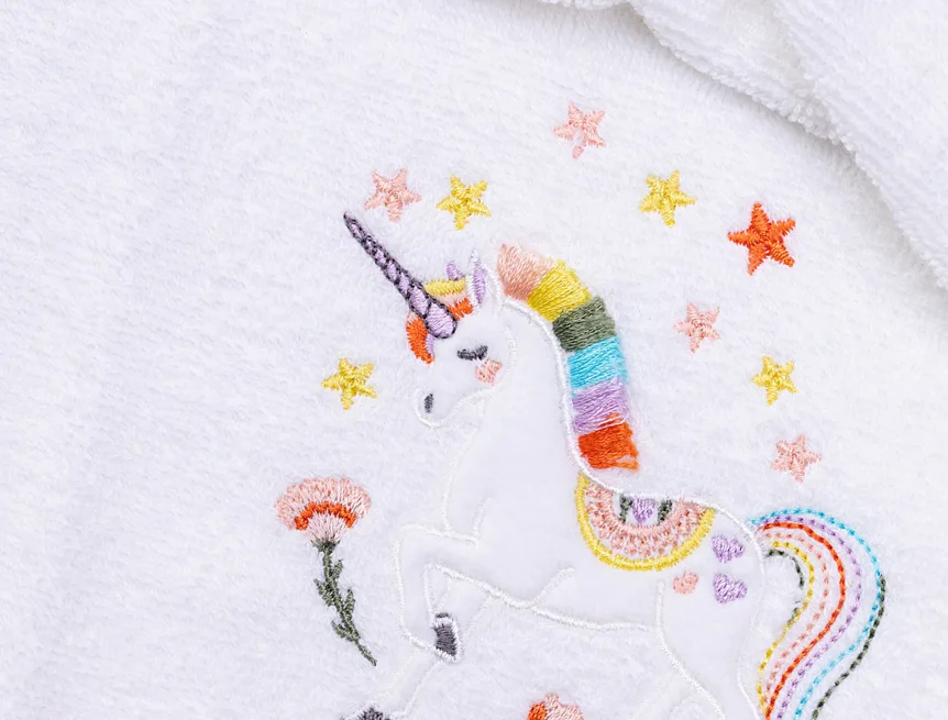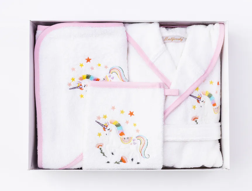 Kromě praktičnosti a využitelnosti všech doplňků přináší tento set i okouzlující design, který podtrhují propracované roztomilé výšivky a barevně sladěné lemování. Dárková froté výbavička Unicorn s výšivkou oblíbeného jednorožce je díky růžovému lemování vhodná pro malé princezny.