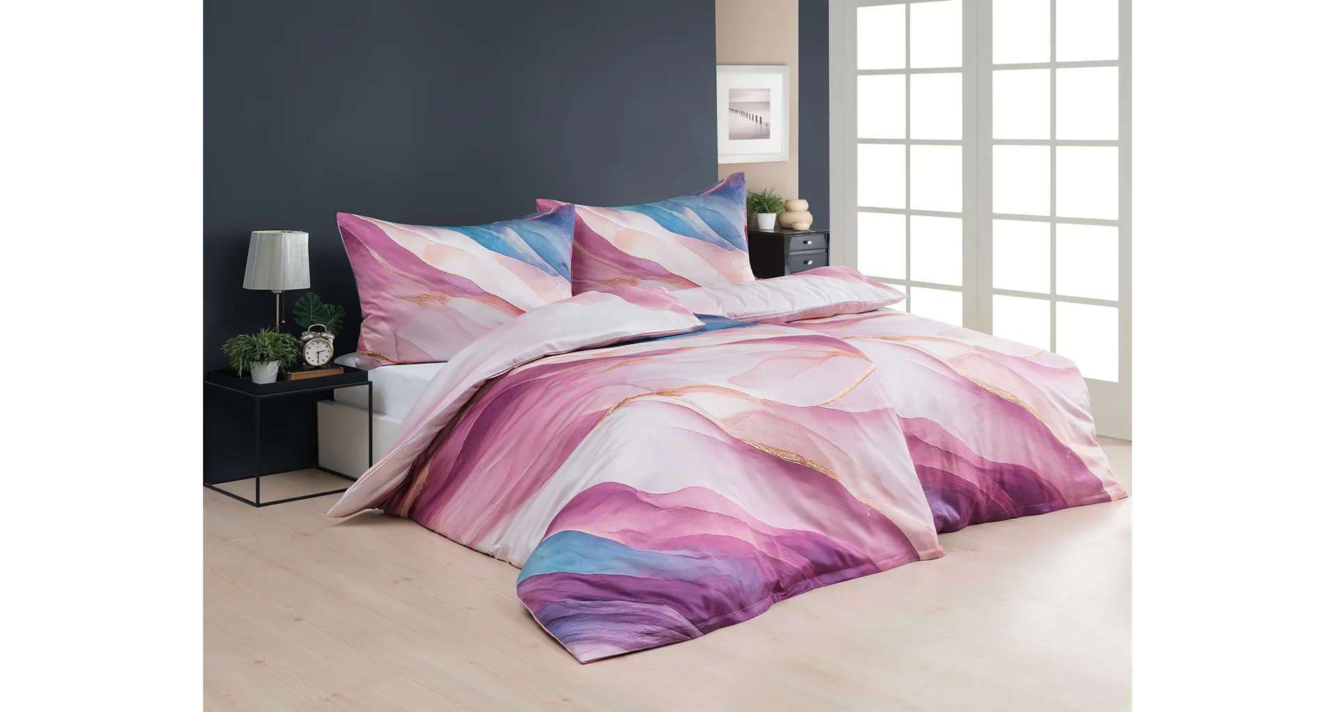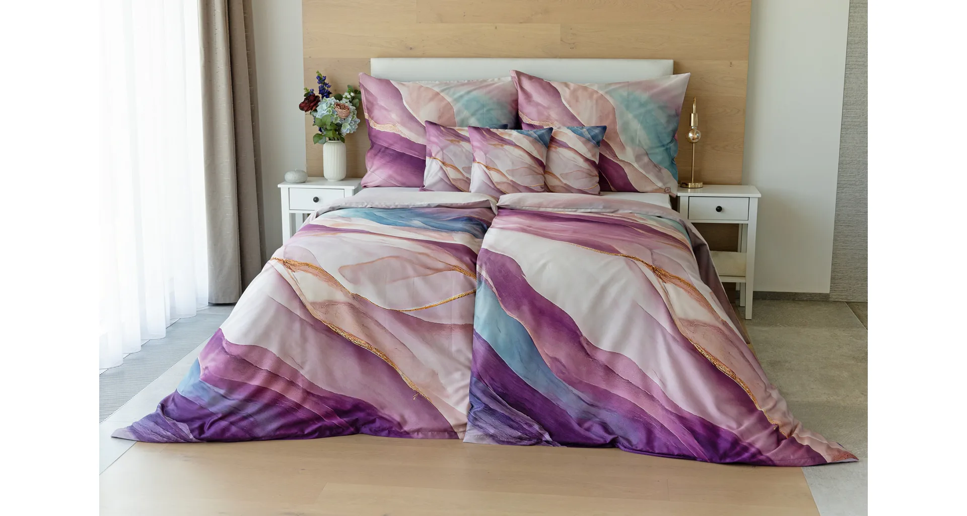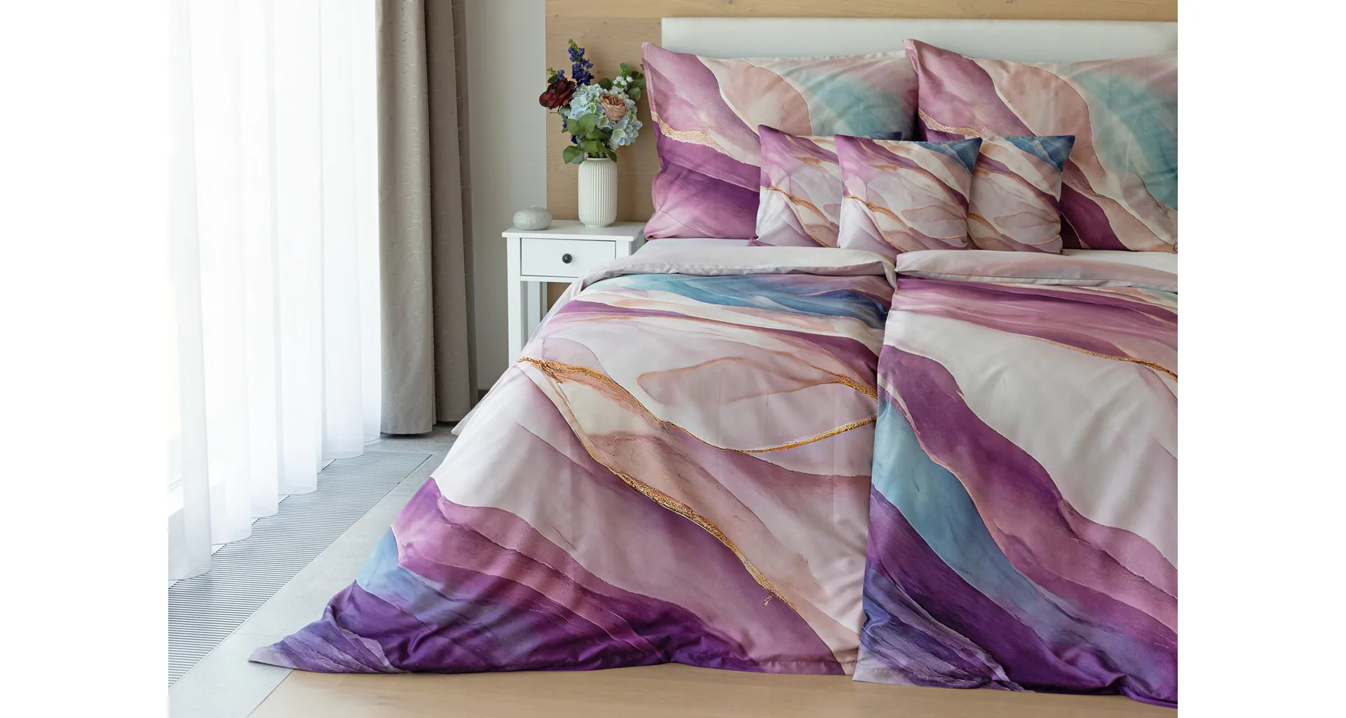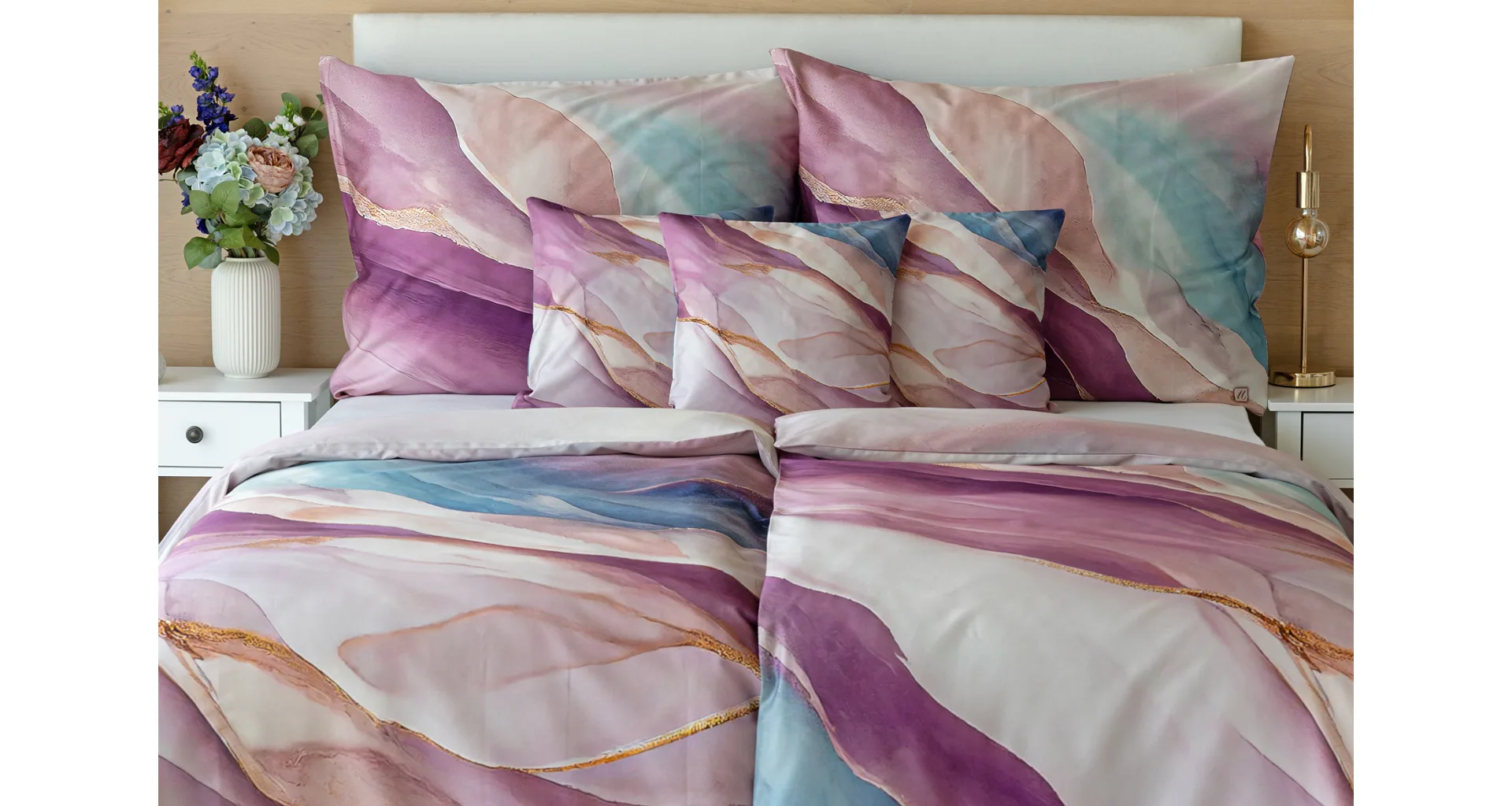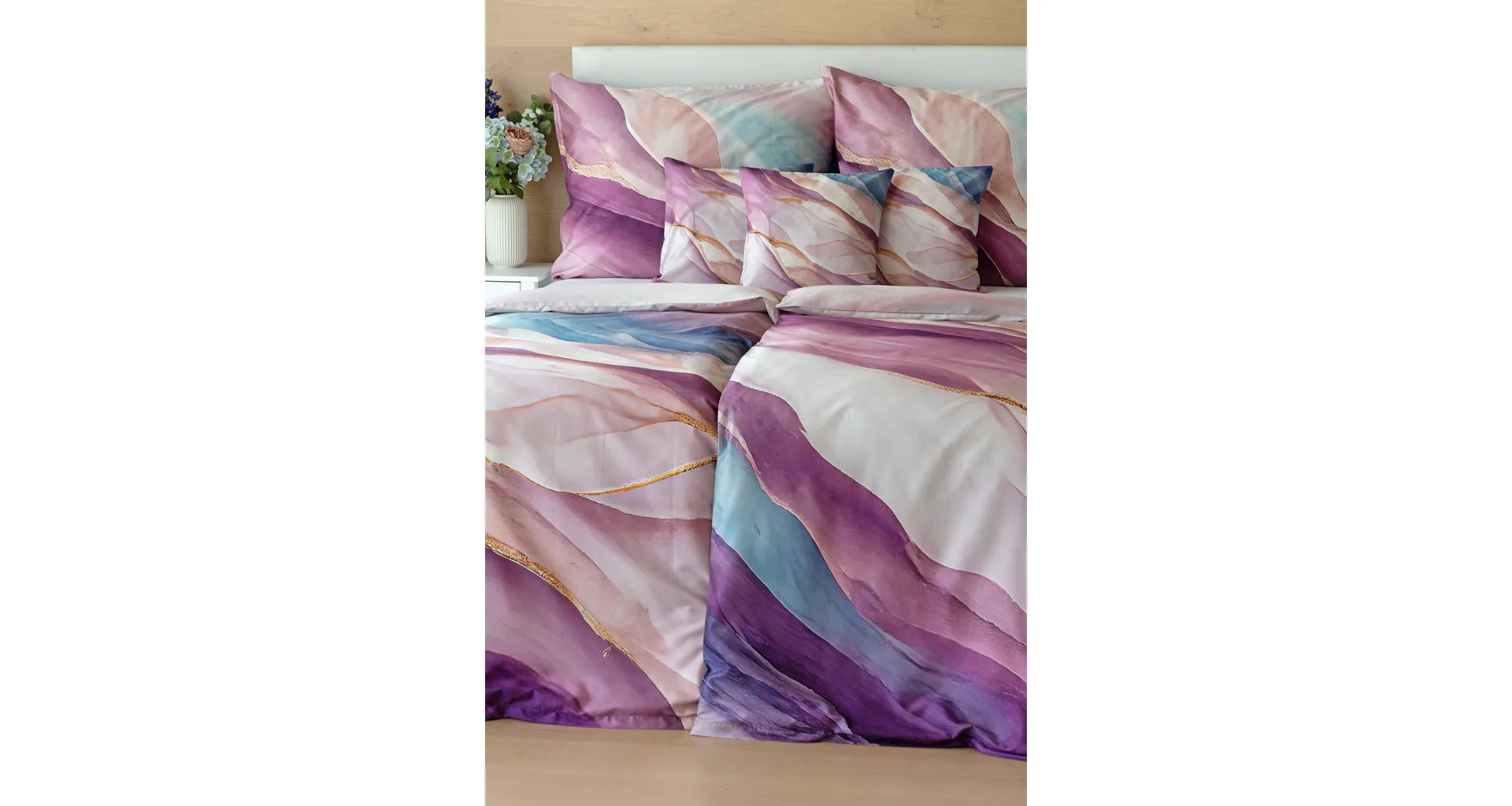 Saténové obliečky Dionna si vás získajú na prvý pohľad. Vychutnaje si dokonalé súznenie pudrových, ružových, fialových a modrých tónov v tomto extravagantnom vzore. O váš pohodlný spánok sa postará 100% prvotriedna bavlna v hebkej atlasovej väzbe.