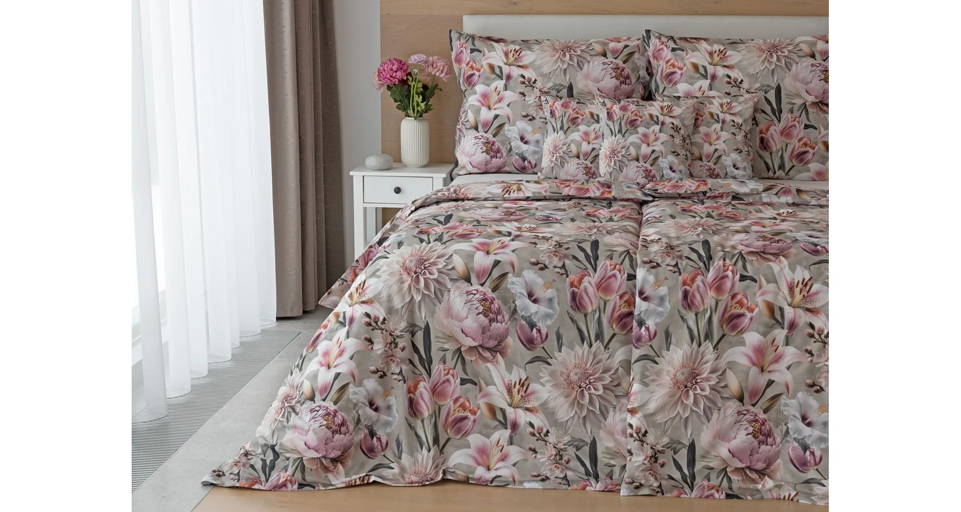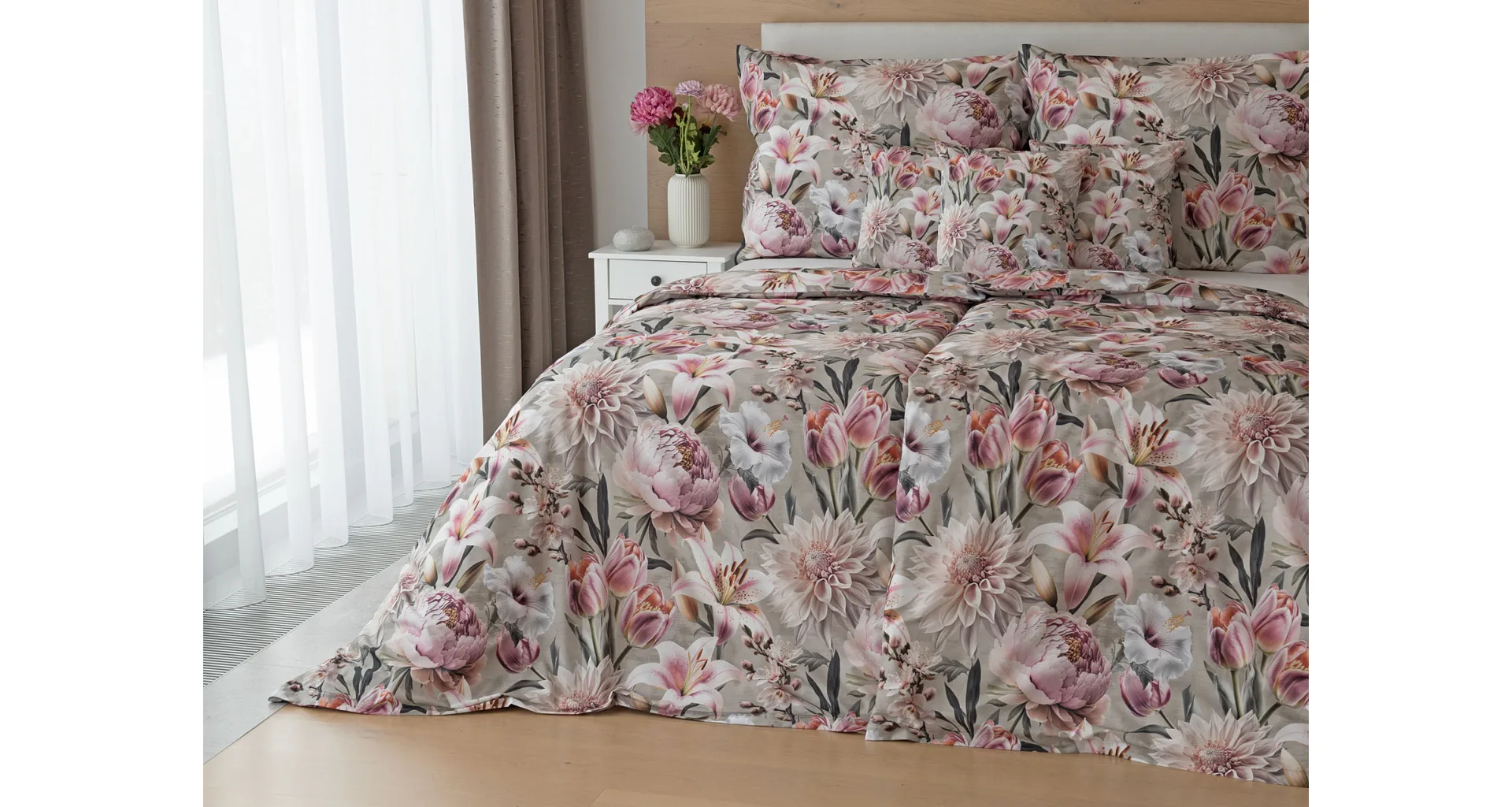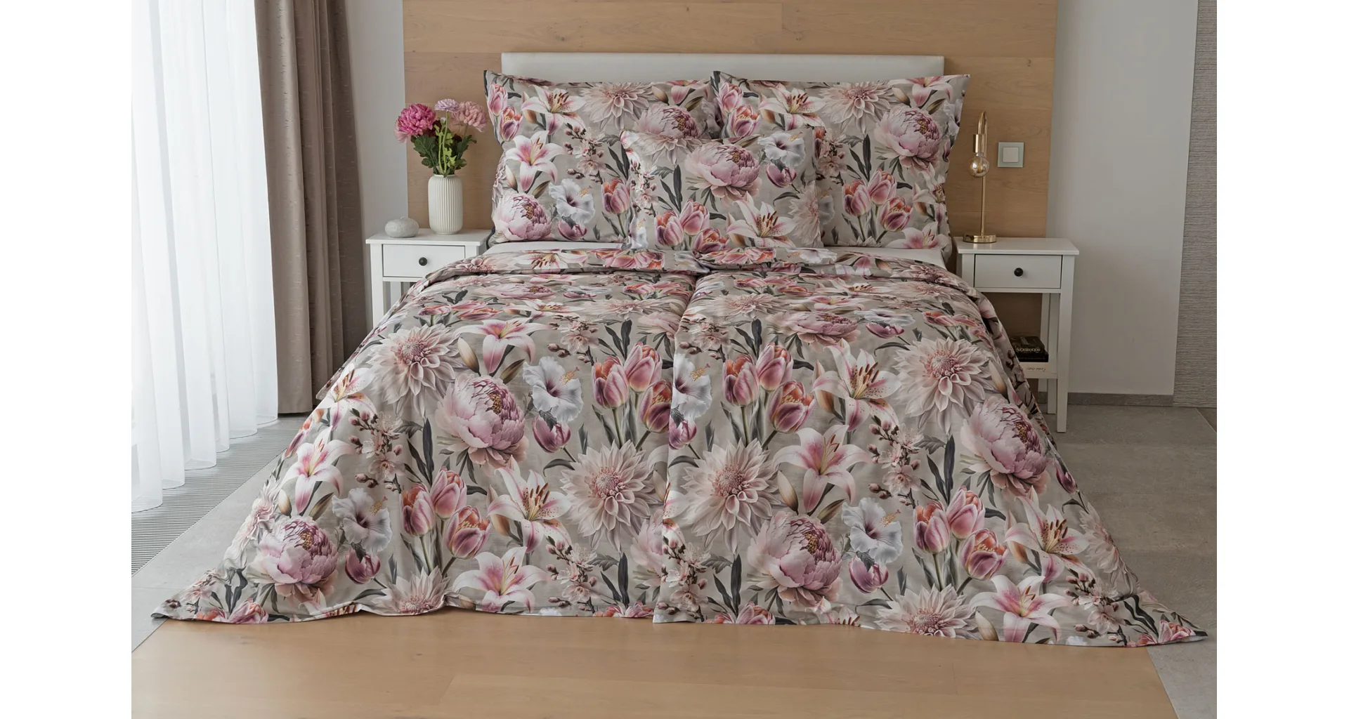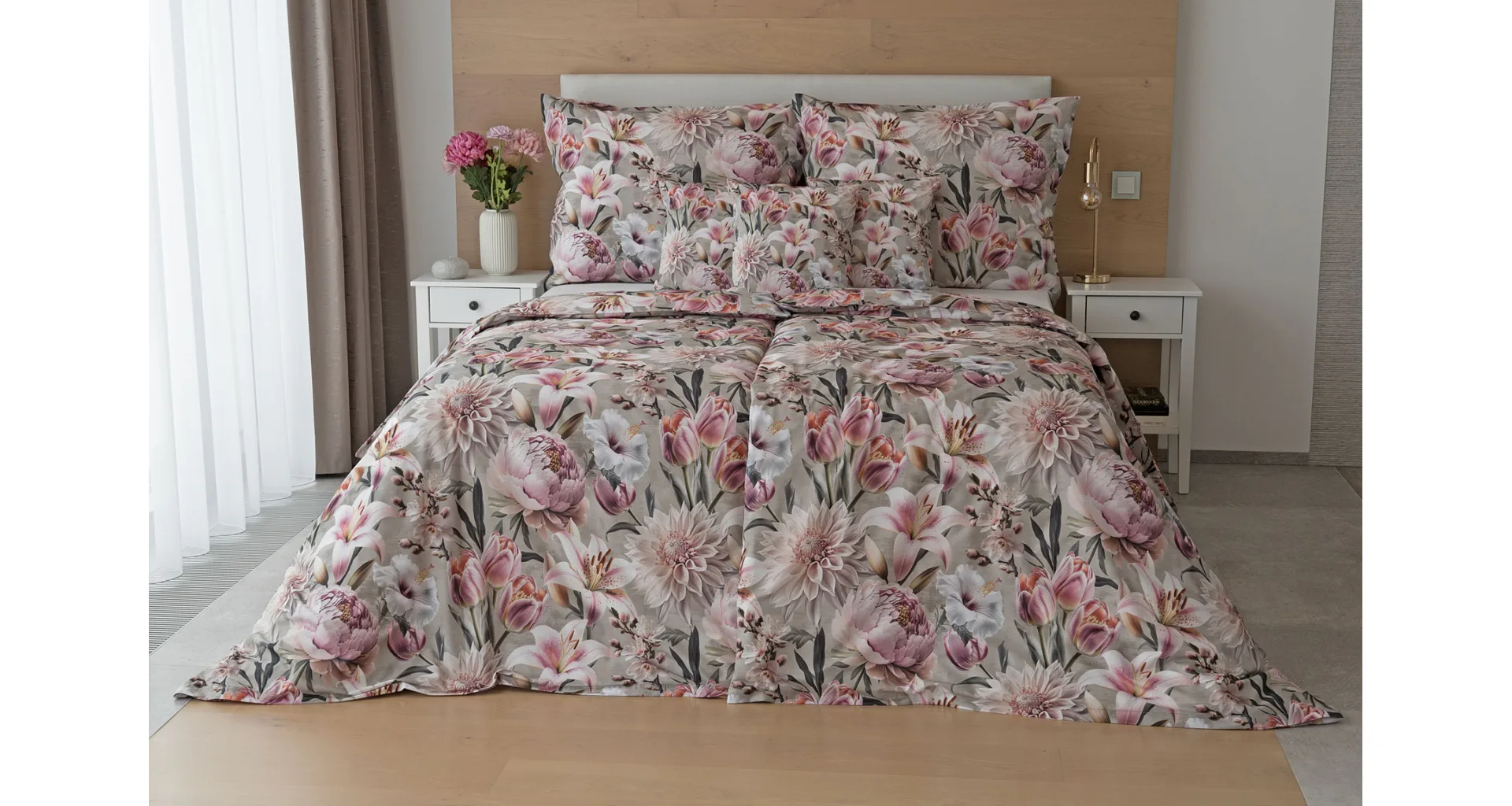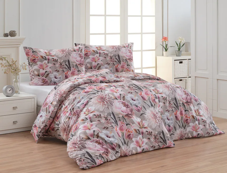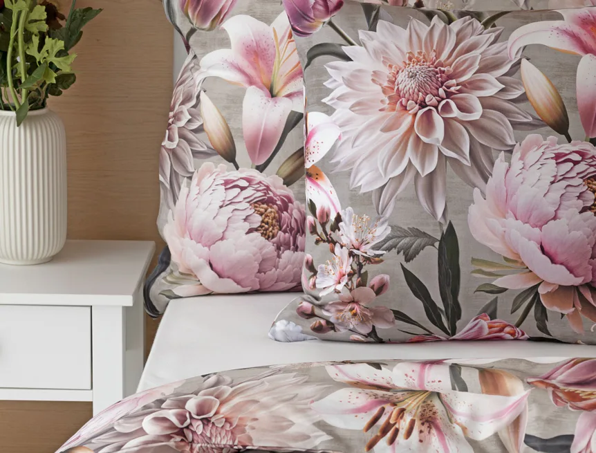 Kvetinovú symfóniu rozohrávajú bavlnené obliečky Estel, s ktorými vaša spálňa zažiari. Pestrofarebné kvety na tlmenom svetlo fialovom podklade vynikajú v precíznom detaile vďaka najmodernejšej digitálnej tlačovej techológii.