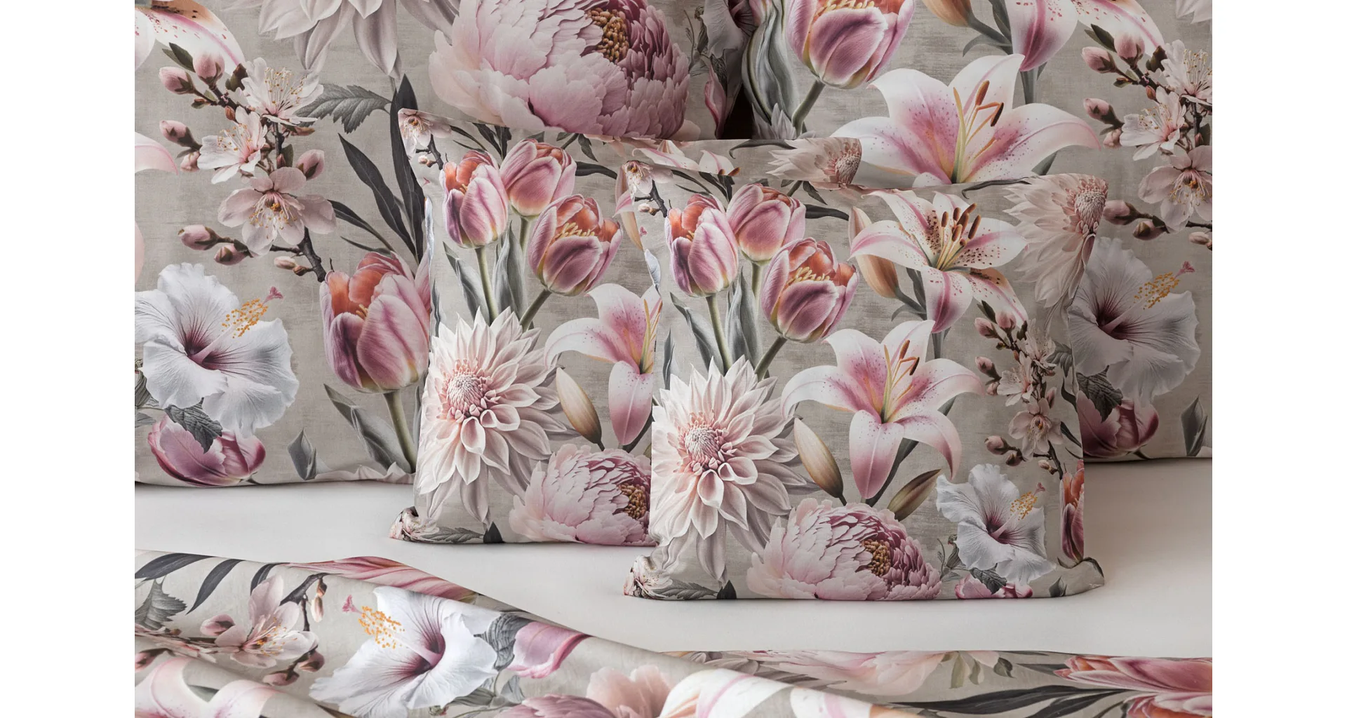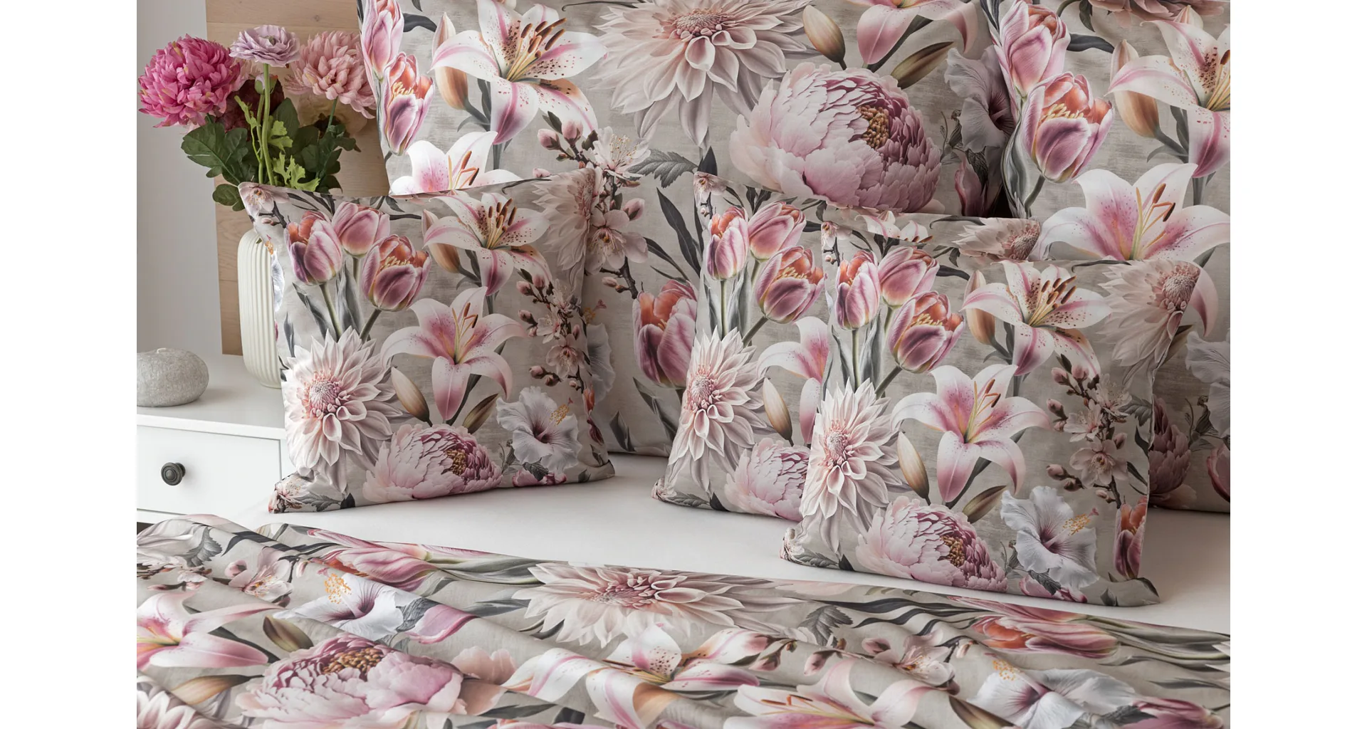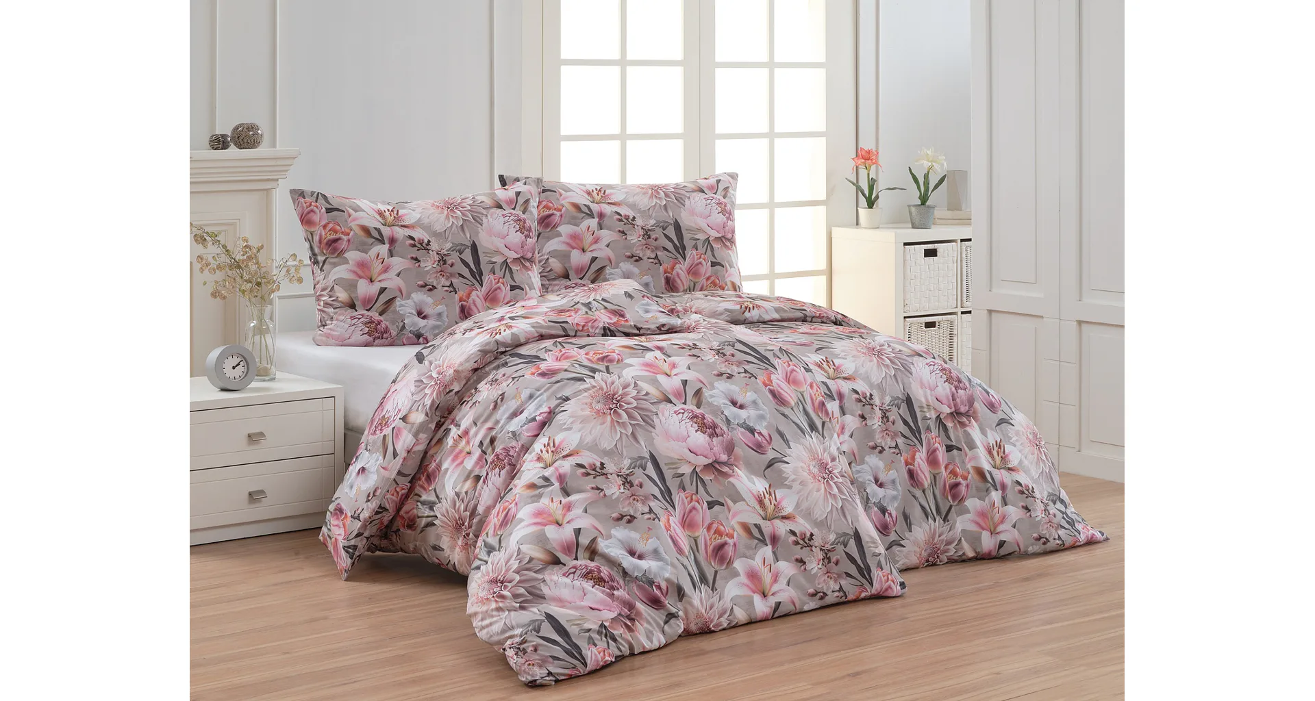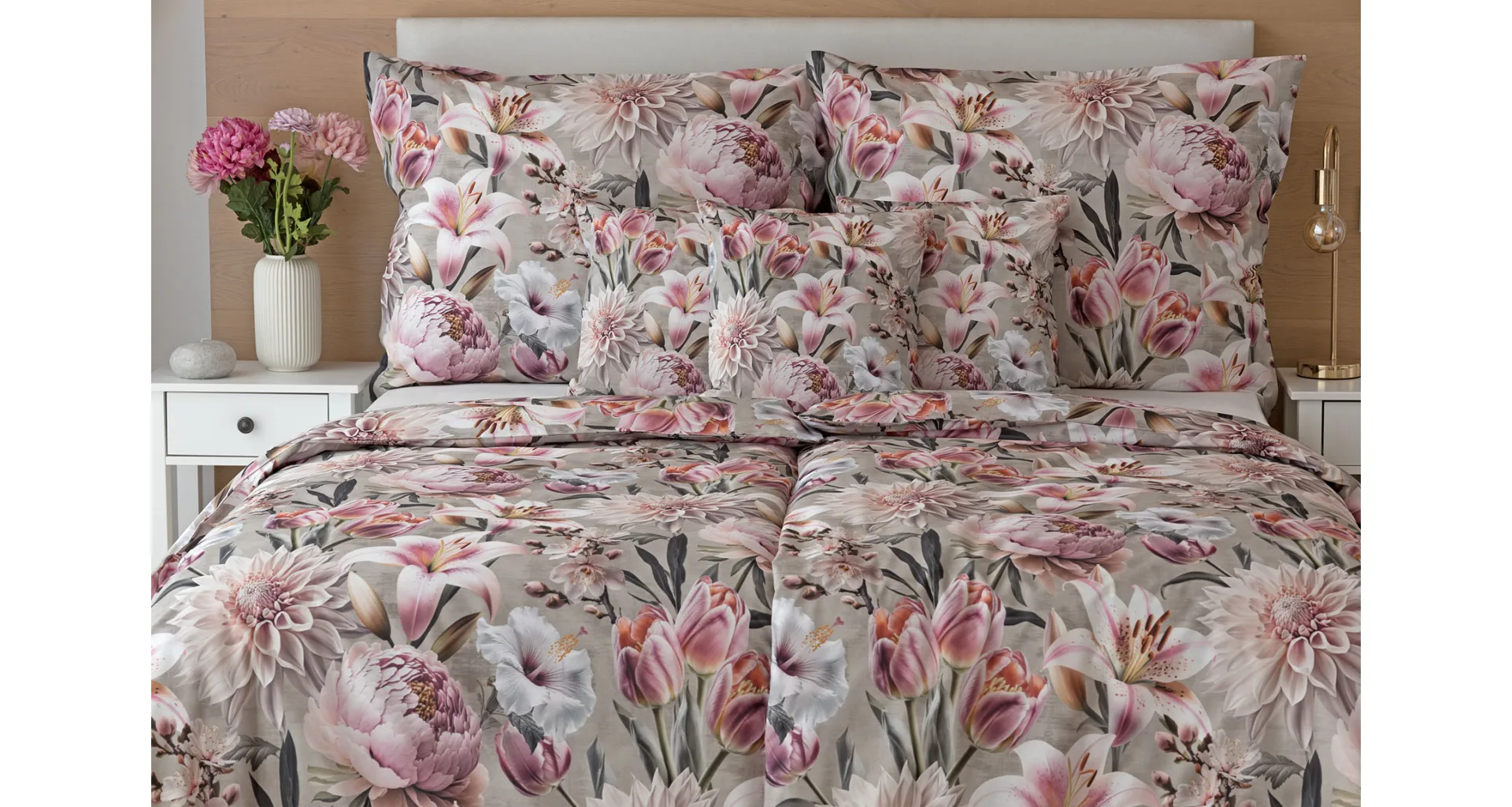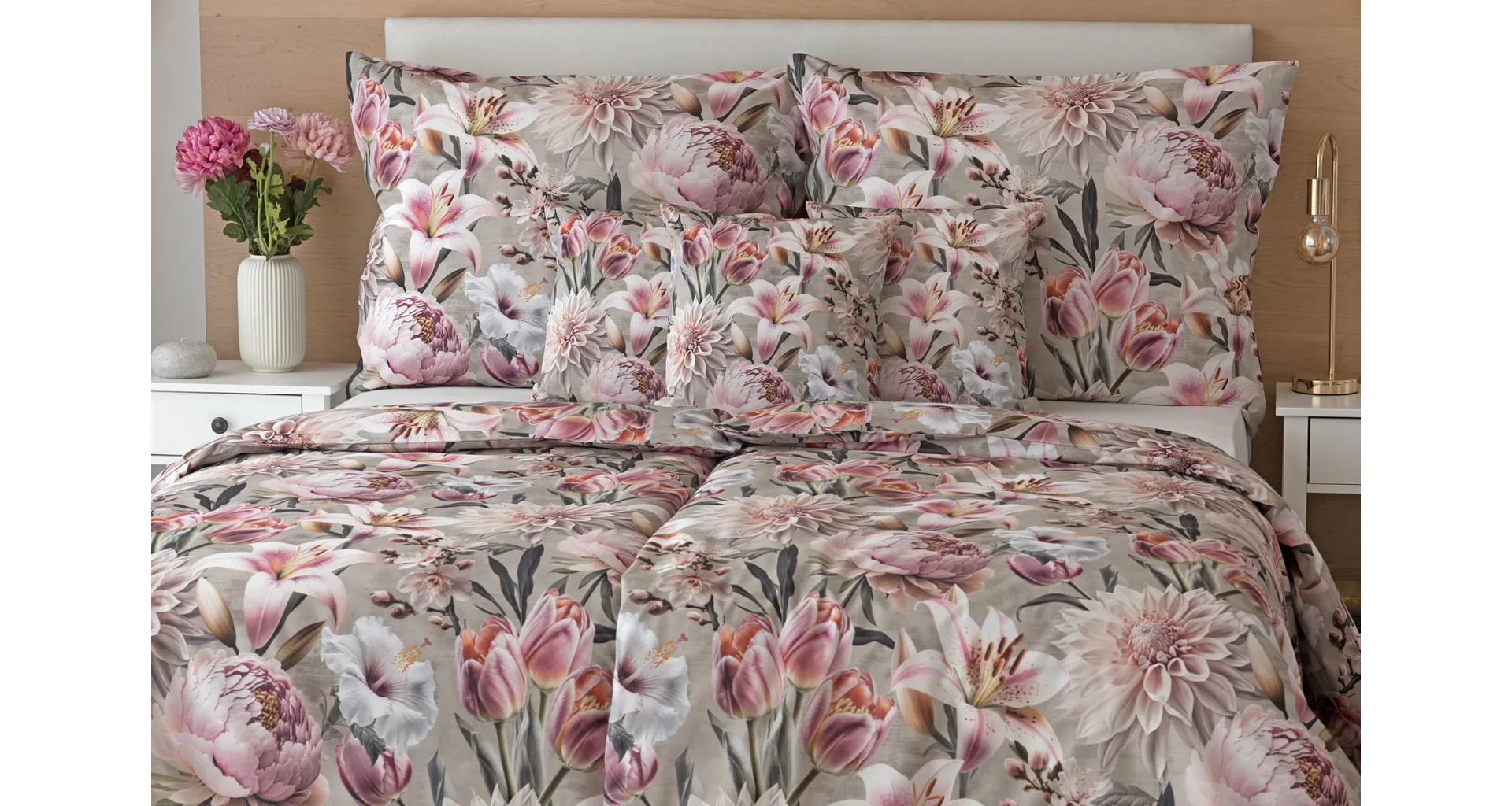 Kvetinovú symfóniu rozohrávajú bavlnené obliečky Estel, s ktorými vaša spálňa zažiari. Pestrofarebné kvety na tlmenom svetlo fialovom podklade vynikajú v precíznom detaile vďaka najmodernejšej digitálnej tlačovej techológii.