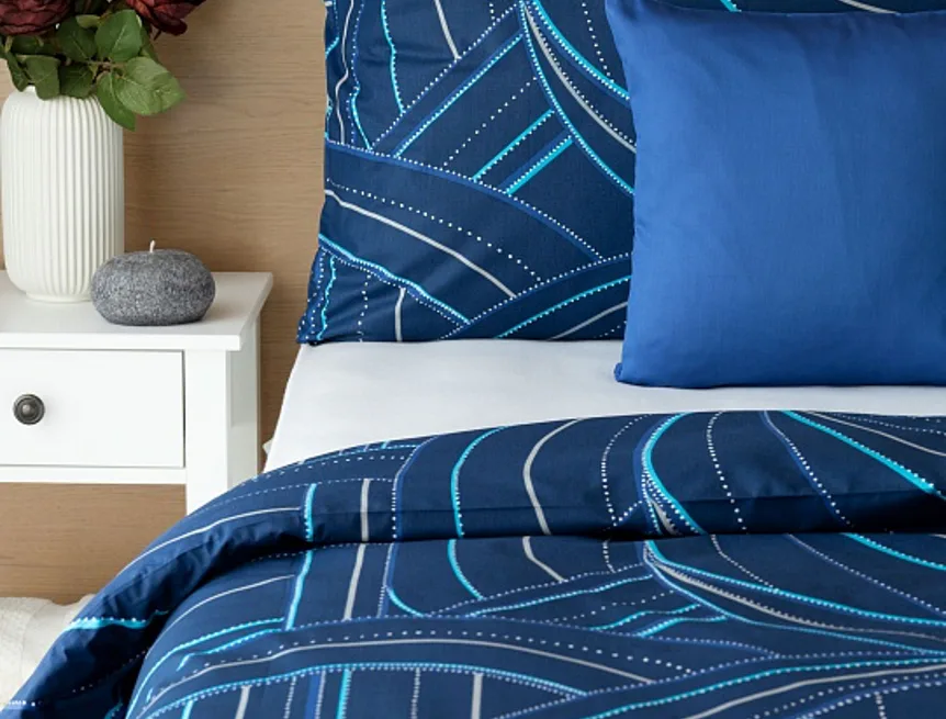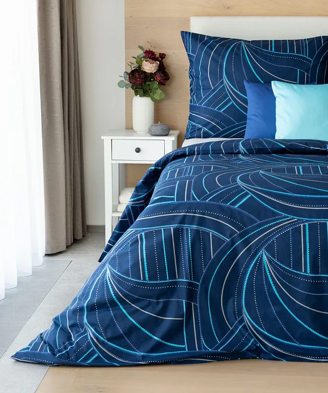 Bavlnené obliečky Ezio Blue s originálnym geometrickým vzorom sa stanú ozdobou každého moderného interiéru. Podklad v tmavo modrej farbe zdobia obrazce tvorené linkami v odtieňoch modrej, tyrkysovej a šedej. Plastickosť vzoru dokreslujú jemné biele bodky v konturách liniek.