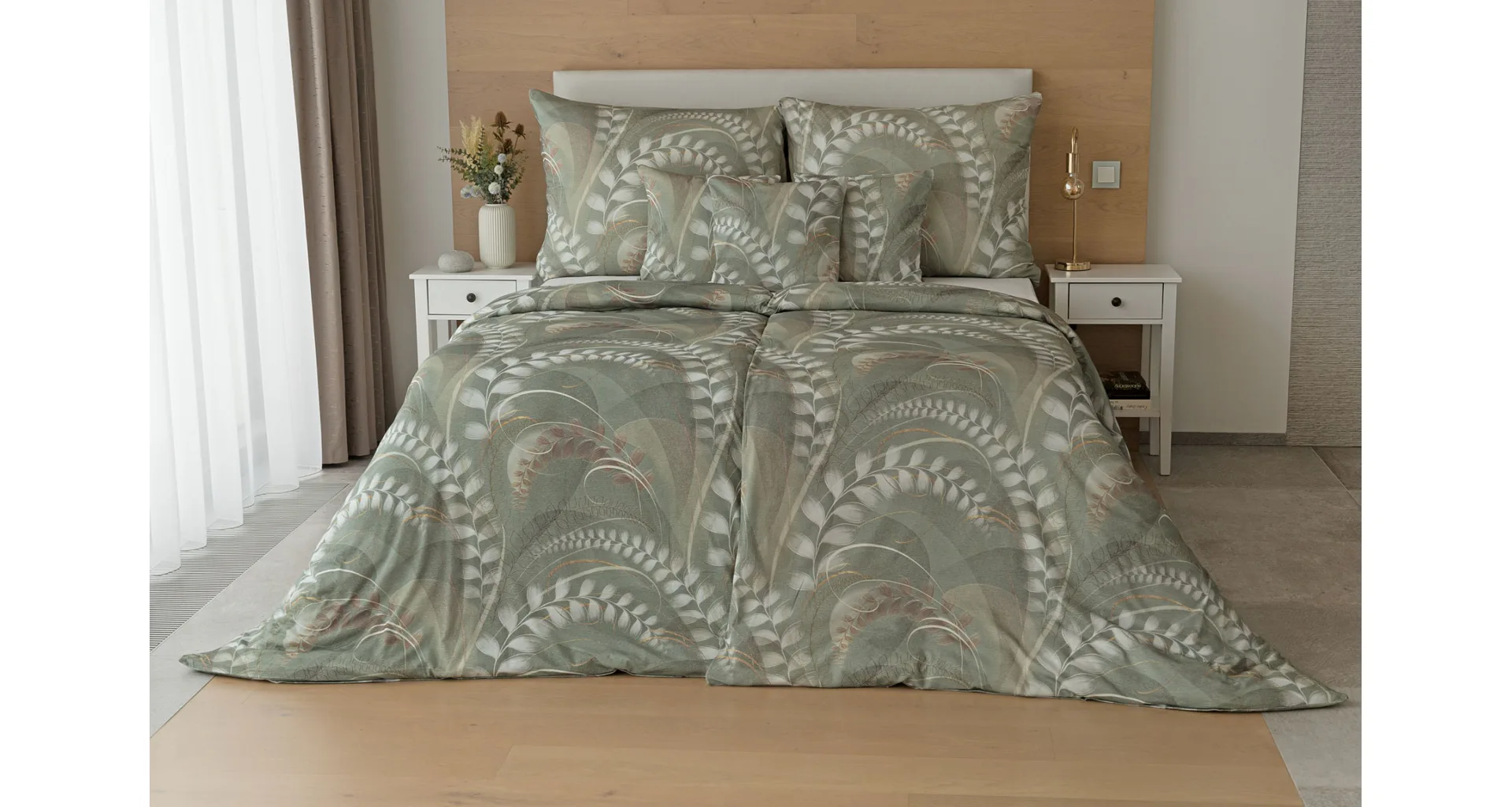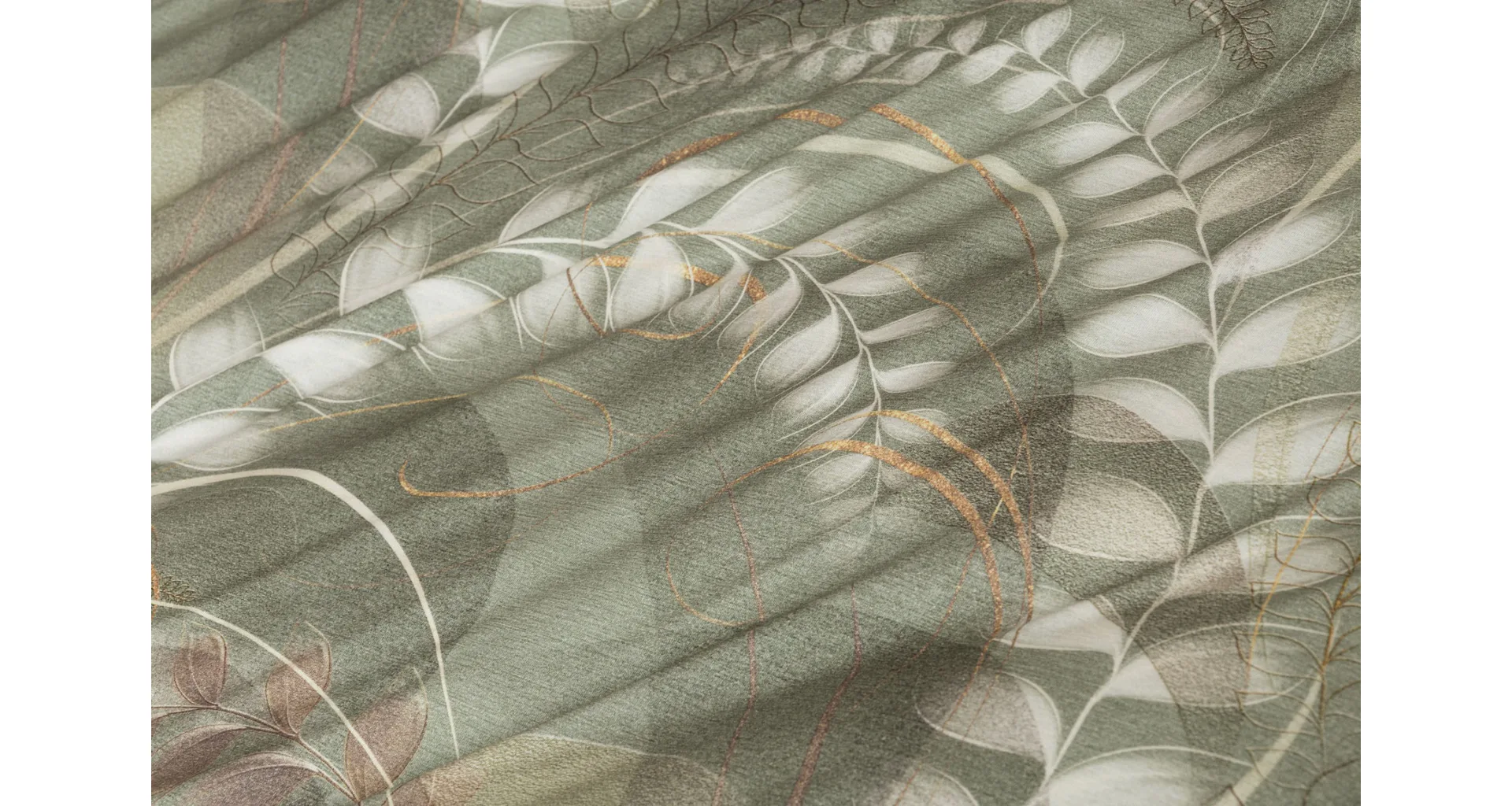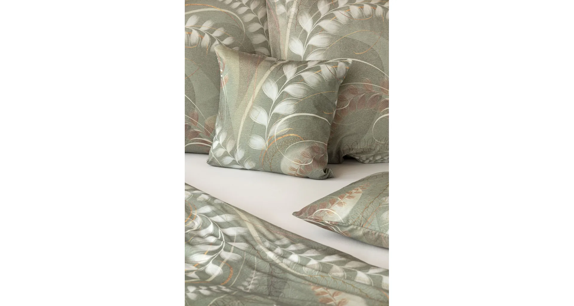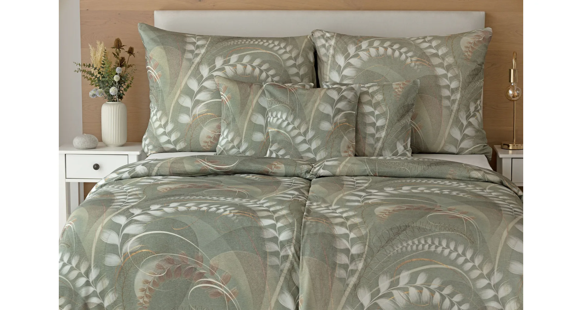 Pre novú kolekciu posteľných obliečok Mako jersey sme starostlivo vybrali motívy, ktoré sa tomuto pružnému materiálu hodia. Vzor Ezra s elegantným motívom v palete krémových a zlatohnedých tónov na tlmenom zelenošedom podklade vnesie do vašej spálne nádych sviežosti.