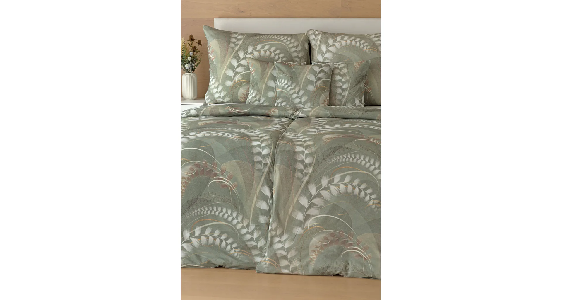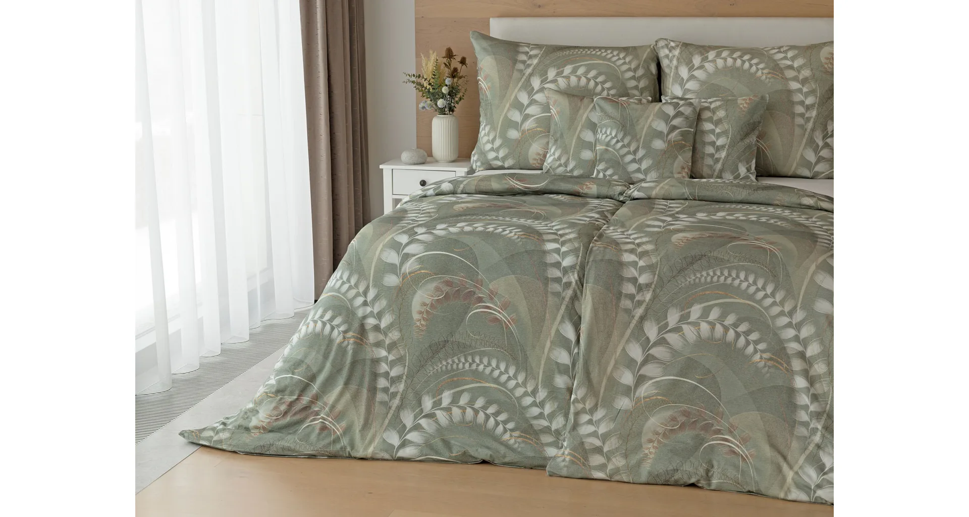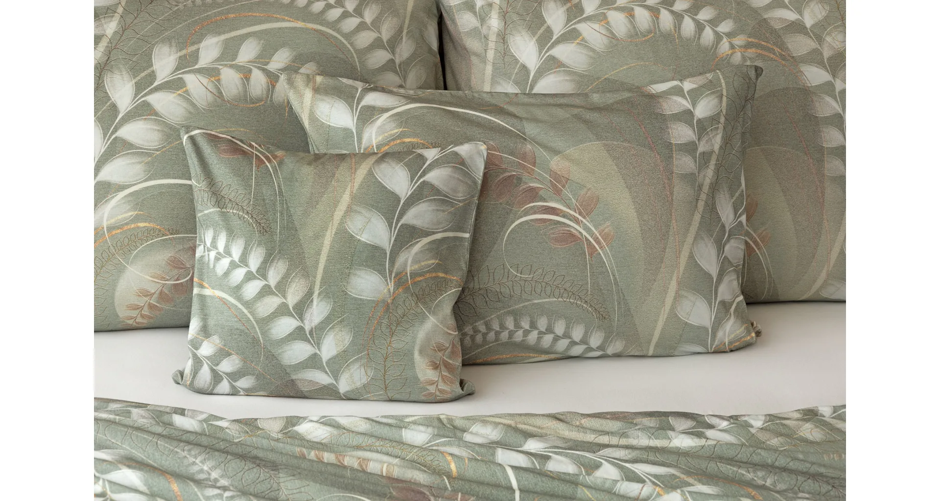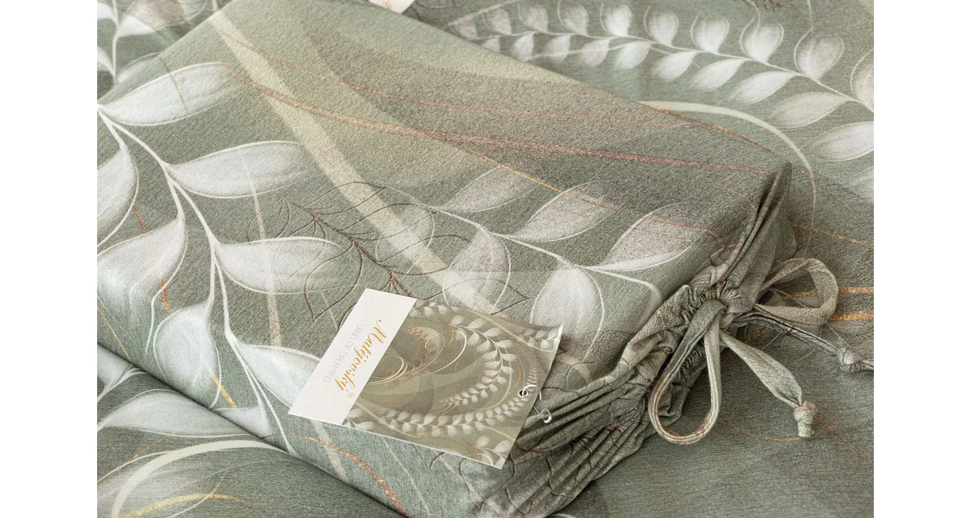 Pre novú kolekciu posteľných obliečok Mako jersey sme starostlivo vybrali motívy, ktoré sa tomuto pružnému materiálu hodia. Vzor Ezra s elegantným motívom v palete krémových a zlatohnedých tónov na tlmenom zelenošedom podklade vnesie do vašej spálne nádych sviežosti.
