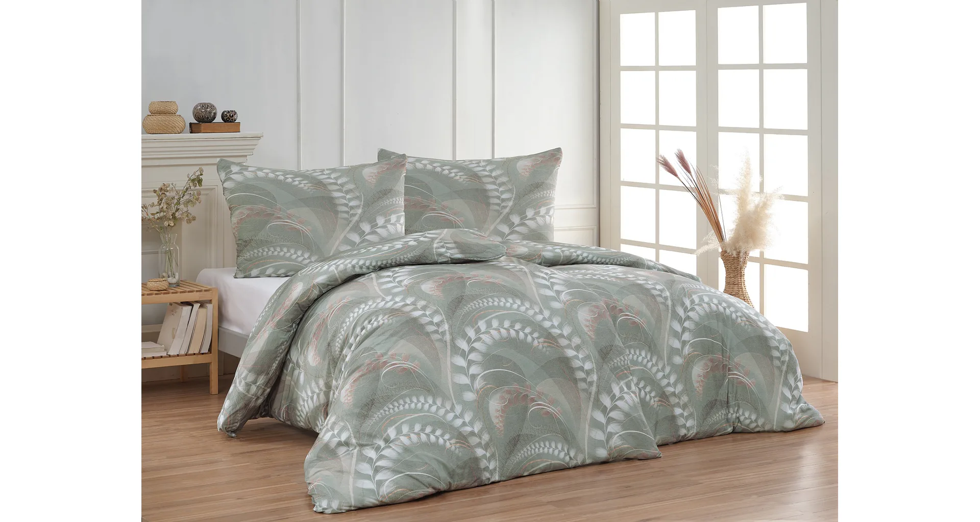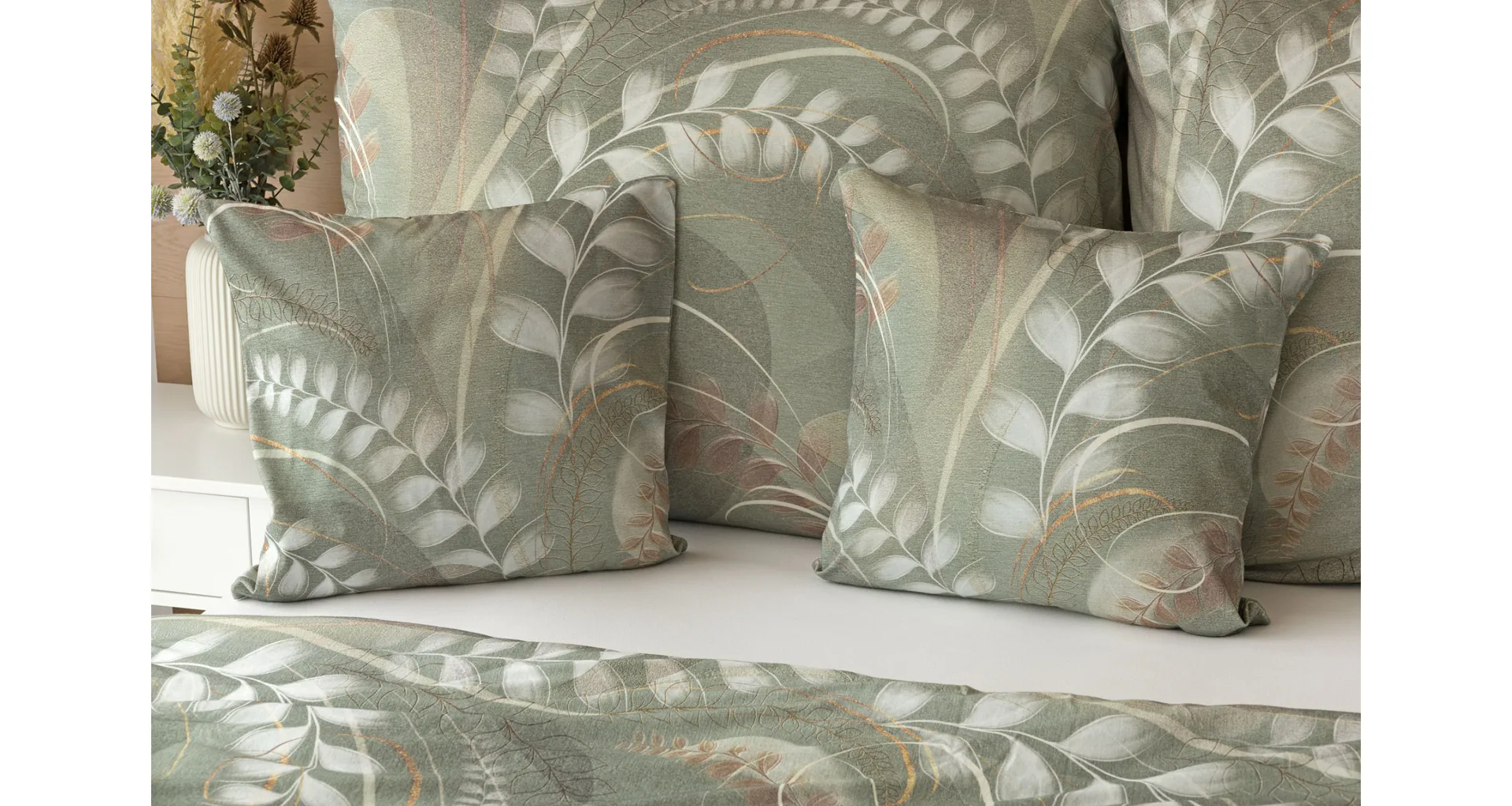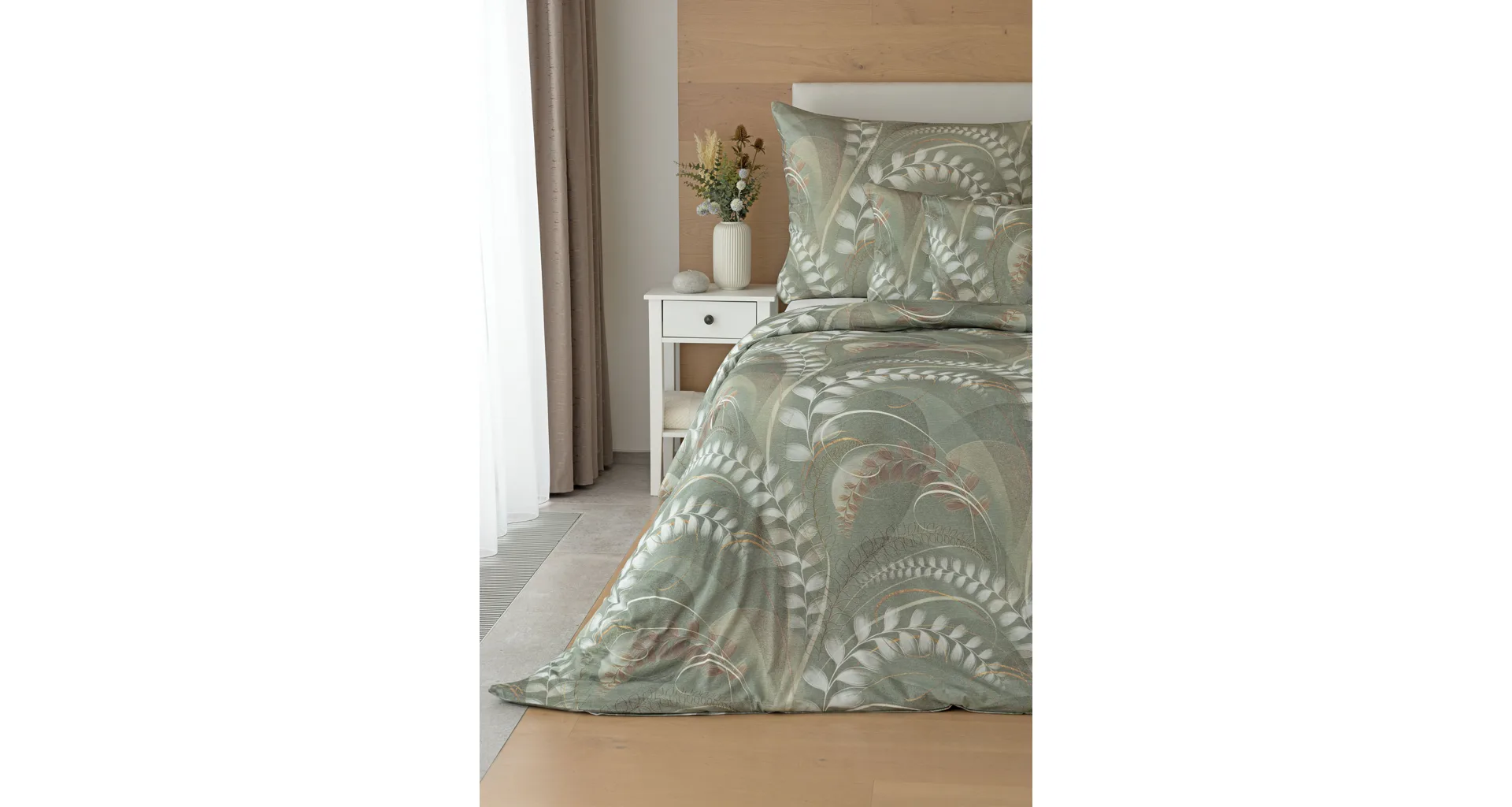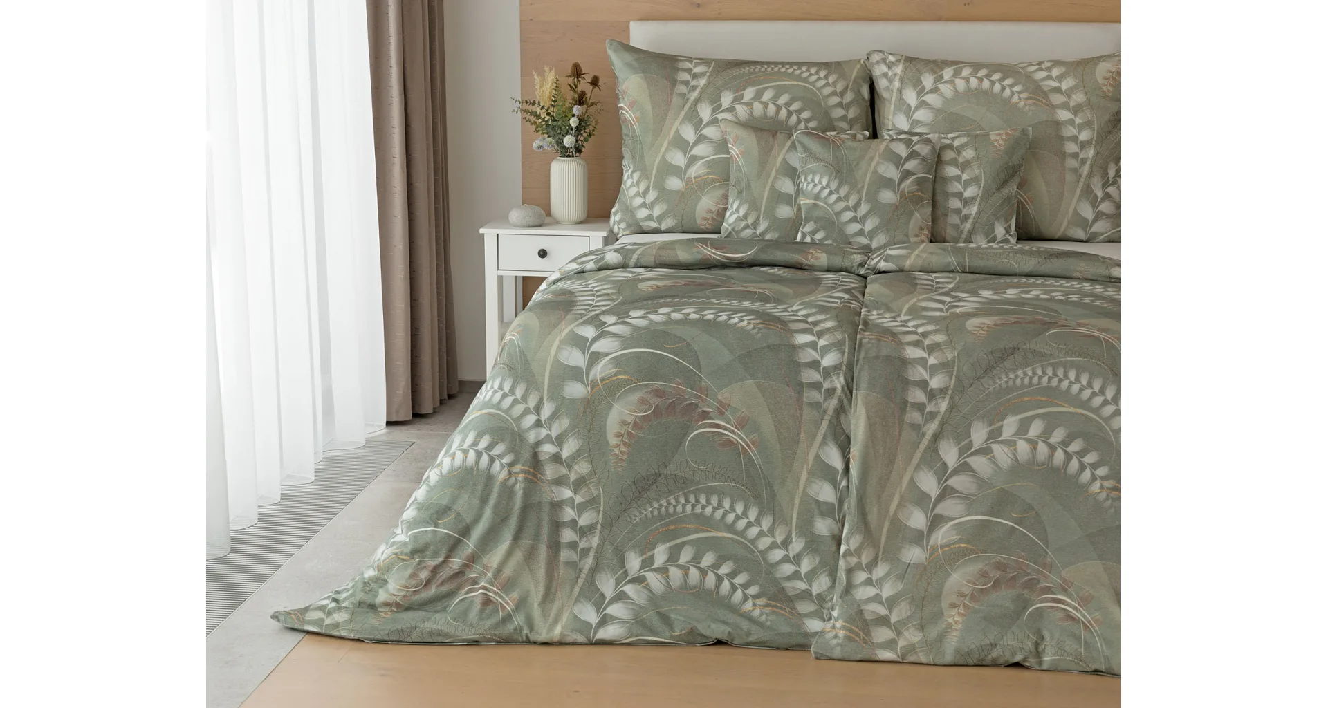 Pre novú kolekciu posteľných obliečok Mako jersey sme starostlivo vybrali motívy, ktoré sa tomuto pružnému materiálu hodia. Vzor Ezra s elegantným motívom v palete krémových a zlatohnedých tónov na tlmenom zelenošedom podklade vnesie do vašej spálne nádych sviežosti.