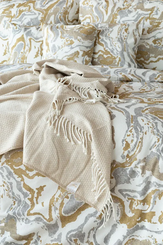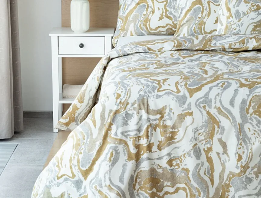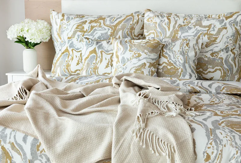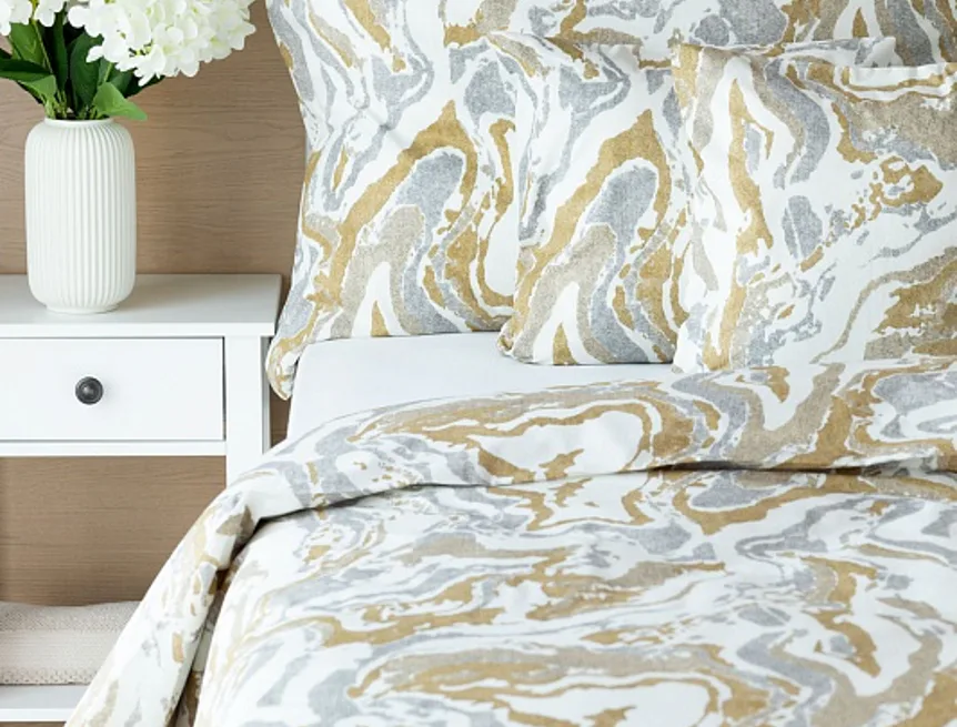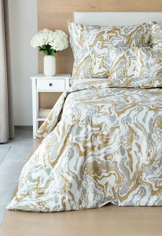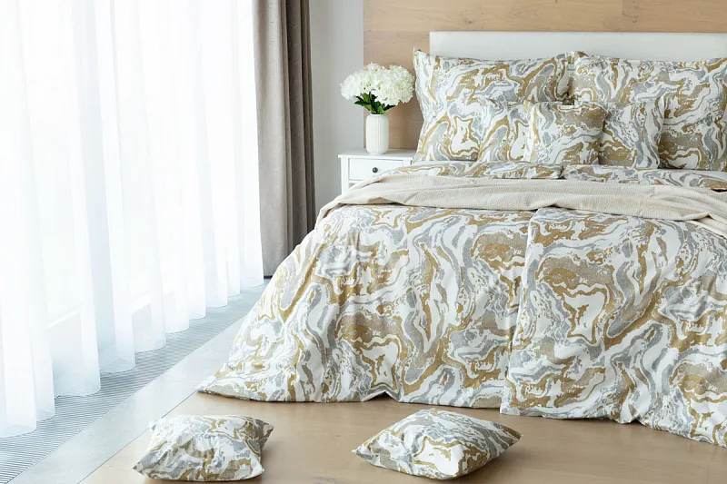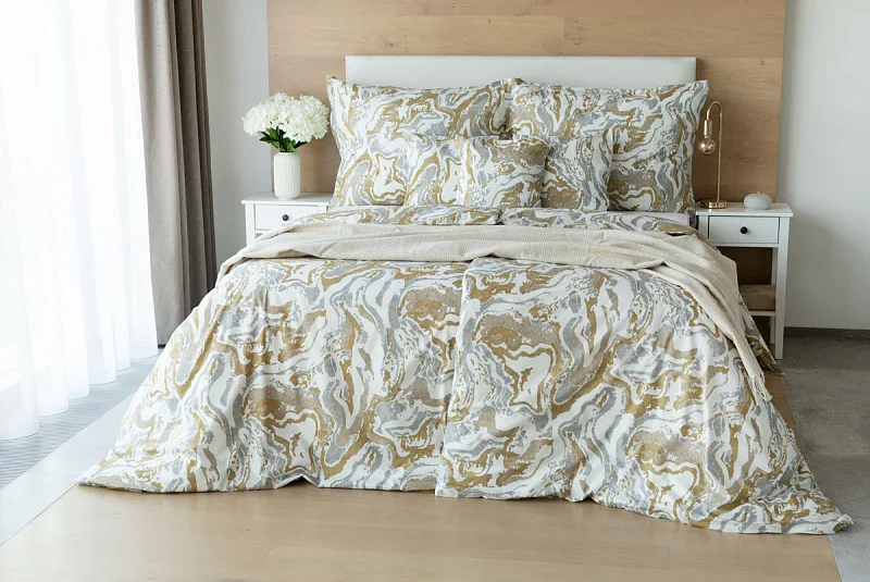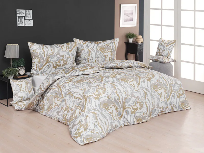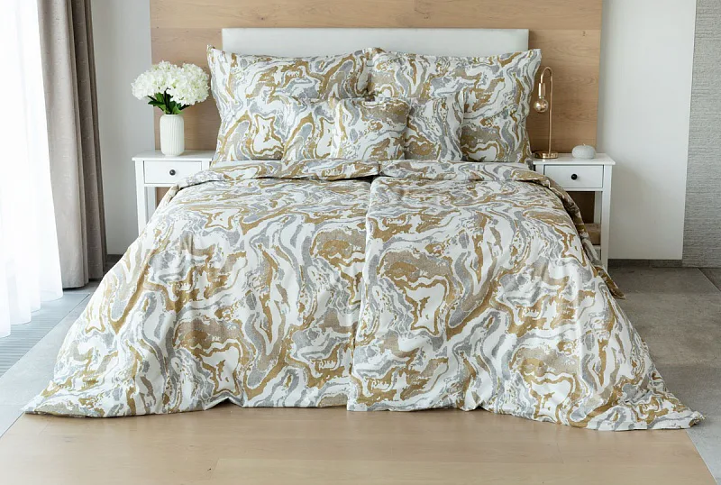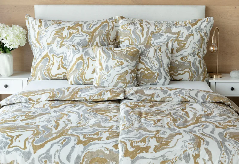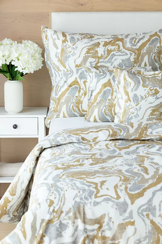 S posteľnými obliečkami Fiona bude vaša spálňa svieža a zcela originálna. Nadčasový mramorový vzor v odtieňoch šedej, okrovej a krémovo bielej sa stane ozdobou každého moderného interiéru.