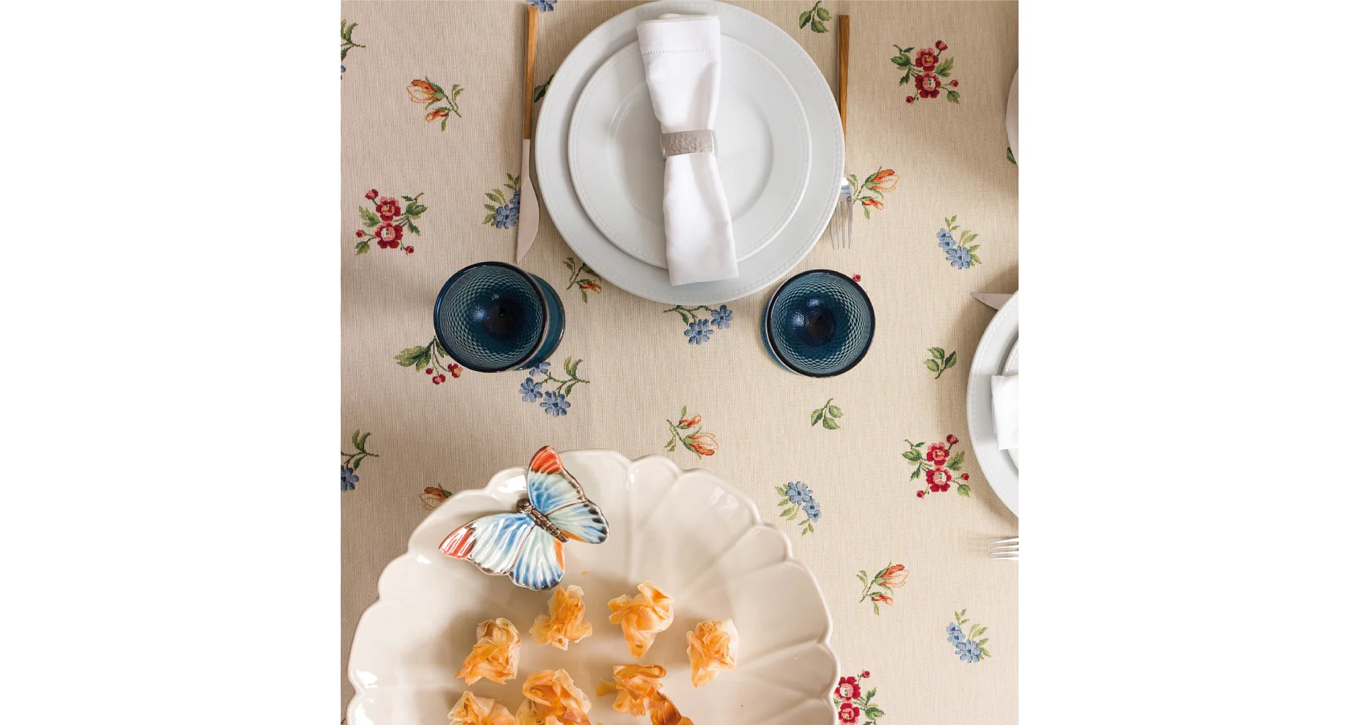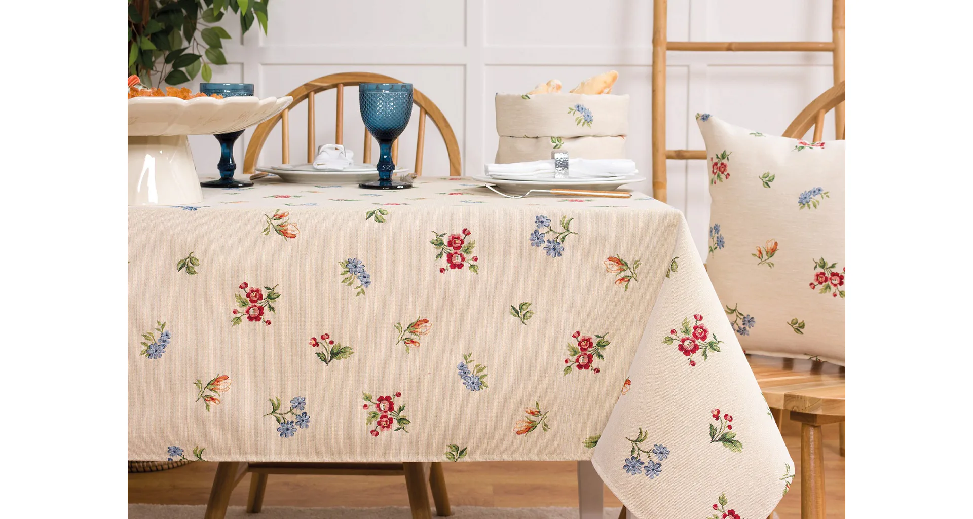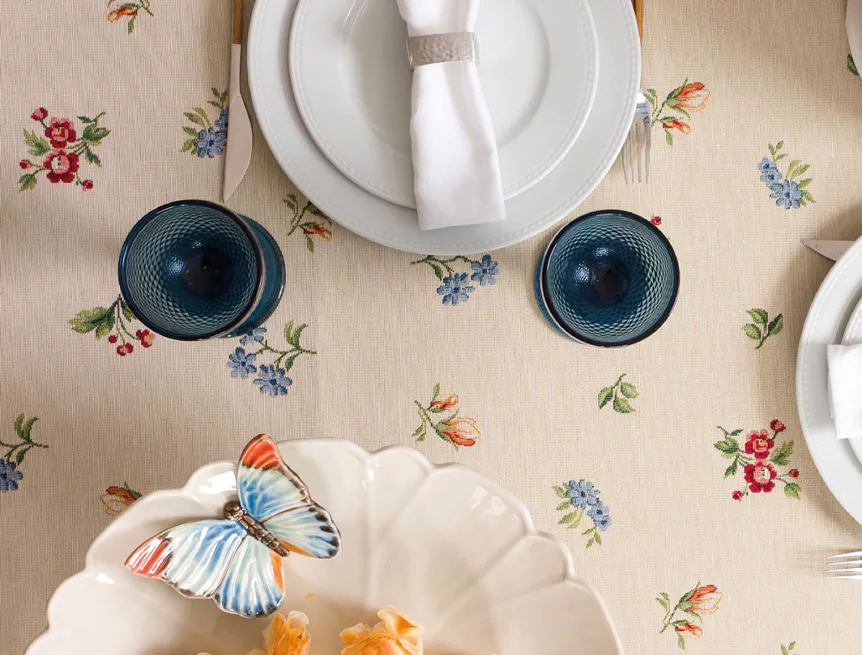 Obrus Floweret s drobnými kvetmi je ideálny doplnok pre každú príležitosť. Jemný design s rustikálnym nádychom sa spája s praktickosťou vďaka pevnému a odolnému materiálu.