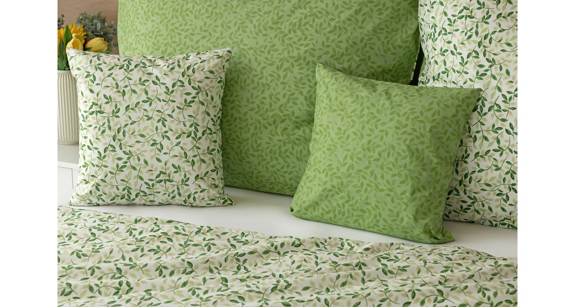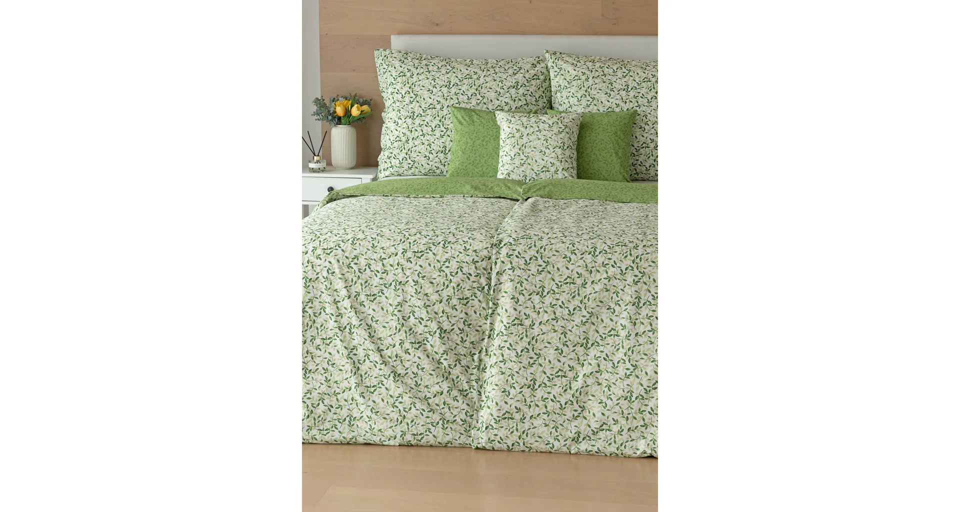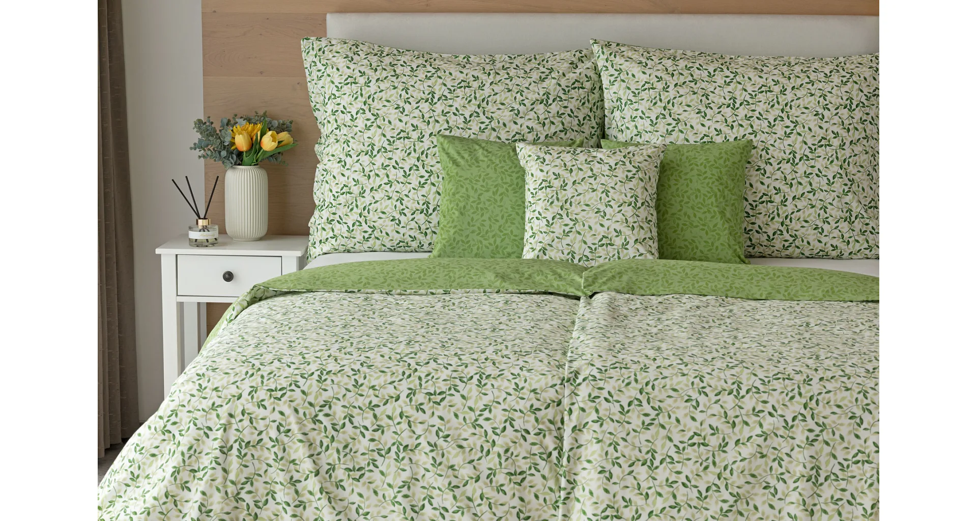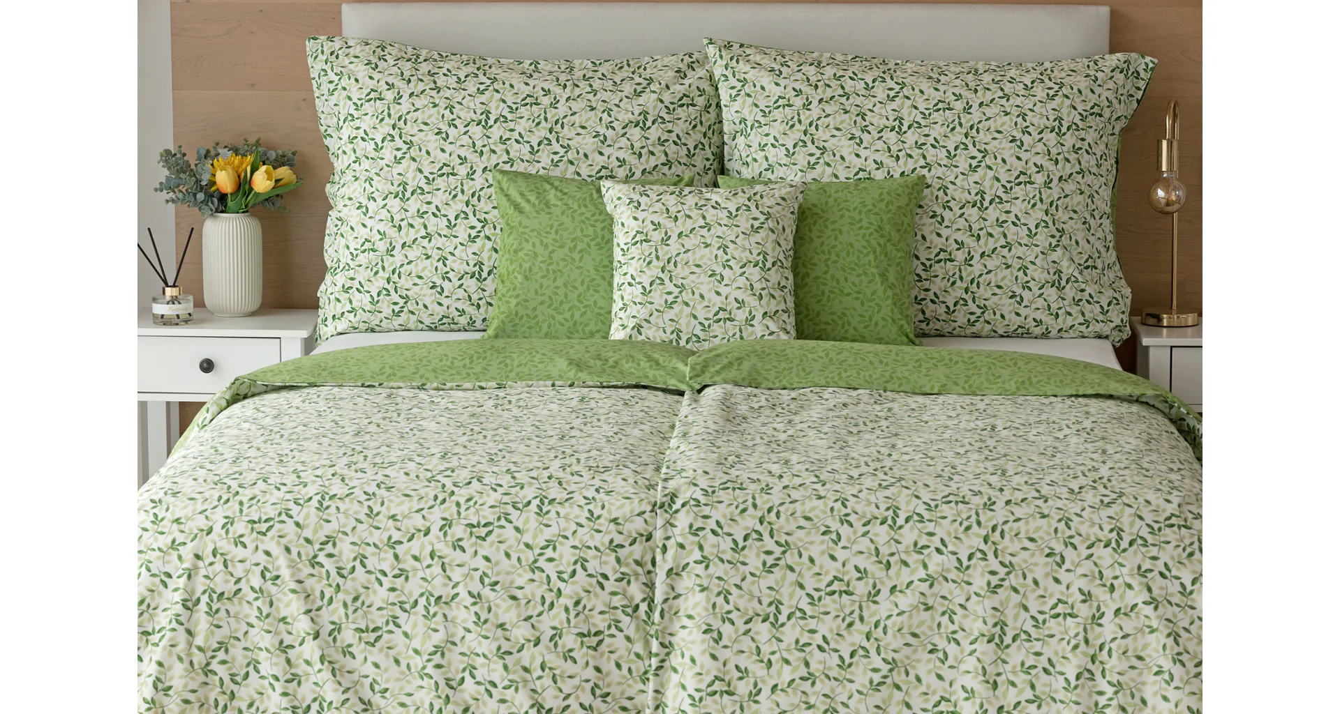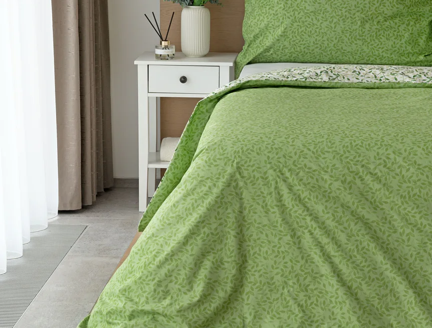 Pozvite si do spálne sviežu jarnú atmosféru s bavlnenými obliečkami Gala. Nenápadný motív drobných lístočkov v palete zelených a šedozelených tónov vyniká z jednej strany na bielom podklade, druhú stranu zdobí motív tmavších zelených lístkov na atraktívnom zelenom podklade. Vďaka tomuto obojstrannému prevedeniu môžete pri stlaní hravo experimentovať!